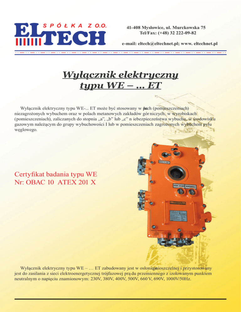 41-408 Mysłowice, ul. Murckowska 75 Tel/Fax: (+48) 32 222-09-82 e-mail: [email protected]; www. eltechnet.pl Wyłącznik elektryczny typu WE – ... ET Wyłącznik elektryczny typu WE-... ET może być stosowany w po lach (pomieszczeniach) niezagrożonych wybuchem oraz w polach metanowych zakładów gór niczych, w wyrobiskach (pomieszczeniach), zaliczanych do stopnia „a”, „b” lub „c” n iebezpieczeństwa wybuchu, w środowisku gazowym należącym do grupy wybuchowości I lub w pomieszczeniach zagrożonych wybuchem pyłu węglowego. Certyfikat badania typu WE Nr: OBAC 10 ATEX 201 X Wyłącznik elektryczny typu WE – … ET zabudowany jest w osłoniegnioszczelnej o i przystosowany jest do zasilania z sieci elektroenergetycznej trójfazowej prą du przemiennego z izolowanym punktem neutralnym o napięciu znamionowym: 230V, 380V, 400V, 500V, 660 V, 690V, 1000V/50Hz. ELTECH W zalezności od wersji wykonania wyłącznik może być jednoodpływowym, dwuodpływowym lub rewersyjnym i służyć do zasilania różnego rodzaju urządzeń np. agregatów sprężarkowych, tam wentylacyjnych i innych. Dane techniczne: napięcie zasilania prąd odpływu lub odpływów wilgotność względna powietrza stopień ochrony temperatura otoczenia wymiary gabarytowe (szer x wys x gł) masa symbol urządzenia 3 x 230V ÷ 3 x 1000V do 37A - w zależności od wersji wykonania do 95 % IP 54 0°C ÷ +40°C 300 x 600 x 250 mm 70 kg I M1 Ex d ia I Dodatkowe informacje można uzyskać pod nr Tel/Fax: (+48) 32 222-09-82 Zamówienia prosimy składać na adres: 41-408 Mysłowice, ul. Murckowska 75 10.2014