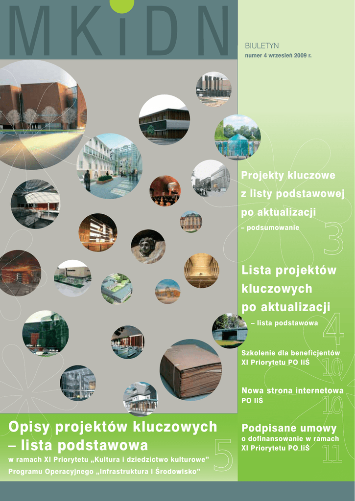 1 numer 4 wrzesień 2009 r. Projekty kluczowe z listy podstawowej po aktualizacji – podsumowanie 3 Lista projektów kluczowych po aktualizacji – lista podstawowa 4 Szkolenie dla beneficjentów XI Priorytetu PO IiŚ 10 Nowa strona internetowa PO IiŚ Opisy projektów kluczowych – lista podstawowa w ramach XI Priorytetu „Kultura i dziedzictwo kulturowe” Programu Operacyjnego „Infrastruktura i Środowisko” 5 10 Podpisane umowy o dofinansowanie w ramach XI Priorytetu PO IiŚ 11 2 Instytucja Pośrednicząca Instytucja Wdrażająca Zespół redakcyjny Departament Funduszy Europejskich Ministerstwo Kultury i Dziedzictwa Narodowego ul. Krakowskie Przedmieście 15/17 00-071 Warszawa tel. 22 42 10 302 fax 22 42 10 190 email: [email protected] www.poiis.mkidn.gov.pl Władza Wdrażająca Programy Europejskie ul. Wspólna 2/4, IV piętro 00-926 Warszawa tel. 22 461 87 39 tel. 22 461 86 58 fax 22 461 87 22 email: [email protected] www.wwpe.gov.pl Karolina Tylus-Sowa Krzysztof Adamczyk Piotr Giemza Monika Krzyżanowska-Piróg Przemysław Niedźwiecki Aneta Norek Agnieszka Prusińska Mariusz Pulikowski Aleksandra Skierkowska Marcin Skrycki Katarzyna Stasiaczek Patrycja Surowiec Marek Szladowski Edyta Tarasek-Wojciechowska EGZEMPLARZ BEZPŁATNY biuletyn MKiDN Numer 4 wrzesień 2009 3 Projekty kluczowe z listy podstawowej po aktualizacji – podsumowanie XI Priorytet „Kultura i dziedzictwo kulturowe” Programu Operacyjnego „Infrastruktura i Środowisko” Rodzaje beneficjentów W ramach aktualizacji listy projektów indywidualnych natomiast kwota dofinansowania to 0,17 mld zł. wpłynęło 86 propozycji projektów na kwotę 2,98 mld zł W ramach projektów wyłonionych w trybie indywi- z EFRR (kwota całkowita wyniosła 3,89 mld zł). W dniu dualnym najwięcej wniosków rekomendowano w ra- nansowania najliczniejszą grupę beneficjentów sta- 31 lipca 2009 r. Ministerstwo Rozwoju Regionalnego mach Działania 11.2. Rozwój oraz poprawa stanu in- nowiły publiczne instytucje kultury (łączny ich udział ogłosiło listę projektów indywidualnych, uwzględniają- frastruktury kultury o znaczeniu ponadregionalnym - 9 wyniósł 42%, tj. 10 wnioskodawców) oraz jednostki cą dokonaną aktualizację. Znalazły się na niej 24 inwe- (co stanowiło 37,5% wszystkich wniosków wybranych samorządu terytorialnego, których udział wyniósł 29% stycje w ramach XI Priorytetu PO IiŚ o łącznej wartości do dofinansowania). Wartość całkowita projektów wy- (tj. 7 projektów). Uczelnie i szkoły artystyczne były całkowitej około 2 mld zł. Łączna kwota dofinansowa- niosła 1,5 mld zł, zaś wnioskowana wartość dofinan- reprezentowane przez 25% wnioskodawców (tj. 6 pro- nia z EFRR wynosi 1,21 mld zł. sowania 0,84 mld zł. Z Działania 11.3. Infrastruktura jektów), zaś kościoły i związki wyznaniowe były repre- W ramach Działania 11.1. Ochrona i zachowanie dzie- szkolnictwa artystycznego rekomendowano 7 wnio- zentowane przez 4% wnioskodawców (tj. 1 projekt). dzictwa kulturowego o znaczeniu ponadregionalnym sków (co przekłada się na 29% aplikacji wybranych do rekomendowano 8 wniosków (co daje 33% projektów dofinansowania). Wartość całkowita projektów wynio- wybranych do dofinansowania). Wartość całkowi- sła 0,26 mld zł, a wartość całkowita projektu wyniosła ta projektów z tego Działania wyniosła 0,28 mld zł, 0,2 mld zł. Koszty całkowite oraz kwoty dofinansowania z EFRR wniosków rekomendowanych do dofinansowania w podziale na działania Rodzaj działania Ilość wniosków Działanie 11.1. Ochrona i zachowanie dziedzictwa kulturowego o znaczeniu ponadregionalnym 8 Wartość całkowita projektów (w mld zł) Wnioskowana wartość dofinansowania z EFRR (w mld zł) 0,28 0,17 Działanie 11.2. Rozwój oraz poprawa stanu infrastruktury kultury o znaczeniu ponadregionalnym 9 1,5 0,84 Działanie 11.3. Infrastruktura szkolnictwa artystycznego 7 0,26 0,20 Suma 24 2,04 1,21 Wśród projektów kluczowych wybranych do dofi- Podział wniosków rekomendowanych do dofinansowania wg typu wnioskodawcy 4% 25% 42% 29% Źródło: opracowanie własne DFE, MKiDN (stan na dzień 30.09.2009 r.) publiczne instytucje kultury uczelnie i szkoły artystyczne jednostki samorządu terytorialnego kościoły i związki wyznaniowe Źródło: opracowanie własne DFE, MKiDN Skąd pochodzili beneficjenci? O jakie sumy aplikowali beneficjenci? Wśród projektów kluczowych wybranych do dofinan- Średnia kwota dofinansowania projektów rekomendo- ficjenci Działania 11.3. Infrastruktura szkolnictwa sowania najliczniejsza grupa beneficjentów pocho- wanych do wsparcia w ramach projektów indywidu- artystycznego otrzymali średnią kwotę dofinansowa- dziła z województwa mazowieckiego – 4. Po 3 pro- alnych wyniosła 50 mln zł. Najwyższą średnią kwotę nia 28 mln zł. jekty zostały wybrane z województw: dolnośląskiego, dofinansowania – 93,8 mln zł – otrzymali beneficjenci lubelskiego, małopolskiego, podlaskiego i śląskiego. Działania 11.2. Rozwój oraz poprawa stanu infra- 2 projekty zostały wybrane z województwa pomorskie- struktury kultury o znaczeniu ponadregionalnym, zaś go, po jednym projekcie z województw opolskiego, najniższą kwotę – 20,7 mln zł – otrzymali beneficjen- świętokrzyskiego i wielkopolskiego. ci Działania 11.1. Ochrona i zachowanie dziedzictwa Podział beneficjentów kluczowych wg województw 4 3 2 1 0 Źródło: opracowanie własne DFE, MKiDN kulturowego o znaczeniu ponadregionalnym. Bene- Nazwa działania Średnia wnioskowana kwota dofinansowania z EFRR (w mln zł) Działanie 11.1. Ochrona i zachowanie dziedzictwa kulturowego o znaczeniu ponadregionalnym 20,7 Działanie 11.2. Rozwój oraz poprawa stanu infrastruktury kultury o znaczeniu ponadregionalnym 93,8 Działanie 11.3. Infrastruktura szkolnictwa artystycznego 28 Średnia kwota dofinansowania w konkursie 501 Źródło: opracowanie własne DFE, MKiDN 1 Średnia wyliczona na podstawie wszystk