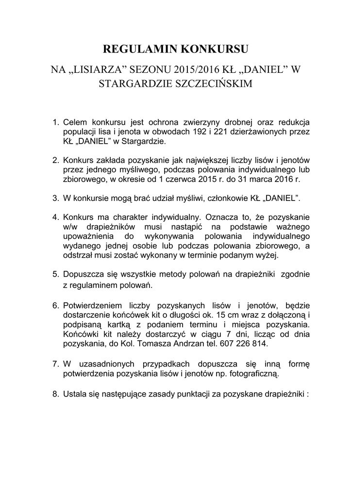REGULAMIN KONKURSU NA „LISIARZA” SEZONU 2015/2016 KŁ „DANIEL” W STARGARDZIE SZCZECIŃSKIM 1. Celem konkursu jest ochrona zwierzyny drobnej oraz redukcja populacji lisa i jenota w obwodach 192 i 221 dzierżawionych przez KŁ „DANIEL” w Stargardzie. 2. Konkurs zakłada pozyskanie jak największej liczby lisów i jenotów przez jednego myśliwego, podczas polowania indywidualnego lub zbiorowego, w okresie od 1 czerwca 2015 r. do 31 marca 2016 r. 3. W konkursie mogą brać udział myśliwi, członkowie KŁ „DANIEL”. 4. Konkurs ma charakter indywidualny. Oznacza to, że pozyskanie w/w drapieżników musi nastąpić na podstawie ważnego upoważnienia do wykonywania polowania indywidualnego wydanego jednej osobie lub podczas polowania zbiorowego, a odstrzał musi zostać wykonany w terminie podanym wyżej. 5. Dopuszcza się wszystkie metody polowań na drapieżniki zgodnie z regulaminem polowań. 6. Potwierdzeniem liczby pozyskanych lisów i jenotów, będzie dostarczenie końcówek kit o długości ok. 15 cm wraz z dołączoną i podpisaną kartką z podaniem terminu i miejsca pozyskania. Końcówki kit należy dostarczyć w ciągu 7 dni, licząc od dnia pozyskania, do Kol. Tomasza Andrzan tel. 607 226 814. 7. W uzasadnionych przypadkach dopuszcza się inną formę potwierdzenia pozyskania lisów i jenotów np. fotograficzną. 8. Ustala się następujące zasady punktacji za pozyskane drapieżniki : Lp. Wyszczególnienie 1 2 Za każdego pozyskanego lisa lub jenota Za każdą czaszkę - trofeum medalowe z lisa lub jenota Ilość punktów +1 +10 9. Rozstrzygnięcia konkursu dokona komisja w składzie: 1. Tomasz Andrzan – Przewodniczący komisji 2. Jerzy Kozłowski – Członek komisji 3. Grzegorz Krasucki – Członek komisji 10. W przypadku zdobycia takiej samej ilości punktów wygrywa myśliwy, który okaże spreparowaną czaszkę lisa lub jenota, która zostanie poddana wycenie i osiągnie więcej punktów CIC. Dlatego też w przypadku pozyskania drapieżników zaleca się preparację trofeum, w celu ewentualnego przedstawienia komisji konkursowej. 11. Od ustaleń komisji konkursowej nie przysługuje odwołanie. 12. Myśliwy który zdobędzie największą liczbę punktów otrzyma tytuł „Lisiarza sezonu 2015/2016 KŁ DANIEL” oraz bon towarowy na kwotę 500,- zł do wykorzystania w sklepie myśliwskim OSTOJA w Stargardzie. Możliwe zwiększenie puli nagród. 13. Uroczyste wręczenie nagród Zgromadzeniu Członków Koła. nastąpi na Walnym 14. Regulamin i wynik konkursu zostaną wywieszone w miejscu wyłożenia książki pobytu myśliwych na polowaniu indywidualnym oraz udostępnione będą na stronie internetowej Koła. Przez cały czas trwania konkursu zmagania uczestników na bieżąco publikowane będą na stronie internetowej Koła.