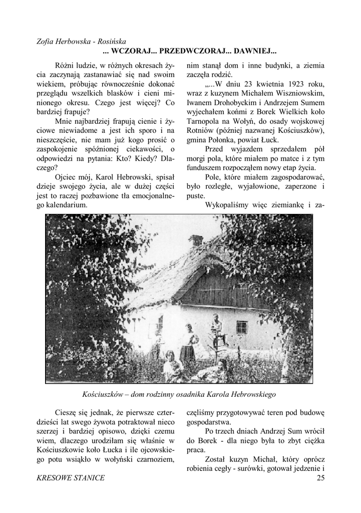 Zofia Herbowska - Rosińska ... WCZORAJ... PRZEDWCZORAJ... DAWNIEJ... Różni ludzie, w różnych okresach życia zaczynają zastanawiać się nad swoim wiekiem, próbując równocześnie dokonać przeglądu wszelkich blasków i cieni minionego okresu. Czego jest więcej? Co bardziej frapuje? Mnie najbardziej frapują cienie i życiowe niewiadome a jest ich sporo i na nieszczęście, nie mam już kogo prosić o zaspokojenie spóźnionej ciekawości, o odpowiedzi na pytania: Kto? Kiedy? Dlaczego? Ojciec mój, Karol Hebrowski, spisał dzieje swojego życia, ale w dużej części jest to raczej pozbawione tła emocjonalnego kalendarium. nim stanął dom i inne budynki, a ziemia zaczęła rodzić. „...W dniu 23 kwietnia 1923 roku, wraz z kuzynem Michałem Wiszniowskim, Iwanem Drohobyckim i Andrzejem Sumem wyjechałem końmi z Borek Wielkich koło Tarnopola na Wołyń, do osady wojskowej Rotniów (później nazwanej Kościuszków), gmina Połonka, powiat Łuck. Przed wyjazdem sprzedałem pół morgi pola, które miałem po matce i z tym funduszem rozpocząłem nowy etap życia. Pole, które miałem zagospodarować, było rozległe, wyjałowione, zaperzone i puste. Wykopaliśmy więc ziemiankę i za- Kościuszków – dom rodzinny osadnika Karola Hebrowskiego Cieszę się jednak, że pierwsze czterdzieści lat swego żywota potraktował nieco szerzej i bardziej opisowo, dzięki czemu wiem, dlaczego urodziłam się właśnie w Kościuszkowie koło Łucka i ile ojcowskiego potu wsiąkło w wołyński czarnoziem, KRESOWE STANICE częliśmy przygotowywać teren pod budowę gospodarstwa. Po trzech dniach Andrzej Sum wrócił do Borek - dla niego była to zbyt ciężka praca. Został kuzyn Michał, który oprócz robienia cegły - surówki, gotował jedzenie i 25 prał bieliznę; Iwan - wyrabiający cegły i ja z końmi na polu. Początek był bardzo ciężki, zwłaszcza po wyczerpaniu skromnego zapasu gotówki, braku ptactwa domowego, zwierząt hodowlanych i innych środków do życia. Dopiero w lipcu, kiedy odebrałem od chłopów część spółki z zasianej lnianki i żyta, omłóciłem cepami ziarno, z lnianki zrobiłem olej, a z żyta mąkę, było wreszcie pierwsze własne jedzenie - własny chleb i kluski żytnie na oleju. Tak więc, już we wrześniu Michał z siostrą odjechali do Borek. Został Iwan z żoną i synem. Zależało mi na Iwanie, bo znał zarówno murarkę, jak i ciesielkę i dzięki niemu, już w październiku, zamieszkaliśmy w chałupie wybudowanej przez nas obydwu z cegły-surówki i pokrytej własną, żytnią słomą. Konie umieściłem na zimę w drugiej połowie chaty. Po dwóch latach zrobiłem tam kuchnię. Na Boże Narodzenie pojechałem do Borek, aby zobaczyć syna, którego zosta- Karol Hebrowski na żniwiarce W sierpniu otrzymałem ze Związku Osadników zapomogę w wysokości 4 milionów marek polskich, za które kupiłem od Niemca stodołę drewnianą o wymiarach 10m x 6m. Zamieszkaliśmy w niej. Wreszcie było trochę jaśniej i przestronniej niż w ziemiance. Iwan sprowadził swoją żonę z dwuletnim synem, a Michał siostrę, również z synem - trzyletnim. Kobiety jednak nie potrafiły zgodnie mieszkać pod jednym dachem - każda chciała rządzić. 26 wiłem u teściów. Miałem też nadzieję, że teściowa zechce mi nieco pomóc finansowo z należnej części majątku po mojej zmarłej żonie, ale skończyło się na radzie, abym ożenił się po raz drugi, to będzie mi lżej gospodarzyć... (...) Tak więc z początkiem stycznia 1924 roku, pożegnałem synka i wyjechałem do Kościuszkowa, gdzie na wiosnę znowu wziąłem się z Iwanem do robienia cegły na oborę z chlewnią i komórką, które pokryliśmy blachą. Mogłem już myśleć o jakichś zwierzętach gospodarskich, a na zboże KRESOWE STANICE miałem komórkę. Iwan kupił krowę, więc mieliśmy mleko, a na jesieni zacząłem na obszarze 0,5 ha zakładać sad owocowy. Dookoła sadu posadziłem różne drzewa liściaste i dzikie czereśnie z lasu, a aleję z podwórka do traktu wysadziłem brzozami. Kawał najcięższej roboty było za nami. skie. Kupiłem młocarnię z kieratem i wialnią, a w 1928 roku żniwiarkę skrzydłową. 2 lutego 1929 roku ożeniłem się powtórnie z Marią Matkowską, o 11 lat młodszą ode mnie półsierotą, wychowywaną od dziewiątego roku życia przez dziadków i ojca w Horodyszczach. Ślub nasz Dom ludowy „WIARUS” w Kościuszkowie. W swoich podwojach mieścił szkołę powszechną Na wiosnę 1925 roku sprowadziłem z Borek moją najmłodszą siostrę Franię i mojego syna, któremu dziadkowie (moi teściowie) dali pieniądze na krowę, z której dochowałem się do 1939 roku 6 krów, kilka jałówek i cielaków. Cielaki sprzedawałem i kupowałem świnie, owce i różny drób. Iwan z żoną i synem odjechali do Smykowicz. W jesieni 1927 roku mój syn zaczął chodzić do szkoły w Anatolii, a ja nadal mozolnie powiększałem zasoby gospodarKRESOWE STANICE odbył się w katedrze w Łucku. Była bardzo dobrą i czułą matką dla mego syna. Kilka miesięcy po naszym ślubie odjechała do Borek moja siostra. Aby odwdzięczyć się Frani za pobyt i pracę zrzekłem się, na jej dobro, z należnej mi części ojcowizny w Borkach Wielkich. W roku 1930 zostałem prezesem Kółka Rolniczego i skarbnikiem budowy Domu Ludowego, w którym mieściła się później szkoła i sklep. Byłem też, aż do wybuchu wojny członkiem rady nadzorczej i przewodniczącym komisji rewizyjnej w mleczarni w Ławrowie. (...) 27 20 września 1936 roku znów zostałem ojcem - żona urodziła córkę Zofię, której chrzest odbył się w kościele parafialnym w Nieświerzu, a chrzestnymi rodzicami byli: mój najstarszy brat Antoni prawnik z Warszawy i sąsiadka - osadniczka z Kościuszkowa, pani Chumkowa. W marcu 1939 roku zostałem radnym w gminie Połonka, a 15 sierpnia tegoż roku powołano mnie jako rezerwistę do wojska do 24 p.p. w Łucku. Miało to być pospolite ruszenie na