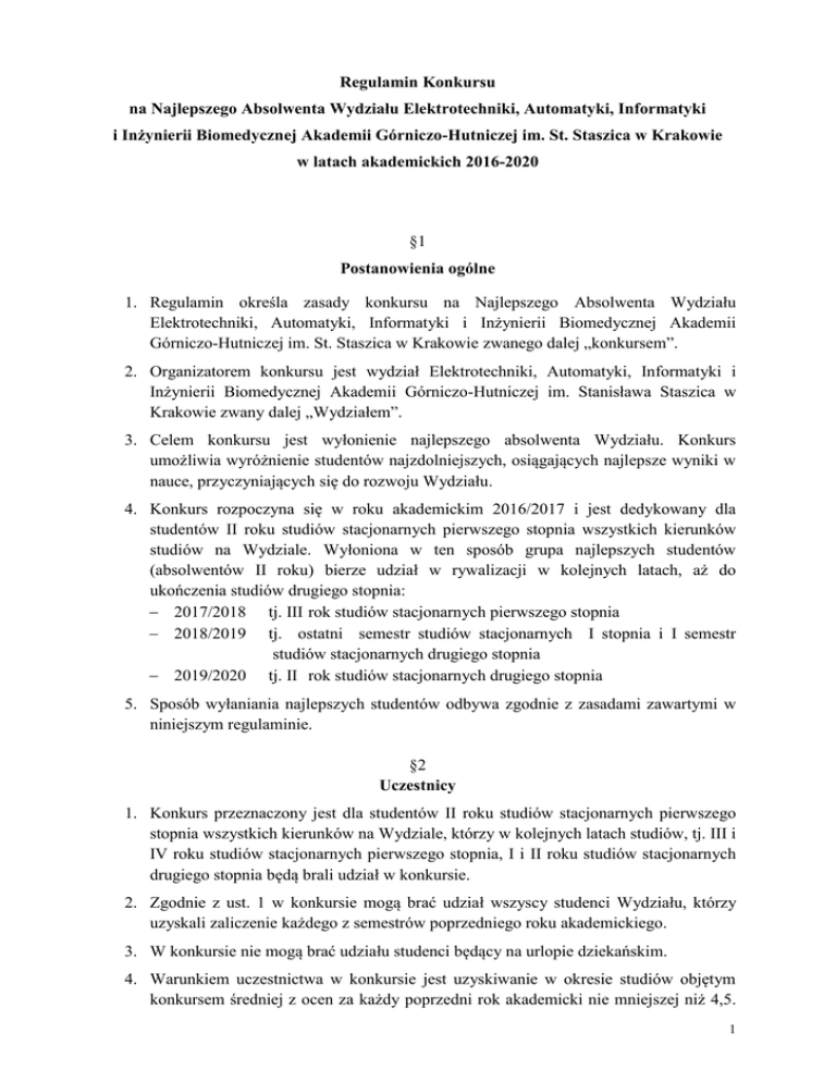Regulamin Konkursu na Najlepszego Absolwenta Wydziału Elektrotechniki, Automatyki, Informatyki i Inżynierii Biomedycznej Akademii Górniczo-Hutniczej im. St. Staszica w Krakowie w latach akademickich 2016-2020 §1 Postanowienia ogólne 1. Regulamin określa zasady konkursu na Najlepszego Absolwenta Wydziału Elektrotechniki, Automatyki, Informatyki i Inżynierii Biomedycznej Akademii Górniczo-Hutniczej im. St. Staszica w Krakowie zwanego dalej „konkursem”. 2. Organizatorem konkursu jest wydział Elektrotechniki, Automatyki, Informatyki i Inżynierii Biomedycznej Akademii Górniczo-Hutniczej im. Stanisława Staszica w Krakowie zwany dalej „Wydziałem”. 3. Celem konkursu jest wyłonienie najlepszego absolwenta Wydziału. Konkurs umożliwia wyróżnienie studentów najzdolniejszych, osiągających najlepsze wyniki w nauce, przyczyniających się do rozwoju Wydziału. 4. Konkurs rozpoczyna się w roku akademickim 2016/2017 i jest dedykowany dla studentów II roku studiów stacjonarnych pierwszego stopnia wszystkich kierunków studiów na Wydziale. Wyłoniona w ten sposób grupa najlepszych studentów (absolwentów II roku) bierze udział w rywalizacji w kolejnych latach, aż do ukończenia studiów drugiego stopnia: 2017/2018 tj. III rok studiów stacjonarnych pierwszego stopnia 2018/2019 tj. ostatni semestr studiów stacjonarnych I stopnia i I semestr studiów stacjonarnych drugiego stopnia 2019/2020 tj. II rok studiów stacjonarnych drugiego stopnia 5. Sposób wyłaniania najlepszych studentów odbywa zgodnie z zasadami zawartymi w niniejszym regulaminie. §2 Uczestnicy 1. Konkurs przeznaczony jest dla studentów II roku studiów stacjonarnych pierwszego stopnia wszystkich kierunków na Wydziale, którzy w kolejnych latach studiów, tj. III i IV roku studiów stacjonarnych pierwszego stopnia, I i II roku studiów stacjonarnych drugiego stopnia będą brali udział w konkursie. 2. Zgodnie z ust. 1 w konkursie mogą brać udział wszyscy studenci Wydziału, którzy uzyskali zaliczenie każdego z semestrów poprzedniego roku akademickiego. 3. W konkursie nie mogą brać udziału studenci będący na urlopie dziekańskim. 4. Warunkiem uczestnictwa w konkursie jest uzyskiwanie w okresie studiów objętym konkursem średniej z ocen za każdy poprzedni rok akademicki nie mniejszej niż 4,5. 1 Nie uzyskanie przez uczestnika w/w średniej z ocen, na którymkolwiek z okresów studiów objętych konkursem, skutkuje wyeliminowaniem z dalszego uczestnictwa w konkursie. 5. Z konkursu wykluczeni są studenci będący członkami Komisji Konkursowej, bądź współorganizujący konkurs. §3 Zgłoszenia 1. Zgłoszenie do konkursu następuje poprzez poprawne wypełnienie i wysłanie formularza zgłoszeniowego, który znajduje się na stronie internetowej Wydziału (www.eaiib.agh.edu.pl/konkurs-na-najlepszego-absolwenta). 2. Kandydaci do konkursu zgłaszają się samodzielnie. §4 Przebieg konkursu 1. Zgłoszenie kandydatów: dokonuje się w trybie opisanym w §3 niniejszego regulaminu. 2. Dostarczenie do dziekanatu dokumentów potwierdzających osiągnięcia kandydata w okresie objętym konkursem (termin: do 15 września każdego roku akademickiego). 3. Wybór przez Komisję Konkursową najlepszego studenta spośród wszystkich studentów, którzy dostarczyli wymagane dokumenty (termin do 30 września każdego roku akademickiego) 4. Organizatorzy konkursu zastrzegają sobie prawo zmiany powyższego harmonogramu konkursu. §5 Komisja Konkursowa Komisja Konkursowa zostaje powołana przez Dziekana wydziału Elektrotechniki, Automatyki, Informatyki i Inżynierii Biomedycznej (EAIiIB) Akademii Górniczo-Hutniczej im. St. Staszica w Krakowie. W skład Komisji Konkursowej wchodzą: Prodziekan Wydziału EAIiIB ds. kształcenia, Przedstawiciel Wydziałowej Rady Samorządu Studentów wydziału EAIiIB, Przedstawiciel fundatora nagrody Firmy PHIE Intermed Eugeniusz Grolewski, Sekretarz wyznaczony przez Dziekana Wydziału EAIiIB. §6 Zasady oceniania 1. W konkursie ocenianie są osiągnięcia za następujące okresy studiów: 2 od 1.10.2016 do 30.09.2017 (tj. 3 i 4 semestr studiów stacjonarnych pierwszego stopnia), od 1.10.2017 do 30.09.2018 (tj. 5 i 6 semestr studiów stacjonarnych pierwszego stopnia), od 1.10.2018 do 30.09.2019 (tj. 7. semestr studiów stacjonarnych pierwszego stopnia oraz 1. semestr studiów stacjonarnych drugiego stopnia), od 1.10.2019 do 30.09.2020 (tj. 3 i 4 semestr studiów stacjonarnych drugiego stopnia), 2. Przyjmuje się następujące kryteria oceny: Kryterium wyników w nauce – waga 90% jest to średnia ocen wyliczana zgodnie z Regulaminem Studiów uzyskana w obu semestrach poprzedniego roku akademickiego, przy czym średnią z każdego z ww. semestrów uwzględnia się w kryterium naukowym z wagą 50%, Kryterium czynnego udziału w Kołach Naukowych – waga 5% wymagane potwierdzenie członkostwa w Kole Naukowym w danym roku oraz potwierdzone przynajmniej jedno wystąpienie na sesji naukowej w danym roku bądź przynajmniej jedna publikacja w danym roku, Kryterium udziału w życiu sportowym lub kulturalnym – waga 5% pod uwagę będą brane następujące osiągnięcia w danym roku: nagrody w konkursach o zasięgu krajowym lub międzynarodowym; udział w projektach artystycznych i/lub sportowych prowadzonych przez uczelnię lub we współpracy z innym ośrodkiem akademickim lub kulturalnym lub sportowym; autorstwo lub współautorstwo dzieła artystycznego, w tym plastyczne, muzyczne, teatralne, o krajowym lub międzynarodowym znaczeniu. 3. Wszystkie osiągnięcia studentów biorących udział w konkursie muszą być odpowiednio udokumentowane: kserokopie odpowiednich dokumentów, dyplomów; potwierdzenie wystąpienia na sesji naukowej; potwierdzenie publikacji; potwierdzenia pisemne profesorów, opiekunów kół, zarządów organizacji. §7 Sposób oceniania Komisja Konkursowa ocenia i przyznaje punkty kolegialnie każdemu kandydatowi z osobna. Komisja Konkursowa celem wytypow