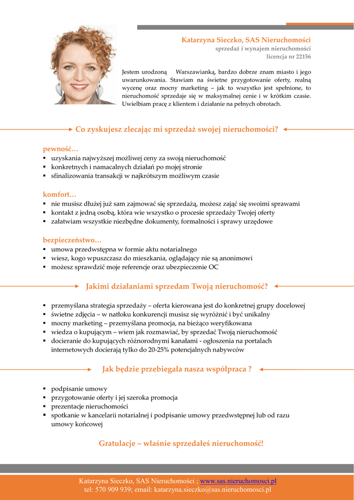 Katarzyna Sieczko, SAS Nieruchomości sprzedaż i wynajem nieruchomości licencja nr 22156 Jestem urodzoną Warszawianką, bardzo dobrze znam miasto i jego uwarunkowania. Stawiam na świetne przygotowanie oferty, realną wycenę oraz mocny marketing – jak to wszystko jest spełnione, to nieruchomość sprzedaje się w maksymalnej cenie i w krótkim czasie. Uwielbiam pracę z klientem i działanie na pełnych obrotach. Co zyskujesz zlecając mi sprzedaż swojej nieruchomości? pewność… uzyskania najwyższej możliwej ceny za swoją nieruchomość konkretnych i namacalnych działań po mojej stronie sfinalizowania transakcji w najkrótszym możliwym czasie komfort… nie musisz dłużej już sam zajmować się sprzedażą, możesz zająć się swoimi sprawami kontakt z jedną osobą, która wie wszystko o procesie sprzedaży Twojej oferty załatwiam wszystkie niezbędne dokumenty, formalności i sprawy urzędowe bezpieczeństwo… umowa przedwstępna w formie aktu notarialnego wiesz, kogo wpuszczasz do mieszkania, oglądający nie są anonimowi możesz sprawdzić moje referencje oraz ubezpieczenie OC Jakimi działaniami sprzedam Twoją nieruchomość? przemyślana strategia sprzedaży – oferta kierowana jest do konkretnej grupy docelowej świetne zdjęcia – w natłoku konkurencji musisz się wyróżnić i być unikalny mocny marketing – przemyślana promocja, na bieżąco weryfikowana wiedza o kupującym – wiem jak rozmawiać, by sprzedać Twoją nieruchomość docieranie do kupujących różnorodnymi kanałami - ogłoszenia na portalach internetowych docierają tylko do 20-25% potencjalnych nabywców Jak będzie przebiegała nasza współpraca ? podpisanie umowy przygotowanie oferty i jej szeroka promocja prezentacje nieruchomości spotkanie w kancelarii notarialnej i podpisanie umowy przedwstępnej lub od razu umowy końcowej Gratulacje – właśnie sprzedałeś nieruchomość! Katarzyna Sieczko, SAS Nieruchomości ; www.sas.nieruchomosci.pl tel: 570 909 939; email: [email protected]
