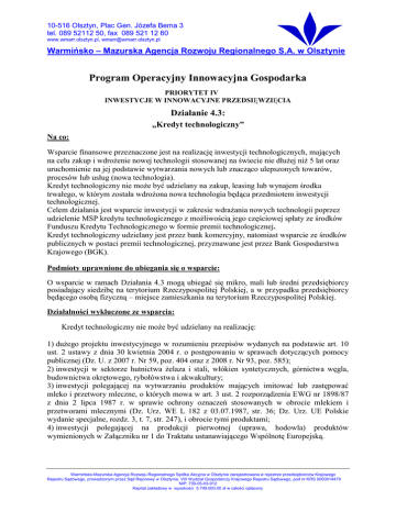 10-516 Olsztyn, Plac Gen. Józefa Bema 3 tel. 089 52112 50, fax 089 521 12 60 www.wmarr.olsztyn.pl, [email protected] Warmińsko – Mazurska Agencja Rozwoju Regionalnego S.A. w Olsztynie Program Operacyjny Innowacyjna Gospodarka PRIORYTET IV INWESTYCJE W INNOWACYJNE PRZEDSIĘWZIĘCIA Działanie 4.3: „Kredyt technologiczny” Na co: Wsparcie finansowe przeznaczone jest na realizację inwestycji technologicznych, mających na celu zakup i wdrożenie nowej technologii stosowanej na świecie nie dłużej niż 5 lat oraz uruchomienie na jej podstawie wytwarzania nowych lub znacząco ulepszonych towarów, procesów lub usług (nowa technologia). Kredyt technologiczny nie może być udzielany na zakup, leasing lub wynajem środka trwałego, w którym została wdrożona nowa technologia będąca przedmiotem inwestycji technologicznej. Celem działania jest wsparcie inwestycji w zakresie wdrażania nowych technologii poprzez udzielenie MSP kredytu technologicznego z możliwością jego częściowej spłaty ze środków Funduszu Kredytu Technologicznego w formie premii technologicznej. Kredyt technologiczny udzielany jest przez bank komercyjny, natomiast wsparcie ze środków publicznych w postaci premii technologicznej, przyznawane jest przez Bank Gospodarstwa Krajowego (BGK). Podmioty uprawnione do ubiegania się o wsparcie: O wsparcie w ramach Działania 4.3 mogą ubiegać się mikro, mali lub średni przedsiębiorcy posiadający siedzibę na terytorium Rzeczypospolitej Polskiej, a w przypadku przedsiębiorcy będącego osobą fizyczną – miejsce zamieszkania na terytorium Rzeczypospolitej Polskiej. Działalności wykluczone ze wsparcia: Kredyt technologiczny nie może być udzielany na realizację: 1) dużego projektu inwestycyjnego w rozumieniu przepisów wydanych na podstawie art. 10 ust. 2 ustawy z dnia 30 kwietnia 2004 r. o postępowaniu w sprawach dotyczących pomocy publicznej (Dz. U. z 2007 r. Nr 59, poz. 404 oraz z 2008 r. Nr 93, poz. 585); 2) inwestycji w sektorze hutnictwa żelaza i stali, włókien syntetycznych, górnictwa węgla, budownictwa okrętowego, rybołówstwa i akwakultury; 3) inwestycji polegającej na wytwarzaniu produktów mających imitować lub zastępować mleko i przetwory mleczne, o których mowa w art. 3 ust. 2 rozporządzenia EWG nr 1898/87 z dnia 2 lipca 1987 r. w sprawie ochrony oznaczeń stosowanych w obrocie mlekiem i przetworami mlecznymi (Dz. Urz. WE L 182 z 03.07.1987, str. 36; Dz. Urz. UE Polskie wydanie specjalne, rozdz. 3, t. 7, str. 247), i obrocie tymi produktami; 4) inwestycji polegającej na produkcji pierwotnej (uprawa, hodowla) produktów wymienionych w Załączniku nr 1 do Traktatu ustanawiającego Wspólnotę Europejską. Warmińsko-Mazurska Agencja Rozwoju Regionalnego Spółka Akcyjna w Olsztynie zarejestrowana w rejestrze przedsiębiorców Krajowego Rejestru Sądowego, prowadzonym przez Sąd Rejonowy w Olsztynie, VIII Wydział Gospodarczy Krajowego Rejestru Sądowego, pod nr KRS 0000014479 NIP: 739-05-03-912 Kapitał zakładowy w wysokości 5.749.000,00 zł w całości opłacony Poziom i wysokość wsparcia: Maksymalne wsparcie: Wysokość premii technologicznej nie może przekroczyć kwoty 4 mln PLN. Minimalny wkład własny: Min. 25% wartości wydatków kwalifikowanych Kryteria wyboru projektów wskazane są w dokumencie „Szczegółowy opis priorytetów Programu Operacyjnego Innowacyjna Gospodarka, 2007-2013” z dnia 12 czerwca 2009 r. oraz w ustawie z dnia 30 maja 2008 r. o niektórych formach wspierania działalności innowacyjnej (Dz. U. z dnia 2 lipca 2008 r.) Nabór wniosków prowadzony jest w trybie ciągłym. Bliższe informacje: Regionalny Punkt Konsultacyjny działający przy Warmińsko-Mazurskiej Agencji Rozwoju Regionalnego S.A. w Olsztynie przy Placu Gen. Józefa Bema 3 Poniedziałek – Piątek 7.30. – 15.30. Tel. 089 521 12 54 Fax 089 521 12 60 [email protected] www.wmarr.olsztyn.pl Na pytania Wnioskodawców dotyczące aplikowania o środki w ramach tego działania odpowiadają także: Lista banków współpracujących z BGK w ramach kredytu technologicznego 1. Bank BPH Spółka Akcyjna - www.bph.pl 2. BRE Bank S.A. - www.brebank.pl 3. Bank Polska Kasa Opieki S.A. - www.pekao.com.pl 4. Bank Polskiej Spółdzielczości S.A. - www.bankbps.pl 5. Powszechna Kasa Oszczędności Bank Polski S.A. - www.pkobp.pl 6. Raiffeisen Bank Polska S.A. - www.raiffeisen.pl 7. ING Bank Śląski S.A. - www.ingbank.pl 8. Bank Ochrony Środowiska S.A. - www.bosbank.pl 9. Bank Handlowy w Warszawie S.A. - www.citibank.pl 10. Gospodarczy Bank Wielkopolski - www.sgb.pl 11. Mazowiecki Bank Regionalny S.A. - www.mrbank.com.pl 12. Bank Millenium S.A. - www.millenet.pl 13. Alior Bank Spółka Akcyjna - www.aliorbank.pl/pl/ 14. Krakowski Bank Spółdzielczy - www.kbsbank.com.pl 15. DZ BANK Polska S.A. - www.dzbank.pl Warmińsko-Mazurska Agencja Rozwoju Regionalnego Spółka Akcyjna w Olsztynie zarejestrowana w rejestrze przedsiębiorców Krajowego Rejestru Sądowego, prowadzonym przez Sąd Rejonowy w Olsztynie, VIII Wydział Gospodarczy Krajowego Rejestru Sądowego, pod nr KRS 0000014479 NIP: 739-05-03-912 Kapitał zakładowy w wysokości 5.749.000,00 zł w całości opłacony _________________________________________________________________________ PKO BP SA Oddział Olsztyn 16 1020 3541 0000 5102 0014 4568 NIP 739-05-03-912