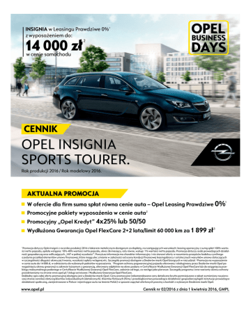 INSIGNIA w Leasingu Prawdziwe 0% 1 z wyposażeniem do: 14 000 zł 2 w cenie samochodu CENNIK OPEL INSIGNIA SPORTS TOURER. Rok produkcji 2016 / Rok modelowy 2016. AKTUALNA PROMOCJA W ofercie dla firm suma spłat równa cenie auta – Opel Leasing Prawdziwe 0% Promocyjne pakiety wyposażenia w cenie auta2 1 Promocyjny „Opel Kredyt” 4x25% lub 50/50 Wydłużona Gwarancja Opel FlexCare 2+2 lata/limit 60 000 km za 1 899 zł 3 Promocja dotyczy Opla Insignii z rocznika produkcji 2016 z lakierem metalicznym dostępnym za dopłatą, na następujących warunkach: leasing operacyjny z sumą spłat 100% wartości netto pojazdu, opłata wstępna: 10%-40% wartości netto pojazdu, okres 36 miesięcy, raty równe, wykup: 1% wartości netto pojazdu. Promocja dotyczy osób prowadzących działalność gospodarczą oraz odliczających „VAT w pełnej wysokości”. Powyższa informacja ma charakter informacyjny i nie stanowi oferty w rozumieniu przepisów kodeksu cywilnego a jedynie przykład elementów umowy finansowej, które mogą ulec zmianie w zależności od oceny kondycji finansowej leasingobiorcy i ostatecznych warunków umowy dotyczących w szczególności długości okresu jej trwania, wysokości opłaty wstępnej etc. Szczegóły promocji dostępne u Dealerów marki Opel biorących w niej udział. 2 Promocja na wyposażenie w cenie auta do 14 000 zł, w odniesieniu do wybranych pakietów wyposażenia. 3 Program ochrony pogwarancyjnej pojazdu oferowany i obsługiwany przez Dealerów marki Opel po wygaśnięciu okresu gwarancji o zakresie tożsamym z gwarancją, oferowany odpłatnie na okres podany w Certyfikacie Wydłużonej Gwarancji Opel FlexCare lub do osiągnięcia przebiegu maksymalnego podanego w Certyfikacie Wydłużonej Gwarancji Opel FlexCare, zależnie od tego, co nastąpi jako pierwsze. Szczegóły programu i inne warianty okresu ochrony przedstawiamy na stronie www.opel.pl / Usługi serwisowe / Wydłużona Gwarancja Opel FlexCare. Dokładny opis całej oferty promocyjnej dostępny jest u Dealerów marki Opel. Ceny promocyjne (rekomendowane ceny detaliczne brutto pomniejszone o rabat wymieniony na pierwszej stronie cennika) dotyczą klientów indywidualnych (detalicznych). Klientów flotowych (firmy i przedsiębiorstwa prowadzące działalność gospodarczą bądź instytucje prowadzące działalność społeczną, zarejestrowane w Polsce i rejestrujące auto na terenie Polski) w sprawie zapytań ofertowych prosimy o kontakt z wybranym Dealerem marki Opel. 1 www.opel.pl Cennik nr 02/2016 z dnia 1 kwietnia 2016, GMPL Cennik – Opel Insignia Sports Tourer Rok produkcji 2016, rok modelowy 2016 Wybierz wyposażenie dodatkowe w cenie samochodu i zyskaj do 14 000 zł* Insignia Edition Cosmo Executive Pakiet Flotowy Insignia Alarm, klimatyzacja jednostrefowa sterowana elektronicznie, kierownica pokryta skórą z przyciskami sterowania, tempomat, welurowe dywaniki. LPSJ √ ― ― ― Pakiet Flotowy Edition Alarm, dwustrefowa klimatyzacja sterowana elektronicznie, elektryczna regulacja wysokości i podparcia lędźwiowego fotela pasażera, gniazdko elektryczne 230V w konsoli podłogowej, reflektory przeciwmgielne, welurowe dywaniki. LPSK ― √ ― ― Pakiet Flotowy Cosmo/Executive Alarm, elektryczna regulacja fotela kierowcy, gniazdko elektryczne 230V w konsoli podłogowej, rolety bocznych tylnych okien, welurowe dywaniki. LPSM ― ― √ √ Pakiet Kierowcy Czujniki parkowania – przód i tył, adaptacyjne reflektory biksenonowe AFL. LPSI ― √ √ ― Pakiet Łączności Edition System multimedialny IntelliLink 900 Navi, odtwarzacz CD/MP3, asystent łączności i usług OnStar®. (niedostępny z Pakietem Multimedialnym) LP3J ― √ ― ― Pakiet Multimedialny Edition System multimedialny IntelliLink 900 Navi, odtwarzacz CD/MP3, kamera cofania. (niedostępny z Pakietem Łączności) LP3I ― √ ― ― Pakiet Premium Cosmo System multimedialny IntelliLink 900 Navi, system dźwiękowy BOSE®, wyświetlacz wskaźników DIC 8,0”. (niedostępny z Pakietem Technologicznym) LPT4 ― ― √ ― Pakiet Technologiczny Cosmo System multimedialny IntelliLink 900 Navi, kamera cofania, wyświetlacz wskaźników kierowcy DIC 8,0”. (niedostępny z Pakietem Premium) LPWL ― ― √ ― Insignia Edition Cosmo Executive * Szczegóły promocji dostępne u Dealerów marki Opel biorących w niej udział. Rekomendowane ceny katalogowe 1.8 Twinport Ecotec (140 KM) M6 95 750 103 550 112 900 ― 1.4 Turbo Ecotec (140 KM) Start/Stop M6 98 750 106 550 115 900 ― 1.4 Turbo LPG Ecotec (140 KM) M6 105 350 113 150 122 500 ― 1.6 Turbo Ecotec (170 KM) Start/Stop M6 ― 111 800 121 150 133 500 1.6 Turbo Ecotec (170 KM) A6 ― 116 900 126 250 138 600 2.0 Turbo Ecotec (250 KM) Start/Stop M6 ― ― 138 500 150 850 2.0 Turbo Ecotec (250 KM) A6 ― ― 143 600 155 950 2.0 Turbo Ecotec (250 KM) Start/Stop 4x4 M6 ― ― 151 500 160 350 2.0 Turbo Ecotec (250 KM) 4x4 A6 ― ― 156 600 165 450 1.6 CDTI Ecotec (120 KM) Start/Stop [ EcoFLEX] M6 108 700 116 500 ― ― 1.6 CDTI Ecotec (136 KM) Start/Stop [ EcoFLEX] M6 110 100 117 900 127 250 ― 1.6 CDTI Ecotec (136 KM) A6 115 200 123 000 132 350 144 700 2.0 CDTI Ecotec (170 KM) Start/Stop M6 ― 119 150 128 500 140 850 2.0 CDTI Ecotec (170 KM) Start/Stop 4x4 M6 ― 132 150 141 500 150 350 2.0 CDTI Ecotec (170 KM) A6 ― 124 250 133 600 145 950 2.0 CDTI Ecotec (170 KM) 4x4 A6 ― 137 250 146 600 155 450 Dokładny opis aktualnych promocji dostępny jest u Dealerów marki Opel. Rekomendowane ceny promocyjne (rekomendowane ceny katalogowe/ brutto pomniejszone o rabaty wymienione na pierwszej stronie cennika) dotyczą klientów indywidualnych (detalicznych). Rabaty są udzielane od rekomendowanych cen katalogowych. Dealerzy marki Opel swobodnie kształtują własną politykę cenową, więc ceny ostateczne dla klientów detalicznych mogą się różnić od rekomendowanych cen promocyjnych. Klientów flotowych (firmy i przedsiębiorstwa prowadzące działalność go