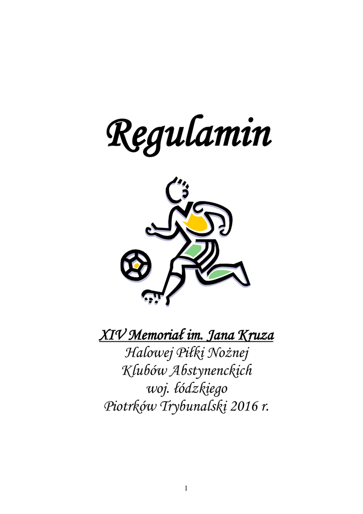 Regulamin XIV Memoriał im. Jana Kruza Halowej Piłki Nożnej Klubów Abstynenckich woj. łódzkiego Piotrków Trybunalski 2016 r. 1 I. Cel zawodów: 1. Popularyzacja zdrowej i czynnej rekreacji. 2. Promocja Miasta Piotrkowa Trybunalskiego. 3. Zaprezentowanie ruchu abstynenckiego lokalnej społeczności. 4. Uczciwa rywalizacja i zachowanie Fair Play. II. Organizator: Stowarzyszenie Wzajemnej Pomocy Abstynenckiej „Pałacyk” w Piotrkowie Trybunalskim. III. Współorganizatorzy 1. Miejska Komisja Rozwiązywania Problemów Alkoholowych w Piotrkowie Trybunalskim. 2. Ośrodek Sportu i Rekreacji w Piotrkowie Trybunalskim. 3. Grupa „VIA NOVA” w Piotrkowie Trybunalskim IV. Zasady rozgrywania memoriału: 1. Memoriał rozgrywany jest w dwóch grupach. 2. Zwycięscy grup rozgrywają o miejsce 1/2 3. Drużyny z drugiego miejsca w grupie grają o miejsce 3/4 4. Drużyny z trzeciego miejsca w grupie grają o miejsce 5/6 5. Drużyny z czwartego miejsca w grupie grają o miejsce 7/8 6. System rozgrywek; a) w grupie każdy z każdym – jedno spotkanie. b) czas trwania meczów 2 razy po 10 minut, lub 1 raz po 15 minut. c) z przyczyn uzasadnionych organizator może zmienić czas gry (po uzgodnieniu z kierownikami drużyn). 7. Sędziowie; a) organizator zapewnia co najmniej 2 sędziów. b) sędzia główny powinien być osobą postronną (nie być uczestnikiem zawodów). 8. Uczestnicy; a) drużyny składają się z 6 osób (5zawodników w polu i bramkarza). b) ilość zawodników rezerwowych 4 + bramkarz. c) w polu nie może jednocześnie występować nie więcej niż 2 zawodników poniżej 30 roku życia (nie dotyczy bramkarza). 9. Kwestie sporne rozstrzyga organizator z sędziami zawodów i kierownikami drużyn. V. Zasady rozgrywania meczów: 1. Nie obowiązuje przepis o „spalonym”. 2. Żółta kartka wyklucza zawodnika z gry na 2 min. 3. Zielona kartka za wulgaryzmy wyklucza zawodnika z gry na 2 min. 4. Czerwona kartka wyklucza zawodnika z gry do końca meczu. 2 5. Następna czerwona kartka dyskwalifikuje zawodnika do końca zawodów. 6. Ilość zmian jest nieograniczona. VI. Punktacja w turnieju: 1. Drużynowa: a) zwycięstwo w meczu - 3 punkty b) remis w meczu - 1 punkt c) przegrana - 0 punktów d) walkower - 3 punkty (bramki 3:0) e) w przypadku równej ilości punktów o kolejność drużyn w turnieju decyduje w podanej kolejności; - wynik bezpośredniego meczu. - różnica bramek. - ilość zdobytych bramek. - rzuty karne (serie po 3). 2. Najlepszy strzelec: a) ilość strzelonych bramek, w przypadku równej ilości strzelonych bramek wyższe miejsce w drużyny. 3. Najlepszy bramkarz: a) najmniej wpuszczonych bramek, w przypadku równej ilości strzelonych bramek niższe miejsce w drużyny. VII. Nagrody: I miejsce – puchar Prezydenta Miasta Piotrkowa Trybunalskiego II miejsce – puchar Dyrektora O S i R w Piotrkowie Trybunalskim III miejsce – puchar M.K.R.P.A. w Piotrkowa Trybunalskim Puchar Fair Play – Prezes S.W.P.A. „Pałacyk” Puchar dla najlepszego bramkarza – ufundowała Grupa „VIA NOVA” Puchar dla najlepszego strzelca – ufundowało SWPA ”Pałacyk” Dyplomy dla drużyn – za udział w XIII memoriale im. Jana Kruza. VIII. Postanowienia końcowe: 1. Za skład i zachowanie drużyn i osób towarzyszących odpowiada kierownik drużyny. 2. Kierownikiem drużyny jest osoba opiekująca się drużyną i osobami towarzyszącymi w turnieju. 3. Wszelkie wątpliwości organizator ustala tylko z kierownikami drużyn. 4. Uczestnicy zobowiązują się do przestrzegania w\w regulaminu oraz ogólnych zasad Fair Play. 5. O sprawach nie objętych regulaminem decyzję podejmuje organizator w porozumieniu z kierownikami drużyn. 6. Regulamin w imieniu organizatora i podpisał prezes SWPA „Pałacyk” 3