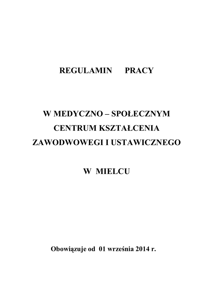 REGULAMIN PRACY W MEDYCZNO – SPOŁECZNYM CENTRUM KSZTAŁCENIA ZAWODWOWEGI I USTAWICZNEGO W MIELCU Obowiązuje od 01 września 2014 r. 2 Rozdział I Postanowienia wstępne. 1. Regulamin pracy ustala organizację i porządek w procesie pracy oraz określa związane z działalnością zakładu prawa i obowiązki pracodawcy i pracowników. 2. Regulamin niniejszy uwzględnia podstawowe zasady zawarte w : - Kodeksie Pracy – ustawie z dnia 26 czerwca 1974 r. z późniejszymi zmianami /Dz.U. Nr 21, poz.94 z 1998 r.- jednolity tekst ustawy z późniejszymi zmianami - Rozporządzeniu Ministra Pracy i Polityki Socjalnej z dnia 15 maja 1996 r. w sprawie sposobu usprawiedliwienia nieobecności w sprawie sposobu usprawiedliwienia nieobecności w pracy oraz udzielania pracownikom zwolnień od pracy / Dz.U. Nr 60, poz. 281 /, - Rozporządzeniu RM z dnia 10 września 1996 r. w sprawie wykazu prac wzbronionych kobietom / Dz.U. Nr 114, poz.545 ze zmianami /, - Ustawie z dnia 26 stycznia 1982 r. – Karta Nauczyciela – z późniejszymi zmianami / Dz.U. z 2014 r.poz. 191- jednolity tekst ustawy ze zm. / - Ustawie z dnia 7 września 1991 r. o systemie oświaty ze zmianami / Dz.U. z 1996 r. Nr 67 , poz.329 - jednolity tekst ustawy z późniejszymi zmianami /, 3. Zakres praw i obowiązków pracowników określają : 1/ 2/ 3/ 4/ ogólne przepisy prawa pracy, niniejszy Regulamin, zawarte z pracownikami akty nawiązania stosunku pracy, indywidualne zakresy czynności wynikające ze Statutu Szkoły. Rozdział II Obowiązki pracodawcy. §1 Pracodawca jest obowiązany w szczególności : 1. Zaznajomić pracowników podejmujących pracę z zakresem ich obowiązków, sposobem wykonywania pracy na wyznaczonych stanowiskach oraz ich podstawowymi uprawnieniami. 3 2. Organizować pracę w sposób zapewniający pełne wykorzystanie czasu pracy, jak równieŜ osiąganie przez pracowników, przy wykorzystaniu ich uzdolnień i kwalifikacji, wysokiej wydajności i naleŜytej jakości pracy. 3. Zapewnić bezpieczne i higieniczne warunki pracy oraz prowadzić systematyczne szkolenie pracowników w zakresie bezpieczeństwa i higieny pracy. 4. Kierować pracowników na okresowe badania lekarskie, dopuszczać do pracy tylko pracownika, którego stan zdrowia gwarantuje bezpieczeństwo w wykonywaniu powierzonej pracy. 5. Terminowo i prawidłowo wypłacać wynagrodzenie. 6. Ułatwiać pracownikom podnoszenie kwalifikacji zawodowych. 7. Stwarzać pracownikom podejmującym zatrudnienie warunki sprzyjające przystosowaniu się do naleŜytego wykonywania pracy. 8. WyposaŜać pracowników w narzędzia i materiały, a takŜe w odzieŜ i środki ochrony indywidualnej, zgodnie z obowiązującymi w tym względzie z przepisami. 9. Stosować obiektywne i sprawiedliwe kryteria oceny pracowników oraz wyników ich pracy. 10. Prowadzić dokumentację w sprawach związanych ze stosunkiem pracy oraz akta osobowe pracowników. 11. Ściśle współpracować z zespołem pracowników oraz organizacjami związkowymi, działającymi na terenie zakładu. 12. Wpływać na kształtowanie w zakładzie pracy zasad współŜycia społecznego. 13. Przeciwdziałać dyskryminacji w zatrudnieniu pracowników w jakikolwiek sposób. 14. Przestrzegać zasady równego traktowania pracowników. I . Zasady równego traktowania w zatrudnianiu przez pracodawcę 1. Pracownicy powinni być równo traktowani w zakresie nawiązania i rozwiązania stosunku pracy, warunków zatrudnienia, awansowania oraz dostępu do szkolenia w celu podnoszenia kwalifikacji zawodowych, w szczególności bez względu na płeć, wiek, niepełnosprawność, rasę, religię, narodowość, przekonania polityczne, przynaleŜność związkową, pochodzenie etniczne, wyznanie, orientację seksualną, a takŜe bez względu na zatrudnienie na czas określony lub nieokreślony albo w pełnym lub w niepełnym wymiarze czasu pracy. 2. Równe traktowanie w zatrudnieniu oznacza niedyskryminowanie w jakikolwiek sposób, bezpośrednio lub pośrednio z przyczyn określonych wyŜej 4 3. Pracodawca udostępnia pracownikom tekst przepisów dotyczących równego traktowania w zatrudnianiu oraz skutkach naruszeń tych przepisów w formie załącznika Nr 1 do Regulaminu Pracy, oraz zapewnia dostęp do tych przepisów na terenie zakładu /pokój nauczycielski, sekretariat szkoły/ 15. Przeciwdziałać mobbingowi w zakładzie pracy 1. Pracodawca obowiązany jest przeciwdziałać mobbingowi . 2. Teks przepisów dotyczących przeciwdziałania mobbingowi w zakładzie pracy oraz uprawnieniach pracowników dotkniętych mobbingiem, udostępnia się pracownikom w formie załącznika Nr 2 do Regulaminu Pracy oraz zapewnia dostęp do tych przepisów na terenie zakładu /pokój nauczycielski, sekretariat szkoły/ Rozdział III Obowiązki pracownika. § 2. 1. Pracownik jest obowiązany wykonywać pracę sumiennie i starannie oraz stosować się do poleceń przełoŜonych, które dotyczą pracy. 2. Pracownik jest obowiązany w szczególności : 1/ przestrzegać czasu pracy ustalonego w zakładzie pracy, 2/ przestrzegać regulaminu pracy i ustalonego w zakładzie pracy porządku, 3/ przestrzegać przepisów oraz zasad bezpieczeństwa i higieny pracy, a takŜe przepisów przeciwpoŜarowych, 4/ dbać o dobro zakładu pracy, chronić jego mienie oraz zachować w tajemnicy informacje, których ujawnienie mogłoby narazić pracodawcę na szkodę, 5/ przestrzegać zasad współŜycia społecznego, okazywać pomoc podległym pracownikom oraz młodym pracownikom w ich adaptacji zawodowej. 6/ zawiadamiać niezwłocznie przełoŜonego o charakterze lub przyczynie uniemoŜliwiającej stawienie się do pracy, jak równieŜ uprzedzanie z góry o wiadomej przyczynie powodującej nieobecność w pracy, 7/ zawiadomić pracownika ds. kadr o kaŜdej zmianie danych personalnych. 3. Pracownik zobowiązany jest wydane mu przez zakład dokumenty niezbędne do wykonywania pracy i obowiązków słuŜbowych posiadać przy sobie w czasie pracy, chronić 