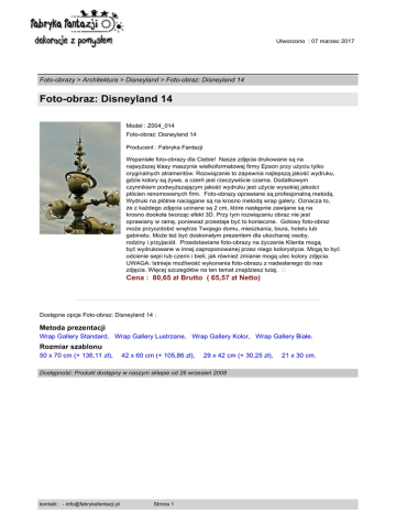 Utworzono : 07 marzec 2017 Foto-obrazy > Architektura > Disneyland > Foto-obraz: Disneyland 14 Foto-obraz: Disneyland 14 Model : Z004_014 Foto-obraz: Disneyland 14 Producent : Fabryka Fantazji Wspaniałe foto-obrazy dla Ciebie! Nasze zdjęcia drukowane są na najwyższej klasy maszynie wielkoformatowej firmy Epson przy użyciu tylko oryginalnych atramentów. Rozwiązanie to zapewnia najlepszą jakość wydruku, gdzie kolory są żywe, a czerń jest rzeczywiście czarna. Dodatkowym czynnikiem podwyższającym jakość wydruku jest użycie wysokiej jakości płócien renomowanych firm. Foto-obrazy oprawiane są profesjonalną metodą. Wydruki na płótnie naciągane są na krosno metodą wrap galery. Oznacza to, że z każdego zdjęcia ucinane są 2 cm, które następnie zawijane są na krosno dookoła tworząc efekt 3D. Przy tym rozwiązaniu obraz nie jest oprawiany w ramę, ponieważ przestaje być to konieczne. Gotowy foto-obraz może przyozdobić wnętrze Twojego domu, mieszkania, biura, hotelu lub gabinetu. Może też być doskonałym prezentem dla ukochanej osoby, rodziny i przyjaciół. Przedstawiane foto-obrazy na życzenie Klienta mogą być wydrukowane w innej zaproponowanej przez niego kolorystyce. Mogą to być odcienie sepii lub czerni i bieli, jak również zmianie mogą ulec kolory zdjęcia. UWAGA: Istnieje możliwość wykonania foto-obrazu z nadesłanego do nas zdjęcia. Więcej szczegółów na ten temat znajdziesz tutaj. � Cena : 80,65 zł Brutto ( 65,57 zł Netto) Dostępne opcje Foto-obraz: Disneyland 14 : Metoda prezentacji Wrap Gallery Standard, Wrap Gallery Lustrzane, Wrap Gallery Kolor, Wrap Gallery Białe. Rozmiar szablonu 50 x 70 cm (+ 136,11 zł), 42 x 60 cm (+ 105,86 zł), 29 x 42 cm (+ 30,25 zł), Dostępność: Produkt dostępny w naszym sklepie od 26 wrzesień 2008 kontakt : - [email protected] Strona 1 21 x 30 cm.