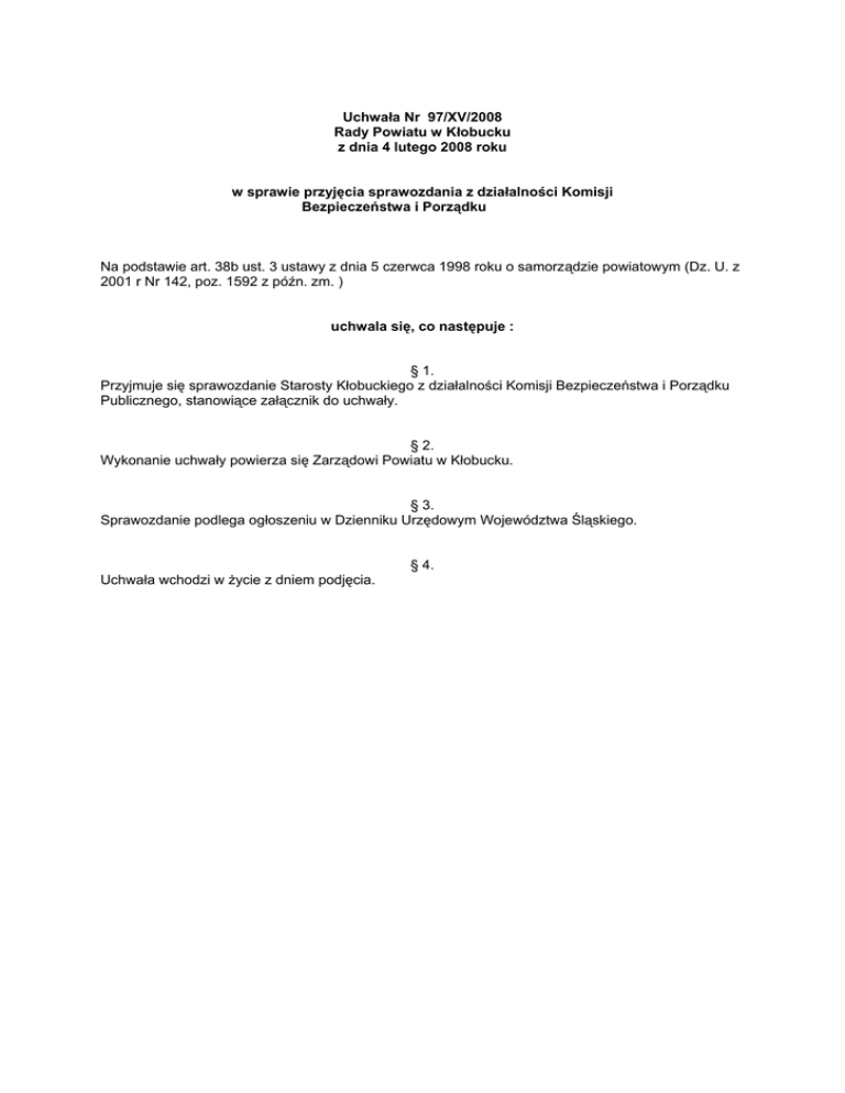 Uchwała Nr 97/XV/2008 Rady Powiatu w Kłobucku z dnia 4 lutego 2008 roku w sprawie przyjęcia sprawozdania z działalności Komisji Bezpieczeństwa i Porządku Na podstawie art. 38b ust. 3 ustawy z dnia 5 czerwca 1998 roku o samorządzie powiatowym (Dz. U. z 2001 r Nr 142, poz. 1592 z późn. zm. ) uchwala się, co następuje : § 1. Przyjmuje się sprawozdanie Starosty Kłobuckiego z działalności Komisji Bezpieczeństwa i Porządku Publicznego, stanowiące załącznik do uchwały. § 2. Wykonanie uchwały powierza się Zarządowi Powiatu w Kłobucku. § 3. Sprawozdanie podlega ogłoszeniu w Dzienniku Urzędowym Województwa Śląskiego. § 4. Uchwała wchodzi w życie z dniem podjęcia. SPRAWOZDANIE Z DZIAŁALNOŚCI KOMISJI BEZPIECZEŃSTWA I PORZĄDKU POWIATU KŁOBUCKIEGO ZA ROK 2007. W roku 2007 Komisja Bezpieczeństwa i Porządku Powiatu Kłobuckiego odbyła dwa posiedzenia, na których omawiano realizację zadań poprawiających stan bezpieczeństwa w powiecie. Pierwsze posiedzenie odbyło się w dniu 12 lipca 2007r. Tematy omawiane na posiedzeniu : 1. Przygotowanie służb i inspekcji do wzmożonego ruchu pielgrzymkowego i turystycznego. 2. Zapewnienie bezpieczeństwa na zbiornikach wodnych. Ad. 1 Naczelnik Wydziału Spraw Obywatelskich i Zarządzania Kryzysowego Starostwa Powiatowego w Kłobucku, przedstawił informację nt. przygotowania służb i inspekcji do wzmożonego ruchu pielgrzymkowego i turystycznego. Corocznie przez teren powiatu kłobuckiego w miesiącach lipcu i sierpniu przechodzi ok. 40 pielgrzymek, w których bierze udział ok. 15 tys. pielgrzymów zmierzających na Jasną Górę. Bezpieczeństwo ruchu pielgrzymkowego w dużym stopniu zależy od skoordynowanej współpracy pomiędzy instytucjami. Corocznie trasy pielgrzymek są zgłaszane przez organizatora pielgrzymki do Śląskiego Urzędu Wojewódzkiego Oddział w Częstochowie, który rozsyła zawiadomienia o przebiegu tras pielgrzymek do poszczególnych gmin powiatu kłobuckiego, przez które będą przechodzić pielgrzymi. O trasie pielgrzymki zawiadamia się Powiatowy Zarząd Dróg, Komendę Powiatową Policji, KP Państwowej Straży Pożarnej oraz Powiatowy Inspektorat Sanitarny. Wszystkie te służby posiadają informację na temat danej pielgrzymki, która przechodzi przez teren Powiatu Kłobuckiego. Obiekty, które są udostępniane przez władze lokalne na nocleg dla pielgrzymów posiadają odpowiednie normy i standardy bezpieczeństwa. Ad. 2 Naczelnik Wydziału Spraw Obywatelskich i Zarządzania Kryzysowego Starostwa Powiatowego w Kłobucku, przedstawił informację nt. zapewnienia bezpieczeństwa na zbiornikach wodnych. - kąpieliska zorganizowane – na terenie powiatu są zlokalizowane 2 kąpieliska zorganizowane. Pierwsze kąpielisko na zbiorniku wodnym w Zakrzewie oraz drugie „Borówka” w Kamyku. Obydwa kąpieliska są strzeżone, są zatrudnieni ratownicy, istnieje także możliwość wypożyczenia sprzętu do pływania w postaci łódek, kajaków i rowerów wodnych. Badanie PSSE w Kłobucku wykazało, że są spełnione wymagania rozporządzenia Ministra Zdrowia z dnia 16 października 2002r w sprawie wymagań jakimi powinna odpowiadać woda w kąpieliskach i nadaje się do kąpieli i rekreacji. - kąpieliska niezorganizowane (zwyczajowo wykorzystywane) – są to kąpieliska niestrzeżone, bez nadzoru ratowników. Należą tu zbiorniki wodne oraz odcinki rzek zwyczajowo wykorzystywane do kąpieli : zbiornik retencyjny w Ostrowach, zbiorniki wodne w Krzepicach, zbiornik wodny w Pankach, rzeka Warta na Kulach, rzeka Liswarta w Zawadach. Miejsca przeznaczone do kąpieli przez cały sezon letni były pod nadzorem PSSE w Kłobucku. W stosunku do obiektów, w których nastąpiła zmiana jakości wody były na bieżąco podejmowane decyzje o dopuszczeniu do kąpieli lub jej zakazie. - baseny sezonowe – był czynny 1 basen sezonowy przy Zespole Szkół w Węglowicach. Pozostałe 2 baseny tj. basen OSiR w Kłobucku i basen sezonowy przy Ośrodku Wczasowym „Sosenka” w sezonie 2007 były nieczynne. - baseny całoroczne – na terenie powiatu kłobuckiego występują 2 baseny całoroczne. Są to baseny strzeżone : Kryta Pływalnia w Kłobucku, Basen przy Ośrodku Wczasowym ODK SW w Kulach. Stan sanitarno-techniczny obiektów jest dobry, węzły sanitarne i szatnie w dobrym stanie. Przeprowadzone badania wody nie wykazały przekroczeń wskaźników fizykochemicznych i bakteriologicznych. Drugie posiedzenie odbyło się w dniu 18 grudnia 2007r. Tematy omawiane na posiedzeniu : 1. Akcja zima 2007-2008, przygotowanie służb (PZD Kłobuck). 2. Przedstawienie projektu Powiatowego Harmonogramu Realizacji Programu „Razem Bezpieczniej”. 3. Projekt planu pracy Komisji na 2008r. Ad. 1. Dyrektor Powiatowego Zarządu Dróg w Kłobucku, omówił przygotowanie jego służb do sezonu zimowego. Jak co roku opracowano plany zimowego utrzymania dróg powiatowych i wojewódzkich. W ramach w/w planów zabezpieczono odpowiednie ilości soli i piasku do zwalczania śliskości zimowej. Zabezpieczono odpowiednie ilości sprzętu prowadzenia zimowego utrzymania dróg. Zabezpieczono i zorganizowano system łączności niezbędnej do prawidłowego kierowania akcją zimową oraz opracowano procedury reagowania w przypadku wystąpienia klęski żywiołowej związanej z intensywnymi opadami śniegu. Drogi utrzymywane są w standardzie II, III, IV, V i VI. Sprzęt wykorzystywany do akcji zima to między innymi : • pługo- piaskarki • pługi klinowe • pługi lemieszowe • pługi ciągnikowe • koparko-ładowarki • samochód z kombajnem śniegowym • równiarki Od 1 listopada są całodobowe dyżury na terenach dróg, mające na celu zapobieganie pogorszeniu się warunków na drogach. Służby drogowe reagują na sygnały podawane przez Policję i Straż Pożarną o nieprzejezdności na drogach i w jak najkrótszym czasie likwidują zaistniałą sytuację. Ad. 2 Naczelnik Wydziału SOiZK, omówił projekt Powia