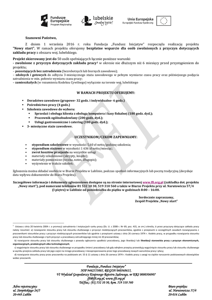 Szanowni Państwo, Z dniem 1 września 2016 r. roku Fundacja „Fundusz Inicjatyw” rozpoczęła realizację projektu "Nowy start". W ramach projektu oferujemy bezpłatne wsparcie dla osób zwolnionych z przyczyn dotyczących zakładu pracy z obszaru woj. lubelskiego. Projekt skierowany jest do 50 osób spełniających łącznie poniższe warunki: - zwolnione z przyczyn dotyczących zakładu pracy 1 w okresie nie dłuższym niż 6 miesięcy przed przystąpieniem do projektu; – pozostających bez zatrudnienia (bezrobotnych lub biernych zawodowo); – zdolnych i gotowych do odbycia 3-miesięcznego stażu zawodowego w pełnym wymiarze czasu pracy oraz późniejszego podjęcia zatrudnienia w min. połowie wymiaru czasu pracy; – zamieszkałych (w rozumieniu Kodeksu Cywilnego) wyłącznie na terenie woj. lubelskiego W RAMACH PROJEKTU OFERUJEMY: Doradztwo zawodowe (grupowe- 32 godz. i indywidualne- 6 godz.) Pośrednictwo pracy (4 godz.) Szkolenia zawodowe do wyboru: Sprzedaż i obsługa klienta z obsługą komputera i kasy fiskalnej (180 godz. dyd.); Pracownik ogólnobudowlany (200 godz. dyd.); Usługi gastronomiczne i catering (180 godz. dyd.); 3- miesięczne staże zawodowe. UCZESTNIKOM/CZKOM ZAPEWNIAMY: • • • • • • stypendium szkoleniowe w wysokości 5,60 zł netto/godzinę szkolenia; stypendium stażowe w wysokości 1 636 zł netto/miesiąc; zwrot kosztów przejazdu na wszystkie usługi materiały szkoleniowe (skrypty, książki); materiały pomocnicze (teczka, notes, długopis); wyżywienie w trakcie szkoleń; Zgłoszenia można składać osobiście w Biurze Projektu w Lublinie, podczas spotkań informacyjnych lub pocztą tradycyjną (decyduje data wpływu dokumentów do Biura Projektu). Szczegółowe informacje i dokumenty zgłoszeniowe dostępne są na stronie internetowej www.ffi.org.pl (zakładka dot. projektu „Nowy start”), pod numerami telefonów 81 532 10 30, 519 310 560 a także w Biurze Projektu przy ul. Narutowicza 57/4 (I piętro) w Lublinie od poniedziałku do piątku w godzinach 8:00 – 16:00. Serdecznie zapraszamy, Zespół Projektu „Nowy start” 1 Ustawa z dnia 20 kwietnia 2004 r. o promocji zatrudnienia i instytucjach rynku pracy (Dz. U. z 2008 r. Nr 69, poz. 415, ze zm.) określa, iż przez przyczyny dotyczące zakładu pracy należy rozumieć: a) rozwiązanie stosunku pracy lub stosunku służbowego z przyczyn niedotyczących pracowników, zgodnie z przepisami o szczególnych zasadach rozwiązywania z pracownikami stosunków pracy z przyczyn niedotyczących pracowników lub zgodnie z przepisami ustawy z dnia 26 czerwca 1974 r. Kodeks pracy, w przypadku rozwiązania stosunku pracy lub stosunku służbowego z tych przyczyn u pracodawcy zatrudniającego mniej niż 20 pracowników; b) rozwiązanie stosunku pracy lub stosunku służbowego z powodu ogłoszenia upadłości pracodawcy, jego likwidacji lub likwidacji stanowiska pracy z przyczyn ekonomicznych, organizacyjnych, produkcyjnych albo technologicznych; c) wygaśnięcie stosunku pracy lub stosunku służbowego w przypadku śmierci pracodawcy lub gdy odrębne przepisy przewidują wygaśnięcie stosunku pracy lub stosunku służbowego w wyniku przejścia zakładu pracy lub jego części na innego pracodawcę i niezaproponowania przez tego pracodawcę nowych warunków pracy i płacy; d) rozwiązanie stosunku pracy przez pracownika na podstawie art. 55 § 11 ustawy z dnia 26 czerwca 1974 r. Kodeks pracy z uwagi na ciężkie naruszenie podstawowych obowiązków wobec pracownik. Fundacja „Fundusz Inicjatyw” NIP 9462553005, REGON 060368615, VI Wydział Gospodarczy Krajowego Rejestru Sądowego, nr KRS 0000306907 [email protected], www.ffi.org.pl Tel/fax.: (81) 532 10 30, kom. 519 310 560 Adres rejestracyjny: ul. Sierpińskiego 24/5 20-448 Lublin Biuro projektu: ul. Narutowicza 57/4 20-016 Lublin