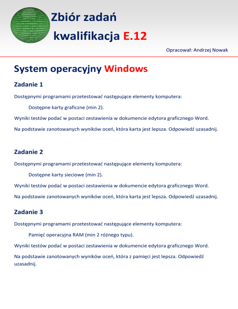 Zbiór zadań kwalifikacja E.12 Opracował: Andrzej Nowak System operacyjny Windows Zadanie 1 Dostępnymi programami przetestować następujące elementy komputera: Dostępne karty graficzne (min 2). Wyniki testów podać w postaci zestawienia w dokumencie edytora graficznego Word. Na podstawie zanotowanych wyników oceń, która karta jest lepsza. Odpowiedź uzasadnij. Zadanie 2 Dostępnymi programami przetestować następujące elementy komputera: Dostępne karty sieciowe (min 2). Wyniki testów podać w postaci zestawienia w dokumencie edytora graficznego Word. Na podstawie zanotowanych wyników oceń, która karta jest lepsza. Odpowiedź uzasadnij. Zadanie 3 Dostępnymi programami przetestować następujące elementy komputera: Pamięć operacyjna RAM (min 2 różnego typu). Wyniki testów podać w postaci zestawienia w dokumencie edytora graficznego Word. Na podstawie zanotowanych wyników oceń, która z pamięci jest lepsza. Odpowiedź uzasadnij. Zadanie 4 Dostępnymi programami przetestować następujące elementy komputera: Procesory (min 2 różne). Wyniki testów podać w postaci zestawienia w dokumencie edytora graficznego Word. Na podstawie zanotowanych wyników oceń, który z procesorów jest lepszy. Odpowiedź uzasadnij. Zadanie 5 Dostępnymi programami przetestować następujące elementy komputera: Chipsety i płyty główne komputera (min 2) . Wyniki testów podać w postaci zestawienia w dokumencie edytora graficznego Word. Na podstawie zanotowanych wyników oceń, która z płyt jest lepsza. Odpowiedź uzasadnij. Zadanie 6 W arkuszu kalkulacyjnym wykonaj kosztorys wykonanych prac. Plik nazwij (kosztorys) i zapisz w katalogu Audyt_komputera. Kosztorys powinien zawierać następujące kolumny: Lp. Nazwa usługi Wartość usługi w zł (brutto) 1. 2. Pod ostatnim wierszem w kolumnie : (Wartość usługi w zł (brutto)) umieść formułę sumującą. W kosztorysie uwzględnij wszystkie wykonane czynności.