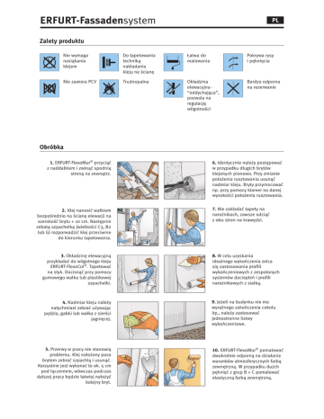 ERFURT-Fassadensystem PL Zalety produktu Nie wymaga nasiąkania klejem Do tapetowania techniką nakładania kleju na ścianę Łatwa do malowania Pokrywa rysy i pęknięcia Nie zawiera PCV Trudnopalna Okładzina elewacyjna “oddychająca”, pozwala na regulację wilgotności Bardzo odporna na rozerwanie Obróbka 1. ERFURT-FlexoMur® przyciąć z naddatkiem i zwinąć spodnią stroną na zewnątrz. 2. Klej nanosić wałkiem bezpośrednio na ścianę elewacji na szerokość brytu + 10 cm. Następnie zebatą szpachelką (wielkości C3, B2 lub G) rozporwadzić klej przeciwnie do kierunku tapetowania. 3. Okładzinę elewacyjną przykładać do wilgotnego kleju ERFURT-FlexoCol®. Tapetować na styk. Docisnąć przy pomocy gumowego wałka lub plastikowej szpachelki. 4. Nadmiar kleju należy natychmiast zebrać używając pędzla, gabki lub wałka z sierści jagnięcej. 5. Przerwy w pracy nie stanowią problemu. Klej nałożony poza brytem zebrać szpachlą i usunąć. Korzystnie jest wykonać to ok. 5 cm pod łączeniem, wówczas podczas dalszej pracy będzie łatwiej nałożyć kolejny bryt. 6. Identycznie należy postępować w przypadku długich brytów klejonych pionowo. Przy zmianie położenia rusztowania usunąć nadmiar kleju. Bryty przymocować np. przy pomocy klamer na danej wysokości położenia rusztowania. 7. Nie zakładać tapety na narożnikach, zawsze odciąć z obu stron na krawędzi. 8. W celu uzyskania idealnego wykończenia zelca się zastosowania profili wykończeniowych z zespolonych systemów dociepleń i profili narożnikowych z siatką. 9. Jeżeli na budynku nie ma wyraźnego zakończenia cokołu itp., należy zastosować jednostronne listwy wykończeniowe. 10. ERFURT-FlexoMur® pomalować dwukrotnie odporną na działanie warunków atmosferycznych farbą zewnętrzną. W przypadku dużch pęknięć z grup B + C pomalować elastyczną farbą zewnętrzną. Instrukcja Techniczna PL Opis Wyrobu poszerzyć i odpowiednio uzbroić. Aby stworzyć gładką powierzchnię należy użyć zewnętrznej (odpornej na działanie warunków atmosferycznych) masy szpachlowej jak np. Ardex Arduplast F3 lub PUFAS Pufaplast V30. Aby uzyskać idealne optycznie łączenia np. na narożnikach zewnętrznych, w ościeżach, na cokołach itd. należy nakleić profile wykończeniowe dostępne w sklepach specjalistycznych, stosowane do zespolonych systemów dociepleń i następnie zaszpachlować. Jeżeli w obrębie łączeń brytów okładziny elewacyjnej ERFURT-FlexoMur® przebiegają rysy, należy je zakleić taśmą zbrojeniową np. Hosch lub Kobau. Producent Erfurt & Sohn KG Hugo-Erfurt-Straße 1 D-42399 Wuppertal www.erfurt.com Grupa produktów System elewacyjny ERFURT Oznakowanie wyrobu ERFURT-FlexoCol® Surowce/ produkcja ERFURT-FlexoCol® jest specjalnym klejem zbrojeniowym, wyprodukowanym na bazie środków wiążących kopolimerów akrylowych o wysokiej sile klejenia okładziny zewnętrznej ERFURT-FlexoMur®. Wielkość opakowania ERFURT-FlexoCol® to wiadro 20 kg. Właściwości · barwiony na biało · gęstość: ok. 1,20 kg/dm3 · nadaje się do nakładania wałkiem, tiksotropowy , przy użyciu zamieszać · na bazie wodnej · nadaje się na powierzchnie betonowe, tynki cementowowapienne, pokrywa rysy · w połączeniu z podłożem mineralnym w systemie z ERFURTFlexoMur® zgodnie z normą DIN 4102-B 1 trudnopalny · nie zawiera dodatków związków metali ciężkich oraz formaldehydów · przepuszczalność pary wodnej według DIN 52615 systemu: ERFURT-FlexoCol®, ERFURT-FlexoMur® i elastycznej farby elewacyjnej odpowiada dyfuzyjnie równoważnej warstwie powietrza 0,41 m. Zastosowanie/obróbka Warunki obróbki Klej należy nakładać wałkiem z sierści jagnięcej lub innym wałkiem do farb lub też odpowiednią pneumatyczną maszyną natryskową. Zużycie kleju zależnie od podłoża i nakładanej ilości wynosi 0,8 do 1,3 kg/m2. Żeby uniknąć problemów z przyczepnością, nie należy smarować klejem zbyt dużej powierzchni. Temperatura podczas obróbki nie może być niższa niż 5° C. Należy unikać bezpośredniego nasłonecznienia. Klejenie Klej zbrojeniowy ERFURT-FlexoCol® należy równomiernie nałożyć wybranym wałkiem. Okładzinę elewacyjną ERFURTFlexoMur® należy przyciąć z naddatkiem, rozwinąć i przykładać do pomalowanej klejem ściany. Docisnąć gumowym wałkiem i/lub plastikową szpachelką. Nadmiar okładziny na łączeniach, w miejscach takich jak okna, drzwi, cokoły itd. docisnąć szpachlą tapeciarską do narożników i obciąć nożem do tapet. Poszczególne bryty okładziny należy łączyć na styk. ERFURT-FlexoMur® nie należy kleić na zakładkę, ewentualnie można zastosować podwójne cięcie. Łączenia utrwalić akrylem. Plamy z kleju należy natychmiast usunąć wodą. Schnięcie Schnięcie jest zależne od temperatury i wilgotności powietrza jak również od chłonności podłoża. Przy temperaturze ok. 20° C i wilgotności 50% czas schnięcia ERFURT-FlexoCol® w systemie z ERFURT-FlexoMur® wynosi 1 dzień. Czyszczenie narzędzi Natychmiast po użyciu należy umyć wodą. Klej zbrojeniowy ERFURT-FlexoCol® należy stosować do klejenia okładziny zewnętrznej ERFURT-FlexoMur®. ERFURT-FlexoCol® można stosować na wszystkich wytrzymałych, stabilnych, czystych, suchych i równych podłożach, takich jak tynk, mur każdego rodzaju, beton i beton porowaty (gazobeton). ERFURT-FlexoCol® można stosować w systemie z ERFURTFlexoMur® do odnawiania zespolonych systemów dociepleń. ERFURT-FlexoCol® można stosować na powierzchniach wcześniej już malowanych farbami mineralnymi lub dyspersyjnymi, jednakże każdorazowo należy zwrócić uwagę na odpowiednie przygotowanie podłoża. Podłoże Podłoże musi być suche, czyste, stabilne i gładkie. Odpadające warstwy farby należy usunąć. Podłoże należy zagruntować środkiem do gruntowania na bazie rozpuszczalnika, lecz w przypadku stosowania na zespolone systemy dociepleń n