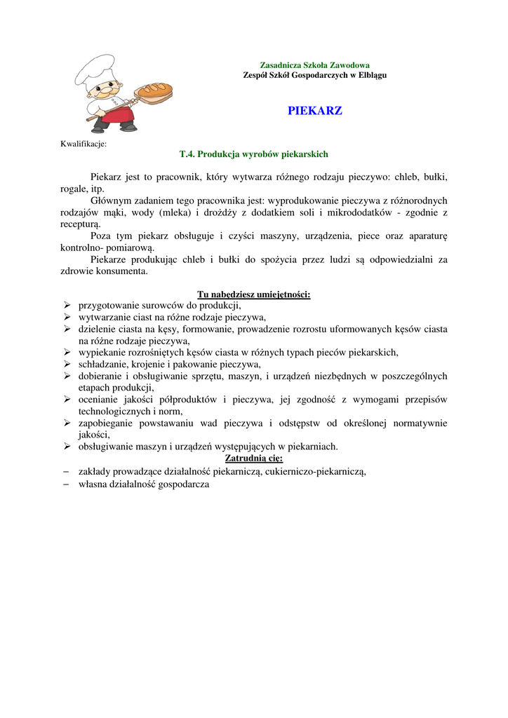Zasadnicza Szkoła Zawodowa Zespół Szkół Gospodarczych w Elblągu PIEKARZ Kwalifikacje: T.4. Produkcja wyrobów piekarskich Piekarz jest to pracownik, który wytwarza różnego rodzaju pieczywo: chleb, bułki, rogale, itp. Głównym zadaniem tego pracownika jest: wyprodukowanie pieczywa z różnorodnych rodzajów mąki, wody (mleka) i drożdży z dodatkiem soli i mikrododatków - zgodnie z recepturą. Poza tym piekarz obsługuje i czyści maszyny, urządzenia, piece oraz aparaturę kontrolno- pomiarową. Piekarze produkując chleb i bułki do spożycia przez ludzi są odpowiedzialni za zdrowie konsumenta. Tu nabędziesz umiejętności: przygotowanie surowców do produkcji, wytwarzanie ciast na różne rodzaje pieczywa, dzielenie ciasta na kęsy, formowanie, prowadzenie rozrostu uformowanych kęsów ciasta na różne rodzaje pieczywa, wypiekanie rozrośniętych kęsów ciasta w różnych typach pieców piekarskich, schładzanie, krojenie i pakowanie pieczywa, dobieranie i obsługiwanie sprzętu, maszyn, i urządzeń niezbędnych w poszczególnych etapach produkcji, ocenianie jakości półproduktów i pieczywa, jej zgodność z wymogami przepisów technologicznych i norm, zapobieganie powstawaniu wad pieczywa i odstępstw od określonej normatywnie jakości, obsługiwanie maszyn i urządzeń występujących w piekarniach. Zatrudnią cię: − zakłady prowadzące działalność piekarniczą, cukierniczo-piekarniczą, − własna działalność gospodarcza