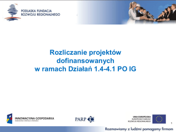 Rozliczanie projektów dofinansowanych w ramach Działań 1.4-4.1 PO IG 1 Zakres tematyczny n Wybór wykonawców w ramach projektu n Wprowadzanie zmian do umowy n Występowanie z wnioskiem o płatność n Dokumentowanie wydatków n Rozliczanie zaliczek n Kontrola Projektu n Promocja Projektu n Najczęściej popełniane błędy we wniosku o płatność 2 Realizacja projektu zgodnie z umową oraz przepisami prawa n Projekt musi być realizowany w zgodzie z umową o dofinansowanie, n obowiązującymi przepisami prawa krajowego i wspólnotowego, n wytycznymi MRR obowiązującymi na dzień dokonywania odpowiedniej czynności, n wytycznymi MRR w zakresie kwalifikowania wydatków w ramach POIG obowiązującymi w chwili ogłoszenia naboru. 3 Kwalifikowalność wydatków Rozpoczęcie okresu kwalifikowalności: • dzień faktycznej realizacji działań wyszczególnionych w Harmonogramie rzeczowo-finansowym Projektu lub dzień zaciągnięcia pierwszego zobowiązania Beneficjenta dotyczącego wydatków związanych z realizacją Projektu. Czynności/zobowiązania, które mogą zostać uznane za rozpoczęcie realizacji Projektu m.in.: - podpisanie umowy z wyłonionym wykonawcą/dostawcą dostawa towaru lub wykonanie usługi wpłata zaliczki na rzecz przyszłej dostawy. W przypadku zaciągnięcia przez Beneficjenta zobowiązań dotyczących wydatków kwalifikujących się do objęcia wsparciem w ramach Projektu przed dniem rozpoczęcia okresu kwalifikowalności, wszystkie wydatki w ramach projektu zostaną uznane za niekwalifikujące się do objęcia wsparciem (§5 ust.5). Stanowi to przesłankę do wypowiedzenia umowy o dofinansowanie. 4 Kwalifikowalność wydatków Beneficjent zobowiązuje się zakończyć realizację zakresu rzeczowego i finansowego Projektu, wynikającego z wniosku o dofinansowanie, w okresie kwalifikowalności wydatków, określonym w §5 ust. 3. Zakończenie okresu kwalifikowalności oznacza: Ø Wykonanie zakresu rzeczowego Projektu zgodnie z Harmonogramem rzeczowo-finansowym Ø Udokumentowanie zakupu towarów lub usług odpowiednimi protokołami odbioru lub innymi dokumentami potwierdzającymi zgodność realizacji Projektu z warunkami umowy Ø Zrealizowanie pełnego zakresu finansowego Projektu, co oznacza zrealizowanie wszystkich płatności w ramach Projektu. Zakończenie realizacji projektu stanowi złożenie przez Beneficjenta wniosku o płatność końcową 5 Wybór wykonawców w ramach projektu - § 11 umowy Obowiązują zasady: § § § § uczciwej konkurencji, efektywności, jawności i przejrzystości. Należy dołożyć wszelkich starań, aby uniknąć konfliktu interesów. 6 Wybór wykonawców w ramach projektu - § 11 umowy § wybór z zastosowaniem Pzp – tylko, jeśli ustawa dotyczy § Art. 3 ust.1 pkt.5) U PZP: • a) b) c) § Obowiązek stosowania PZP jeżeli łącznie zachodzą następujące okoliczności: ponad 50 % wartości udzielanego zamówienia jest finansowane ze środków publicznych wartość zamówienia jest równa lub przekracza kwoty określone w przepisach wydanych na podstawie art. 11 ust. 8 PZP, (4.845.000 euro dla robót budowlanych , 193.000 euro dla dostaw lub usług; kurs od 2010r. 1 euro = 3,839 zł) przedmiotem zamówienia są roboty budowlane obejmujące wykonanie czynności w zakresie inżynierii lądowej lub wodnej, budowy szpitali, obiektów sportowych, rekreacyjnych lub wypoczynkowych, budynków szkolnych, budynków szkół wyższych lub budynków wykorzystywanych przez administrację publiczną lub usługi związane z takimi robotami budowlanymi; w innych przypadkach – bez Pzp, ale zgodnie z § 11 umowy 7 Wybór wykonawców w ramach projektu - § 11 umowy § § § 11 ust. 3 i 4 umowy o dofinansowanie Jeżeli zakup od jednego dostawcy > 14 tys. euro, należy dokonać porównania 3 ważnych ofert na dzień dokonywania zakupu lub złożenia zamówienia złożonych w odpowiedzi na zapytanie ofertowe § Dodatkowo zapytanie ofertowe zamieszczone na www oraz w siedzibie Beneficjenta 8 Wybór wykonawców w ramach projektu - § 11 umowy Oświadczenie – do każdego wniosku o płatność składanego w RIF beneficjent powinien dostarczyć oświadczenie w zakresie wydatków objętych wnioskiem o płatność, że nie zachodzą okoliczności, o których mowa w art. 6c ust. 2 ustawy z dnia 9 listopada 2000 r. o utworzeniu Polskiej Agencji Rozwoju Przedsiębiorczości (Dz.U. z 2007 r., Nr 42, poz. 275, z późn. zm.) dotyczące powiązań osobowych lub kapitałowych z wykonawcą. Jeśli natomiast zachodzą takie okoliczności (powiązań osobowych lub kapitałowych z wykonawcą) – beneficjent powinien dostarczyć następujące oświadczenie: W związku z realizacją projektu ……………..w programie ………………niniejszym oświadczam, że poniżej wymienione towary/usługi: ………………….. ………………….. objęte wnioskiem o płatność zakupione zostały od ………….. (nazwa dostawcy usługi/towaru) powiązanego z ….. (nazwa beneficjenta) w sposób, o którym mowa art. 6c ust. 2 ustawy z dnia 9 listopada 2000 r. o utworzeniu Polskiej Agencji Rozwoju Przedsiębiorczości (Dz.U. z 2007 r., Nr 42, poz. 275, z późn. zm.). Jednocześnie oświadczam, że zakup powyżej wymienionych towarów/usług został dokonany od………… (nazwa dostawcy usługi/towaru) wyłącznie z uwagi na fakt, iż: - jest on jedynym dostępnym na rynku dostawcą towarów/usług objętych wnioskiem o dofinansowanie, -wybór wykonawcy nastąpił przed dniem 5 stycznia 2011 r. Powyższe informacje są prawdziwe, kompletne, rzetelne oraz zostały przekazane zgodnie z moją najlepszą wiedzą i przy zachowaniu należytej staranności. Niepotrzebne skreślić 9 Zmiany w projekcie - § 8 umowy Sytuacje wymagające obowiązkowo zgłoszenia do Instytucji Wdrażającej: § § § § wszelkie zagrożenia lub nieprawidłowości w projekcie (§ 7 ust. 15), zmiany organizacyjno-prawne Beneficjenta (§ 8 ust. 10), cesje praw z umowy na inny podmiot (§