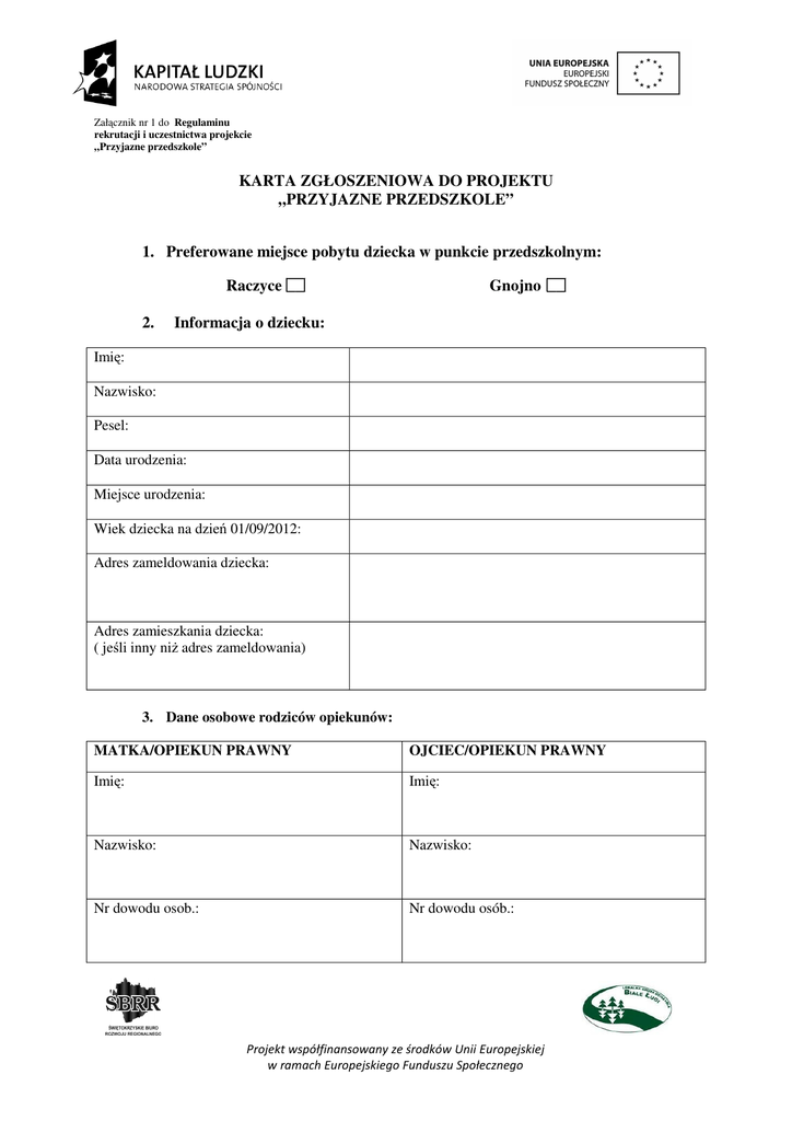 Załącznik nr 1 do Regulaminu rekrutacji i uczestnictwa projekcie „Przyjazne przedszkole” KARTA ZGŁOSZENIOWA DO PROJEKTU „PRZYJAZNE PRZEDSZKOLE” 1. Preferowane miejsce pobytu dziecka w punkcie przedszkolnym: Raczyce 2. Gnojno Informacja o dziecku: Imię: Nazwisko: Pesel: Data urodzenia: Miejsce urodzenia: Wiek dziecka na dzień 01/09/2012: Adres zameldowania dziecka: Adres zamieszkania dziecka: ( jeśli inny niż adres zameldowania) 3. Dane osobowe rodziców opiekunów: MATKA/OPIEKUN PRAWNY OJCIEC/OPIEKUN PRAWNY Imię: Imię: Nazwisko: Nazwisko: Nr dowodu osob.: Nr dowodu osób.: Projekt współfinansowany ze środków Unii Europejskiej w ramach Europejskiego Funduszu Społecznego Pesel: Pesel: Zakład pracy: Zakład pracy: Godziny pracy: Godziny pracy: Tel. Komórkowy: Tel. Komórkowy: Tel. Domowy: Tel. Domowy: Tel. Zakładu pracy: Tel. Zakładu pracy: Adres e-mail: Adres e-mail: 4. Informacje dodatkowe/ sytuacja rodzinna: Liczba dzieci w rodzinie: Dochód przypadający na 1 osobę w rodzinie: Projekt współfinansowany ze środków Unii Europejskiej w ramach Europejskiego Funduszu Społecznego Statut rodziców na rynku pracy: Matka/Prawna opiekunka - osoba bezrobotna - osoba bezrobotna poszukująca pracy - osoba bezrobotna posiadająca deklaracje pracodawcy o możliwości zatrudnienia -osoba pracująca -inna: Ojciec/ Prawny opiekun - osoba bezrobotna - osoba bezrobotna poszukująca pracy - osoba bezrobotna posiadająca deklaracje pracodawcy o możliwości zatrudnienia - osoba pracująca - inna: 5. Informacje dodatkowe o dziecku Informacje o stanie zdrowia dziecka: Projekt współfinansowany ze środków Unii Europejskiej w ramach Europejskiego Funduszu Społecznego Przebyte choroby zakaźne, urazy, alergie itp.: Wskazania bądź przeciwwskazania poradni specjalistycznych wydane w wyniku przeprowadzanych badań lub leczenia szpitalnego: Inne uwagi rodziców: 6. Upoważnienie rodziców do odbioru dziecka z placówki przez inne osoby ( upoważnić można tylko osoby pełnoletnie ) Ja ................................................................................. legitymujący się dowodem ( imię i nazwisko rodzica ) osobistym o numerze ..................................... upoważniam do przyprowadzania i odbioru mojego dziecka z punktu przedszkolnego następujące osoby : L.p. Imię i nazwisko osoby upoważnionej Seria i nr dowodu osobistego 1. 2. 3. 4. Projekt współfinansowany ze środków Unii Europejskiej w ramach Europejskiego Funduszu Społecznego Telefon kontaktowy a. zapoznałem/am się z Regulaminem rekrutacji i uczestnictwa w projekcie i akceptuję jego warunki; b. oświadczam, iż posiadam pełnię praw rodzicielskich c. wyrażam zgodę na przetwarzanie moich danych osobowych oraz danych dziecka przez realizatora projektu do celów niezbędnych przy rekrutacji , organizacji działań w projekcie , monitoringu , ewaluacji i kontroli. Wyrażam zgodę na wykorzystywanie wizerunku dziecka na zdjęciach wykorzystywanych w celach promocyjnych i umieszczanych na stronie internetowej projektu i innych dokumentach potwierdzających realizację działań. Wyrażam zgodę na badanie ewaluacyjne, którego celem jest doskonalenie oferowanej dotychczas pomocy i lepsze dostosowanie jej do potrzeb przyszłych uczestników, a także w zakresie niezbędnym do wywiązywania się realizatora projektu z obowiązków sprawozdawczych wobec Świętokrzyskiego Biura Rozwoju Regionalnego ( zgodnie z ustawą z dnia 29.08.1997r. o ochronie danych osobowych – tekst jednolity Dz. U. z 2002 r. Nr 101 poz.926 z późn. zm.).Jednocześnie oświadczam, iż zostałem poinformowany o przysługującym mi prawie do wglądu do moich danych i ich poprawiania d. uprzedzony/a o odpowiedzialności z art. 233 § 1 Kodeksu karnego za złożenie nieprawdziwego oświadczenia lub zatajenie prawdy niniejszym oświadczam, że dane przedstawione w karcie zgłoszenia dziecka do projektu odpowiadają stanowi faktycznemu i są zgodne z prawdą. ………………………………….. ………………………………………. ( miejscowość, data) (czytelny podpis rodzica) Projekt współfinansowany ze środków Unii Europejskiej w ramach Europejskiego Funduszu Społecznego