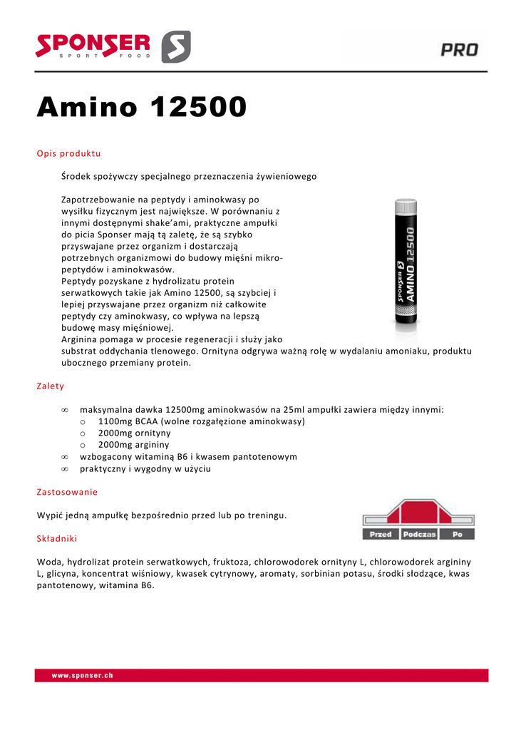 Amino 12500 Opis produktu Środek spożywczy specjalnego przeznaczenia żywieniowego Zapotrzebowanie na peptydy i aminokwasy po wysiłku fizycznym jest największe. W porównaniu z innymi dostępnymi shake’ami, praktyczne ampułki do picia Sponser mają tą zaletę, że są szybko przyswajane przez organizm i dostarczają potrzebnych organizmowi do budowy mięśni mikropeptydów i aminokwasów. Peptydy pozyskane z hydrolizatu protein serwatkowych takie jak Amino 12500, są szybciej i lepiej przyswajane przez organizm niż całkowite peptydy czy aminokwasy, co wpływa na lepszą budowę masy mięśniowej. Arginina pomaga w procesie regeneracji i służy jako substrat oddychania tlenowego. Ornityna odgrywa ważną rolę w wydalaniu amoniaku, produktu ubocznego przemiany protein. Zalety • • • maksymalna dawka 12500mg aminokwasów na 25ml ampułki zawiera między innymi: o 1100mg BCAA (wolne rozgałęzione aminokwasy) o 2000mg ornityny o 2000mg argininy wzbogacony witaminą B6 i kwasem pantotenowym praktyczny i wygodny w użyciu Zastosowanie Wypić jedną ampułkę bezpośrednio przed lub po treningu. Składniki Woda, hydrolizat protein serwatkowych, fruktoza, chlorowodorek ornityny L, chlorowodorek argininy L, glicyna, koncentrat wiśniowy, kwasek cytrynowy, aromaty, sorbinian potasu, środki słodzące, kwas pantotenowy, witamina B6. Amino 12500 Smaki/ Opakowanie /Wartości odżywcze Nienasycone Nasycone Wiśnia. Pudełko 30 ampułek x 25 ml. Wartości odżywcze** na 100 ml Energia kJ (kcal) 1223 (288) Białko 50 g Węglowodany 18.3 g Tłuszcze 0.1 g Witaminy** na 100 ml %ZDS* Kwas pantotenowy 24 mg 400% B6 8 mg 400% * Zalecanego dziennego spożycia ** Wartość średnia Aminokwasy (na 25 ml)** Histydyna 111 mg Izoleucyna 324 mg Leucyna 470 mg Lizyna 551 mg Metionina + Cysteina 227 mg Fenyloalanina + Tyrozyna 237 mg Treonina 415 mg Tryptofan 51 mg Walina 303 mg Alanina 263 mg Arginina 2000 mg Kwas asparaginowy 637 mg Kwas glutaminowy 1087 mg Glicyna 951 mg Prolina 364 mg Seryna 313 mg Ornityna 2000 mg na ampułkę (25 ml) 306 (72) 12.5 g 4.6 g <0.1 g na ampułkę (25 ml) %ZDS* 6 mg 100% 2 mg 100%