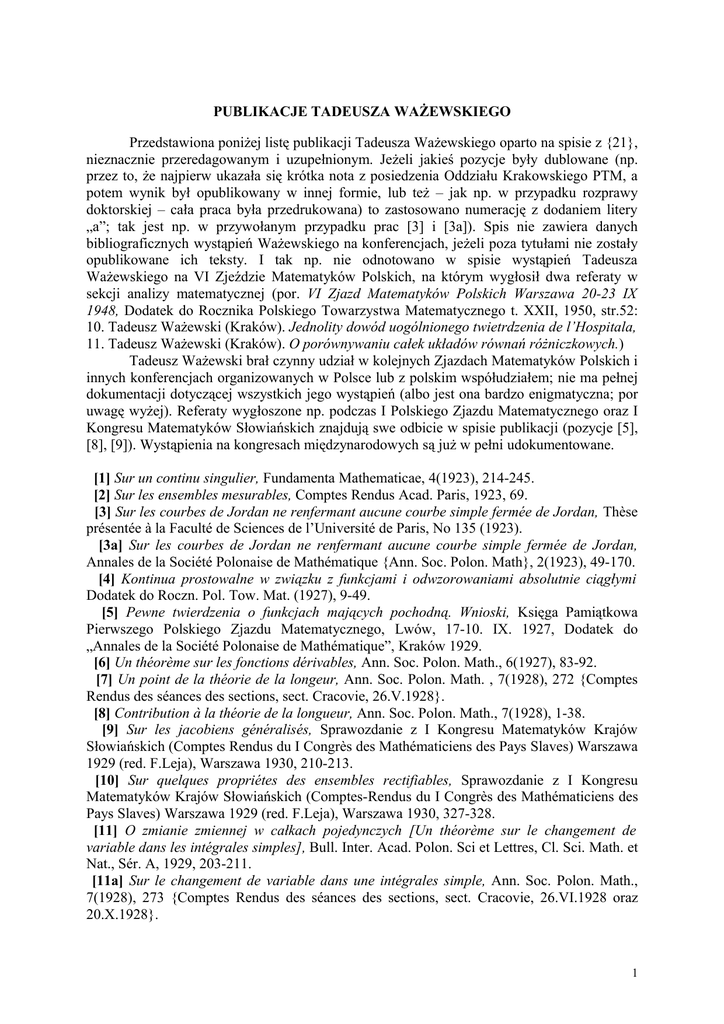 Przedstawiona poniżej listę publikacji Tadeusza Ważewskiego oparto na spisie z {21},