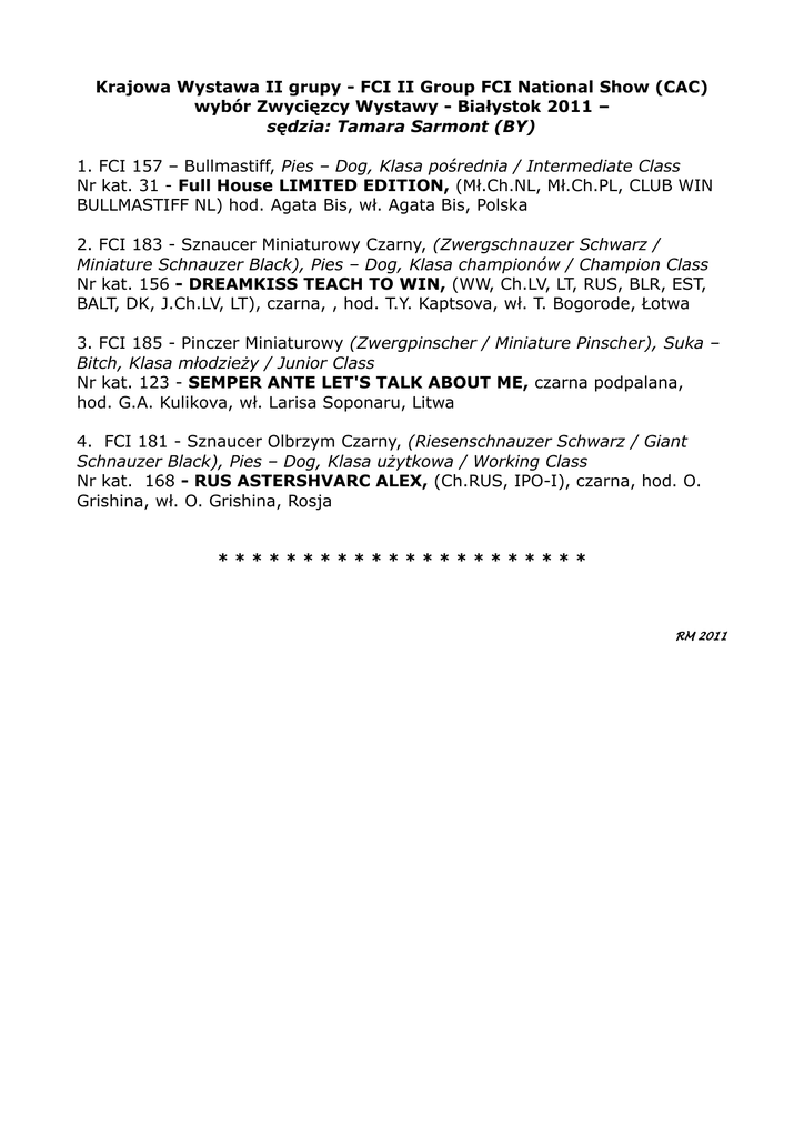 Krajowa Wystawa II grupy - FCI II Group FCI National Show (CAC) wybór Zwycięzcy Wystawy - Białystok 2011 – sędzia: Tamara Sarmont (BY) 1. FCI 157 – Bullmastiff, Pies – Dog, Klasa pośrednia / Intermediate Class Nr kat. 31 - Full House LIMITED EDITION, (Mł.Ch.NL, Mł.Ch.PL, CLUB WIN BULLMASTIFF NL) hod. Agata Bis, wł. Agata Bis, Polska 2. FCI 183 - Sznaucer Miniaturowy Czarny, (Zwergschnauzer Schwarz / Miniature Schnauzer Black), Pies – Dog, Klasa championów / Champion Class Nr kat. 156 - DREAMKISS TEACH TO WIN, (WW, Ch.LV, LT, RUS, BLR, EST, BALT, DK, J.Ch.LV, LT), czarna, , hod. T.Y. Kaptsova, wł. T. Bogorode, Łotwa 3. FCI 185 - Pinczer Miniaturowy (Zwergpinscher / Miniature Pinscher), Suka – Bitch, Klasa młodzieży / Junior Class Nr kat. 123 - SEMPER ANTE LET'S TALK ABOUT ME, czarna podpalana, hod. G.A. Kulikova, wł. Larisa Soponaru, Litwa 4. FCI 181 - Sznaucer Olbrzym Czarny, (Riesenschnauzer Schwarz / Giant Schnauzer Black), Pies – Dog, Klasa użytkowa / Working Class Nr kat. 168 - RUS ASTERSHVARC ALEX, (Ch.RUS, IPO-I), czarna, hod. O. Grishina, wł. O. Grishina, Rosja ********************** RM 2011