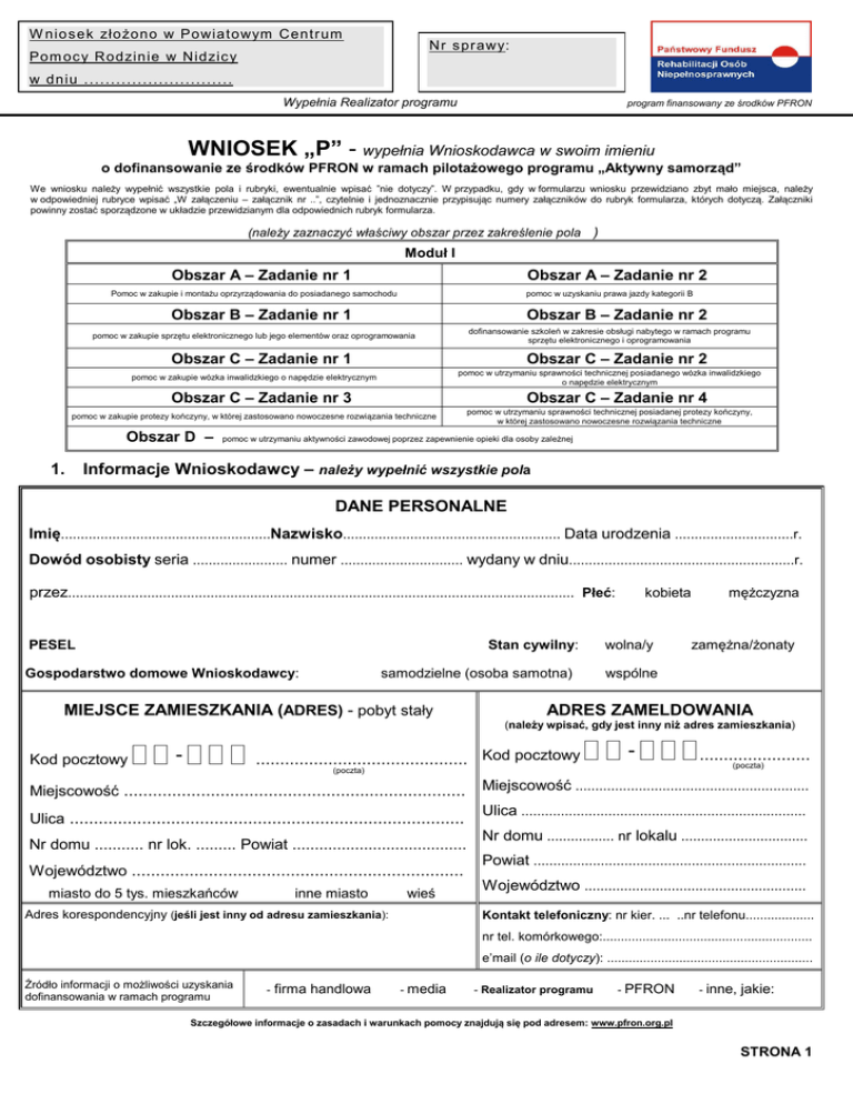 W nios ek złożono w Powiatowym Centr um Nr s pr awy: Pom oc y Rodzinie w Nidzic y w dniu ............................ Wypełnia Realizator programu program finansowany ze środków PFRON WNIOSEK „P” - wypełnia Wnioskodawca w swoim imieniu o dofinansowanie ze środków PFRON w ramach pilotażowego programu „Aktywny samorząd” We wniosku należy wypełnić wszystkie pola i rubryki, ewentualnie wpisać ”nie dotyczy”. W przypadku, gdy w formularzu wniosku przewidziano zbyt mało miejsca, należy w odpowiedniej rubryce wpisać „W załączeniu – załącznik nr ..”, czytelnie i jednoznacznie przypisując numery załączników do rubryk formularza, których dotyczą. Załączniki powinny zostać sporządzone w układzie przewidzianym dla odpowiednich rubryk formularza. (należy zaznaczyć właściwy obszar przez zakreślenie pola ) Moduł I Obszar A – Zadanie nr 1 Obszar A – Zadanie nr 2 Pomoc w zakupie i montażu oprzyrządowania do posiadanego samochodu pomoc w uzyskaniu prawa jazdy kategorii B Obszar B – Zadanie nr 1 Obszar B – Zadanie nr 2 dofinansowanie szkoleń w zakresie obsługi nabytego w ramach programu sprzętu elektronicznego i oprogramowania pomoc w zakupie sprzętu elektronicznego lub jego elementów oraz oprogramowania Obszar C – Zadanie nr 1 Obszar C – Zadanie nr 2 pomoc w utrzymaniu sprawności technicznej posiadanego wózka inwalidzkiego o napędzie elektrycznym pomoc w zakupie wózka inwalidzkiego o napędzie elektrycznym Obszar C – Zadanie nr 3 Obszar C – Zadanie nr 4 pomoc w zakupie protezy kończyny, w której zastosowano nowoczesne rozwiązania techniczne Obszar D – 1. pomoc w utrzymaniu sprawności technicznej posiadanej protezy kończyny, w której zastosowano nowoczesne rozwiązania techniczne pomoc w utrzymaniu aktywności zawodowej poprzez zapewnienie opieki dla osoby zależnej Informacje Wnioskodawcy – należy wypełnić wszystkie pola DANE PERSONALNE Imię.....................................................Nazwisko....................................................... Data urodzenia ..............................r. Dowód osobisty seria ........................ numer ............................... wydany w dniu.........................................................r. przez................................................................................................................................ Płeć: PESEL Stan cywilny: Gospodarstwo domowe Wnioskodawcy: samodzielne (osoba samotna) MIEJSCE ZAMIESZKANIA (ADRES) - pobyt stały kobieta wolna/y mężczyzna zamężna/żonaty wspólne ADRES ZAMELDOWANIA (należy wpisać, gdy jest inny niż adres zamieszkania) Kod pocztowy - ............................................ Kod pocztowy - ....................... (poczta) (poczta) Miejscowość ....................................................................... Miejscowość ........................................................... Ulica .................................................................................. Ulica ........................................................................ Nr domu ........... nr lok. ......... Powiat ....................................... Województwo ..................................................................... miasto do 5 tys. mieszkańców inne miasto wieś Adres korespondencyjny (jeśli jest inny od adresu zamieszkania): Nr domu ................. nr lokalu ................................ Powiat ..................................................................... Województwo ........................................................ Kontakt telefoniczny: nr kier. ... ..nr telefonu................... nr tel. komórkowego:.......................................................... e’mail (o ile dotyczy): ......................................................... Źródło informacji o możliwości uzyskania dofinansowania w ramach programu - firma handlowa - media - Realizator programu - PFRON - inne, jakie: Szczegółowe informacje o zasadach i warunkach pomocy znajdują się pod adresem: www.pfron.org.pl STRONA 1 W n i o s e k „P ” d o t y c zą c y d o f i n a n s o w a n i a w r a m a c h p i l o t a żo w e g o p r o g r a m u „A k t y w n y s a m o r zą d ” STAN PRAWNY DOT. NIEPEŁNOSPRAWNOŚCI całkowita niezdolność do pracy i do samodzielnej egzystencji lub całkowita niezdolność do samodzielnej egzystencji znaczny stopień I grupa inwalidzka całkowita niezdolność do pracy umiarkowany stopień II grupa inwalidzka częściowa niezdolność do pracy lekki stopień III grupa inwalidzka Orzeczenie dot. niepełnosprawności ważne jest: okresowo do dnia: .............................................. bezterminowo RODZAJ NIEPEŁNOSPRAWNOŚCI NARZĄD RUCHU 05-R, w zakresie: obu kończyn górnych jednej kończyny górnej obu kończyn dolnych jednej kończyny dolnej innym Wnioskodawca nie porusza się przy pomocy wózka inwalidzkiego: Wnioskodawca porusza się samodzielnie przy pomocy wózka inwalidzkiego: Wnioskodawca porusza się niesamodzielnie przy pomocy wózka inwalidzkiego: NARZĄD WZROKU 04-O osoba niewidoma Lewe oko: Ostrość wzoru (w korekcji):........................... Prawe oko: Ostrość wzoru (w korekcji):........................... Zwężenie pola widzenia: ................... stopni Zwężenie pola widzenia: .................... stopni osoba głuchoniewidoma INNE PRZYCZYNY niepełnosprawności wynikające z orzeczenia (proszę zaznaczyć właściwy kod/symbol ): 01-U upośledzenie umysłowe 03-L zaburzenia głosu, mowy i choroby słuchu 07-S choroby układu oddechowego i krążenia 09-M choroby układu moczowo płciowego 08-T choroby układu pokarmowego 10-N choroby neurologiczne 11-I inne - OSOBA GŁUCHA 02-P choroby psychiczne 06-E epilepsja 12-C całościowe zaburzenia rozwojowe AKTYWNOŚĆ ZAWODOWA niezatrudniona/y: od dnia:........................................ bezrobotna/y poszukująca/y pracy nie dotyczy zatrudniona/y: od dnia:...