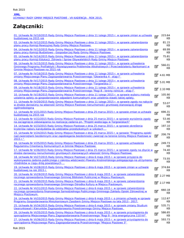 Rok 2015 XML UCHWAŁY RADY GMINY MIEJSCE PIASTOWE - VII KADENCJA - ROK 2015. Załączniki: 01. Uchwała Nr IV/10/2015 Rady Gminy Miejsce Piastowe z dnia 11 lutego 2015 r. w sprawie zmian w uchwale budżetowej na 2015 rok 223.64 KB 03. Uchwała Nr IV/12/2015 Rady Gminy Miejsce Piastowe z dnia 11 lutego 2015 r. w sprawie zatwierdzenia planu pracy Komisji Rewizyjnej Rady Gminy Miejsce Piastowe 81.15 KB 04. Uchwała Nr IV/13/2015 Rady Gminy Miejsce Piastowe z dnia 11 lutego 2015 r. w sprawie zatwierdzenia planu pracy Komisji Budżetowo - Gospodarczej Rady Gminy Miejsce Piastowe 69.99 KB 05. Uchwała Nr IV/14/2015 Rady Gminy Miejsce Piastowe z dnia 11 lutego 2015 r. w sprawie zatwierdzenia planu pracy Komisji Edukacji, Zdrowia i Spraw Obywatelskich Rady Gminy Miejsce Piastowe 75.81 KB 06. Uchwała Nr IV/15/2015 Rady Gminy Miejsce Piastowe z dnia 11 lutego 2015 r. w sprawie uchwalenia Gminnego Programu Profilaktyki i Rozwiązywania Problemów Alkoholowych i Przeciwdziałaniu Narkomanii w Gminie Miejsce Piastowe na 2015 rok 566.01 KB 07. Uchwała Nr IV/16/2015 Rady Gminy Miejsce Piastowe z dnia 11 lutego 2015 r. w sprawie uchwalenia zmiany Miejscowego Planu Zagospodarowania Przestrzennego "Głowienka 4 - etap I" 4.61 MB 08. Uchwała Nr IV/17/2015 Rady Gminy Miejsce Piastowe z dnia 11 lutego 2015 r. w sprawie uchwalenia zmiany Miejscowego Planu Zagospodarowania Przestrzennego "Targowiska 1" 5.01 MB 09. Uchwała Nr IV/18/2015 Rady Gminy Miejsce Piastowe z dnia 11 lutego 2015 r. w sprawie uchwalenia zmiany Miejscowego Planu Zagospodarowania Przestrzennego "Rogi 8 - tereny rolnicze - etap I" 2.33 MB 10. Uchwała Nr IV/19/2015 Rady Gminy Miejsce Piastowe z dnia 11 lutego 2015 r. w sprawie wyboru metody ustalenia opłaty za gospodarowanie odpadami komunalnymi oraz ustalenia stawki takiej opłaty. 105.90 KB 11. Uchwała Nr IV/20/2015 Rady Gminy Miejsce Piastowe z dnia 11 lutego 2015 r. w sprawie zgody na nabycie w drodze darowizny na własność Gminy Miejsce Piastowe nieruchomości gruntowej stanowiącej drogę ogólnodostępną 53.07 KB 12. Uchwała Nr V/21/2015 Rady Gminy Miejsce Piastowe z dnia 25 marca 2015 r. w sprawie zmian w uchwale budżetowej na 2015 rok 696.31 KB 13. Uchwała Nr V/22/2015 Rady Gminy Miejsce Piastowe z dnia 25 marca 2015 r. w sprawie wyrażenia zgody na zaciągnięcie zobowiązania na realizację zadania pn. "Projekt wodociągu w Targowiskach" 53.46 KB 14. Uchwała Nr V/23/2015 Rady Gminy Miejsce Piastowe z dnia 25 marca 2015 r. w sprawie określenia kryteriów naboru kandydatów do oddziałów przedszkolnych w szkołach ... 197.10 KB 15. Uchwała Nr V/24/2015 Rady Gminy Miejsce Piastowe z dnia 25 marca 2015 r. w sprawie "Programu opieki nad zwierzętami bezdomnymi oraz zapobiegania bezdomności zwierząt na terenie Gminy Miejsce Piastowe w 2015 r." 206.79 KB 16. Uchwała Nr V/25/2015 Rady Gminy Miejsce Piastowe z dnia 25 marca 2015 r. w sprawie uchwalenia Regulaminu Cmentarzy Komunalnych w Gminie Miejsce Piastowe 249.73 KB 17. Uchwała Nr V/26/2015 Rady Gminy Miejsce Piastowe z dnia 25 marca 2015 r. w sprawie zgody na zbycie w drodze darowizny nieruchomości gruntowych stanowiących własność Gminy Miejsce Piastowe 74.40 KB 18. Uchwała Nr VI/27/2015 Rady Gminy Miejsce Piastowe z dnia 6 maja 2015 r. w sprawie przyjęcia do wykonywania zadania publicznego z zakresu właściwości Powiatu Krośnieńskiego polegającego na utrzymaniu chodników w ciągu dróg powiatowych ... 73.55 KB 19. Uchwała Nr VI/28/2015 Rady Gminy Miejsce Piastowe z dnia 6 maja 2015 r. w sprawie zmian w uchwale budżetowej na rok 2015 r. 374.84 KB 20. Uchwała Nr VI/29/2015 Rady Gminy Miejsce Piastowe z dnia 6 maja 2015 r. w sprawie zatwierdzenia rocznego sprawozdania finansowego Gminnej Biblioteki Publicznej w Miejscu Piastowym. 2.27 MB 21. Uchwała Nr VI/30/2015 Rady Gminy Miejsce Piastowe z dnia 6 maja 2015 r. w sprawie zatwierdzenia rocznego sprawozdania finansowego Gminnego Ośrodka Kultury w Miejscu Piastowym. 2.17 MB 22. Uchwała Nr VI/31/2015 Rady Gminy Miejsce Piastowe z dnia 6 maja 2015 r. w sprawie zatwierdzenia rocznego sprawozdania finansowego Samodzielnego Publicznego Gminnego Zakładu Opieki Zdrowotnej w Miejscu Piastowym. 660.18 KB 24. Uchwała Nr VI/33/2015 Rady Gminy Miejsce Piastowe z dnia 6 maja 2015 r. o zmianie uchwały w sprawie Programu Gospodarowania Mieszkaniowym Zasobem Gminy Miejsce Piastowe na lata 2013 - 2017. 112.67 KB 25. Uchwała Nr VI/34/2015 Rady Gminy Miejsce Piastowe z dnia 6 maja 2015 r. w sprawie zmiany Studium Uwarunkowań i Kierunków Zagospodarowania Przestrzennego Gminy Miejsce Piastowe. 535.71 KB 26. Uchwała Nr VI/35/2015 Rady Gminy Miejsce Piastowe z dnia 6 maja 2015 r. w sprawie przystąpienia do sporządzenia Miejscowego Planu Zagospodarowania Przestrzennego "Rogi 9 - linia energetyczna 110 kV" 586.65 KB 27. Uchwała Nr VI/36/2015 Rady Gminy Miejsce Piastowe z dnia 6 maja 2015 r. w sprawie przystąpienia do sporządzenia Miejscowego Planu Zagospodarowania Przestrzennego "Miejsce Piastowe 3" 593.73 KB Rok 2015 Rok 2015 28. Uchwała Nr VI/37/2015 Rady Gminy Miejsce Piastowe z dnia 6 maja 2015 r. w sprawie wyboru przedstawicieli do Rady Społecznej Samodzielnego Publicznego Gminnego Zakładu Opieki Zdrowotnej w Miejscu Piastowym. 81.94 KB 29. Uchwała Nr VI/38/2015 Rady Gminy Miejsce Piastowe z dnia 6 maja 2015 r. w sprawie wskazania wstępnego miejsca lokalizacji nowego przystanku komunikacyjnego przy drodze gminnej nr 114974R w sołectwie Zalesie. 87.24 KB 32. Uchwała Nr VII/41/2015 Rady Gminy Miejsce Piastowe z dnia 2 czerwca 2015 r. w sprawie rozpatrzenia i zatwierdzenia sprawozdania finansowego Gminy Miejsce Piastowe za 2014 rok wraz ze sprawozdaniem z wykonania budżetu za 2014 rok. 36.53 KB 33. Uchwała Nr VII/42/2015 Rady Gminy Miejsce Piastowe z dnia 2 czerwca 2015 r. w sprawie udzielenia absolutorium Wójtowi Gminy Miejsce Piastowe za 2014 rok. 41.62 KB 34. Uchwała Nr VII/43/2015 Rady Gminy Miejsce Piastowe z dnia 2 czerwca 2015 r. w sprawie zmi