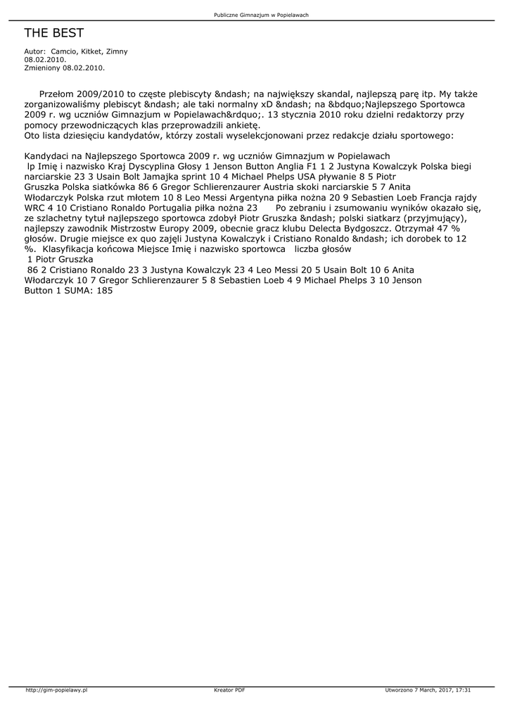 Publiczne Gimnazjum w Popielawach THE BEST Autor: Camcio, Kitket, Zimny 08.02.2010. Zmieniony 08.02.2010. Przełom 2009/2010 to częste plebiscyty – na największy skandal, najlepszą parę itp. My także zorganizowaliśmy plebiscyt – ale taki normalny xD – na „Najlepszego Sportowca 2009 r. wg uczniów Gimnazjum w Popielawach”. 13 stycznia 2010 roku dzielni redaktorzy przy pomocy przewodniczących klas przeprowadzili ankietę. Oto lista dziesięciu kandydatów, którzy zostali wyselekcjonowani przez redakcje działu sportowego: Kandydaci na Najlepszego Sportowca 2009 r. wg uczniów Gimnazjum w Popielawach lp Imię i nazwisko Kraj Dyscyplina Głosy 1 Jenson Button Anglia F1 1 2 Justyna Kowalczyk Polska biegi narciarskie 23 3 Usain Bolt Jamajka sprint 10 4 Michael Phelps USA pływanie 8 5 Piotr Gruszka Polska siatkówka 86 6 Gregor Schlierenzaurer Austria skoki narciarskie 5 7 Anita Włodarczyk Polska rzut młotem 10 8 Leo Messi Argentyna piłka nożna 20 9 Sebastien Loeb Francja rajdy WRC 4 10 Cristiano Ronaldo Portugalia piłka nożna 23 Po zebraniu i zsumowaniu wyników okazało się, ze szlachetny tytuł najlepszego sportowca zdobył Piotr Gruszka – polski siatkarz (przyjmujący), najlepszy zawodnik Mistrzostw Europy 2009, obecnie gracz klubu Delecta Bydgoszcz. Otrzymał 47 % głosów. Drugie miejsce ex quo zajęli Justyna Kowalczyk i Cristiano Ronaldo – ich dorobek to 12 %. Klasyfikacja końcowa Miejsce Imię i nazwisko sportowca liczba głosów 1 Piotr Gruszka 86 2 Cristiano Ronaldo 23 3 Justyna Kowalczyk 23 4 Leo Messi 20 5 Usain Bolt 10 6 Anita Włodarczyk 10 7 Gregor Schlierenzaurer 5 8 Sebastien Loeb 4 9 Michael Phelps 3 10 Jenson Button 1 SUMA: 185 http://gim-popielawy.pl Kreator PDF Utworzono 7 March, 2017, 17:31