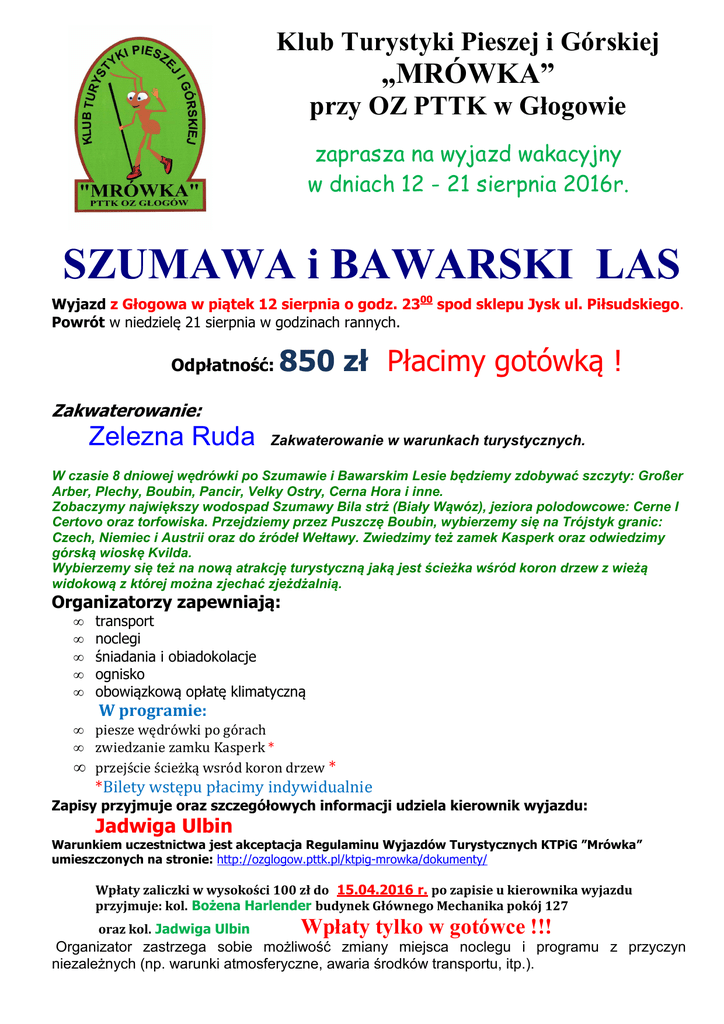 Klub Turystyki Pieszej i Górskiej „MRÓWKA” przy OZ PTTK w Głogowie zaprasza na wyjazd wakacyjny w dniach 12 - 21 sierpnia 2016r. SZUMAWA i BAWARSKI LAS Wyjazd z Głogowa w piątek 12 sierpnia o godz. 2300 spod sklepu Jysk ul. Piłsudskiego. Powrót w niedzielę 21 sierpnia w godzinach rannych. Odpłatność: 850 zł Płacimy gotówką ! Zakwaterowanie: Zelezna Ruda Zakwaterowanie w warunkach turystycznych. W czasie 8 dniowej wędrówki po Szumawie i Bawarskim Lesie będziemy zdobywać szczyty: Großer Arber, Plechy, Boubin, Pancir, Velky Ostry, Cerna Hora i inne. Zobaczymy największy wodospad Szumawy Bila strż (Biały Wąwóz), jeziora polodowcowe: Cerne I Certovo oraz torfowiska. Przejdziemy przez Puszczę Boubin, wybierzemy się na Trójstyk granic: Czech, Niemiec i Austrii oraz do źródeł Wełtawy. Zwiedzimy też zamek Kasperk oraz odwiedzimy górską wioskę Kvilda. Wybierzemy się też na nową atrakcję turystyczną jaką jest ścieżka wśród koron drzew z wieżą widokową z której można zjechać zjeżdżalnią. Organizatorzy zapewniają: • • • • • transport noclegi śniadania i obiadokolacje ognisko obowiązkową opłatę klimatyczną W programie: • • piesze wędrówki po górach zwiedzanie zamku Kasperk * • przejście ścieżką wsród koron drzew * *Bilety wstępu płacimy indywidualnie Zapisy przyjmuje oraz szczegółowych informacji udziela kierownik wyjazdu: Jadwiga Ulbin Warunkiem uczestnictwa jest akceptacja Regulaminu Wyjazdów Turystycznych KTPiG ”Mrówka” umieszczonych na stronie: http://ozglogow.pttk.pl/ktpig-mrowka/dokumenty/ Wpłaty zaliczki w wysokości 100 zł do 15.04.2016 r. po zapisie u kierownika wyjazdu przyjmuje: kol. Bożena Harlender budynek Głównego Mechanika pokój 127 oraz kol. Jadwiga Ulbin Wpłaty tylko w gotówce !!! Organizator zastrzega sobie możliwość zmiany miejsca noclegu i programu z przyczyn niezależnych (np. warunki atmosferyczne, awaria środków transportu, itp.). Szumawa – wypoczynek na zielonym dachu Europy Położenie Szumawy na mapie Czech Miłośników aktywnego wypoczynku zapraszamy do odkrywania pięknego regionu Czech, Szumawy, nazywanego ze względu na swe położenie i przyrodę zielonym dachem Europy. Pasmo górskie położone jest na pograniczu Czech, Niemiec i Austrii. Ze względu na obecność torfowisk, jezior polodowcowych i wspaniałych lasów utworzony na jej terenie został Park Narodowy. Park był przez długie lata obszarem strzeżonym, na który ludzie nie mieli wstępu. Dzięki temu tutejsza natura jest dziś tak unikatowo piękna i czysta. Z uwagi na wyjątkowość na skalę europejską, Park Narodowy Szumawa został wpisany na listę obszarów chronionych jako rezerwat biosfery UNESCO. Mimo dziewiczej natury znajdują się tutaj ośrodki sportowe zimowe i letnie. Znajduje się również wiele zabytków architektury ludowej. Najwyższym szczytem jest położony po stronie niemieckiej Großer Arber (1457 m n.p.m.), najwyższym szczytem po stronie czeskiej i austriackiej jest graniczny wierzchołek Plechý/Plöckenstein (1378 m n.p.m.). Po niemieckiej i austriackiej stronie pasmo nosi nazwę Las Bawarski. Nową atrakcją turystyczną jest niezwykła ścieżka wiodąca wśród koron drzew, jedyna w swoim rodzaju w Czechach. Trasa oferuje wspaniałe widoki na piękną, szumawską przyrodę, jezioro Lipno i Góry Novohradskie. Długość trasy wynosi 675 metrów, po drodze znajdziemy tablice z informacjami o ciekawostkach przyrodniczych w okolicy.Bezpieczeństwo turystów zapewnia solidna, drewniana konstrukcja podpierana przez 75 słupów, poręcze i siatka z obu stron ścieżki. Na końcu trasy znajduje się 40-metrowa wieża widokowa, z której rozciąga się fantastyczny widok. Dodatkową atrakcją jest 52-metrowa zjeżdżalnia, najdłuższa w swoim rodzaju w Czechach, prowadząca przez środek wieży widokowej, z wysokości 24 metrów. Ścieżka leży na szczycie góry Kramolín. Cena biletu indywidualnie: Normalny 190 CZK , Ulgowy 120 CZ Grupowy 120 CZK