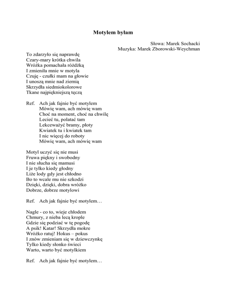 Motylem byłam Słowa: Marek Sochacki Muzyka: Marek Zborowski-Weychman To zdarzyło się naprawdę Czary-mary krótka chwila WróŜka pomachała róŜdŜką I zmieniła mnie w motyla Czuję - czułki mam na głowie I unoszą mnie nad ziemią Skrzydła siedmiokolorowe Tkane najpiękniejszą tęczą Ref. Ach jak fajnie być motylem Mówię wam, ach mówię wam Choć na moment, choć na chwilę Lecieć tu, polatać tam LekcewaŜyć bramy, płoty Kwiatek tu i kwiatek tam I nic więcej do roboty Mówię wam, ach mówię wam Motyl uczyć się nie musi Fruwa piękny i swobodny I nie słucha się mamusi I je tylko kiedy głodny LiŜe lody gdy jest chłodno Bo to wcale mu nie szkodzi Dzięki, dzięki, dobra wróŜko Dobrze, dobrze motylowi Ref. Ach jak fajnie być motylem… Nagle - co to, wieje chłodem Chmury, z nieba lecą krople Gdzie się podziać w tę pogodę A psik! Katar! Skrzydła mokre WróŜko ratuj! Hokus – pokus I znów zmieniam się w dziewczynkę Tylko kiedy słonko świeci Warto, warto być motylkiem Ref. Ach jak fajnie być motylem…