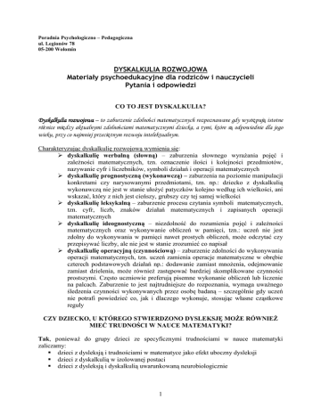 Poradnia Psychologiczno – Pedagogiczna ul. Legionów 78 05-200 Wołomin DYSKALKULIA ROZWOJOWA Materiały psychoedukacyjne dla rodziców i nauczycieli Pytania i odpowiedzi CO TO JEST DYSKALKULIA? Dyskalkulia rozwojowa – to zaburzenie zdolności matematycznych rozpoznawane gdy występują istotne róŜnice między aktualnymi zdolnościami matematycznymi dziecka, a tymi, które są odpowiednie dla jego wieku, przy co najmniej przeciętnym rozwoju intelektualnym. Charakteryzując dyskalkulię rozwojową wymienia się: dyskalkulię werbalną (słowną) – zaburzenia słownego wyraŜania pojęć i zaleŜności matematycznych, tzn. oznaczenie ilości i kolejności przedmiotów, nazywanie cyfr i liczebników, symboli działań i operacji matematycznych dyskalkulię prognostyczną (wykonawczą) – zaburzenia na poziomie manipulacji konkretami czy narysowanymi przedmiotami, tzn. np.: dziecko z dyskalkulią wykonawczą nie jest w stanie ułoŜyć patyczków kolejno według ich wielkości, ani wskazać, który z nich jest cieńszy, grubszy czy tej samej wielkości dyskalkulię leksykalną – zaburzenie procesu czytania symboli matematycznych, tzn. cyfr, liczb, znaków działań matematycznych i zapisanych operacji matematycznych dyskalkulię ideognostyczną – niezdolność do rozumienia pojęć i zaleŜności matematycznych oraz wykonywanie obliczeń w pamięci, tzn.: uczeń nie jest zdolny do wykonywania w pamięci nawet prostych obliczeń, moŜe odczytać czy przepisywać liczby, ale nie jest w stanie zrozumieć co napisał dyskalkulię operacyjną (czynnościową) – zaburzenie zdolności do wykonywania operacji matematycznych, tzn. uczeń zamienia operacje matematyczne w obrębie czterech podstawowych działań np.: dodawanie zamiast mnoŜenia, odejmowanie zamiast dzielenia, moŜe równieŜ zastępować bardziej skomplikowane czynności prostszymi. Często uczniowie preferują pisemne wykonanie obliczeń lub liczenie na palcach. Zaburzenie to jest najtrudniejsze do rozpoznania, wymaga uwaŜnego śledzenia czynności wykonywanych przez osobę badaną – szczególnie gdy uczeń nie potrafi powiedzieć co, jak i dlaczego wykonuje, stosując własne cząstkowe reguły CZY DZIECKO, U KTÓREGO STWIERDZONO DYSLEKSJĘ MOśE RÓWNIEś MIEĆ TRUDNOŚCI W NAUCE MATEMATYKI? Tak, poniewaŜ do grupy dzieci ze specyficznymi trudnościami w nauce matematyki zaliczamy: dzieci z dysleksją i trudnościami w matematyce jako efekt uboczny dysleksji dzieci z dyskalkulią w izolowanej postaci dzieci z dysleksją i dyskalkulią uwarunkowaną neurobiologicznie 1 KRYTERIA DIAGNOSTYCZNE JAK MOGĄ ROZPOZNAĆ DYSKALKULIĘ RODZICE I NAUCZYCIELE? ⇒ zdolności matematyczne są istotnie poniŜej dobrych moŜliwości ⇒ ⇒ ⇒ ⇒ intelektualnych dziecka oraz odpowiadającym wiekowi poziomem edukacji, tzn. dziecko o prawidłowym rozwoju intelektualnym ma powaŜne problemy w nauce matematyki zakłócenia te znacząco zaburzają osiągnięcia szkolne oraz czynności dnia codziennego, wymagające korzystania z umiejętności matematycznych (j.w.) występują trudności w nauce matematyki pomimo sprzyjających warunków edukacyjnych występują trudności w nauce matematyki, mimo iŜ nie stwierdza się wad wrodzonych, zaburzeń neurologicznych ani psychicznych, które mogłyby niekorzystnie wpłynąć na proces uczenia się matematyki zaburzenia matematyczne mogą współwystępować z deficytami sensorycznymi, podobnie jak w przypadku dysleksji1 NA CZYM POLEGA DIAGNOZA DYSKALKULII W PORADNI PSYCHOLOGICZNO - PEDAGOGICZNEJ? W Poradni przeprowadza się: a. badanie psychologiczne mające na celu potwierdzenie, iŜ zdolności dziecka znajdują się na poziomie co najmniej przeciętnym, określenie poziomu poszczególnych funkcji poznawczych, w tym umiejętności arytmetycznych oraz funkcji percepcyjnych mających istotny wpływ na powodzenie w nauce matematyki; b. badanie umiejętności arytmetycznych, które przeprowadzi psycholog lub pedagog (sprawdziany znajomości podstaw programowych z matematyki na danym etapie nauczania, specjalistyczne testy) mające na celu określenie poziomu wiadomości z matematyki oraz ilorazu matematycznego; c. wspólne ustalenie wskazówek postdiagnostycznych, tzn. wnioskowanie o etiologii obserwowanych nieprawidłowości, opracowanie zaleceń dla rodziców i szkoły realizowanych np. w trakcie zajęć wspomagających rozwój umysłowy dziecka i kształtujących system wiadomości i umiejętności matematycznych; d. sporządzenie opinii w sprawie specyficznych trudności w nauce matematyki. 1 Zob: kryteria diagnostyczne w klasyfikacji ICD-10 pozycja nr F 81.2 specyficzne zaburzenia umiejętności matematycznych oraz w klasyfikacji DSM – IV pozycja nr 315.1 zaburzenia matematyczne. 2 CO MOśE ZROBIĆ PORADNIA PSYCHOLOGICZNO – PEDAGOGICZNA, ABY POMÓC DZIECKU MAJĄCEMU TRUDNOŚCI W NAUCE MATEMATYKI? Pierwszym krokiem jest: diagnoza, którą przeprowadzają: psycholog, który ma pod opieką szkołę, do której uczęszcza uczeń; pedagog - mgr Agnieszka Banaszek (wszystkie szkoły ze swojego rejonu: szkoły podstawowe, gimnazja, szkoły średnie w Gminie Radzymin i Dąbrówka oraz gimnazja w Gminie Wołomin i Poświętne); pedagog - mgr Marta Kielak (szkoły podstawowe w Gminie Wołomin i Poświętne); Drugim krokiem jest: rozwijanie kompetencji matematycznych uczniów- zajęcia prowadzi dyrektor Poradni mgr Mariola Kacprzak CO MOśE ZROBIĆ SZKOŁA, ABY POMÓC DZIECKU MAJĄCEMU TRUDNOŚCI W NAUCE MATEMATYKI? jeŜeli jest taka moŜliwość naleŜy zapewnić uczniowi zajęcia wyrównawcze (terapeutyczne) z matematyki w szkole; wykonywanie dodatkowych kart pracy z matematyki niezaleŜnie od tego, co jest aktualnie omawiane na lekcji, tzn, naleŜy stopniować trudność, od rzeczy prostych dla ucznia do coraz trudniejszy, ale tak, aby go nie zrazić do nauki matematyki; wsparcie, dodatkowa pomoc dla ucznia w czasie lekcji, wytłumaczenie niezrozumiałych treści. W JAKI SPOSÓB MOśNA ZAPEWN