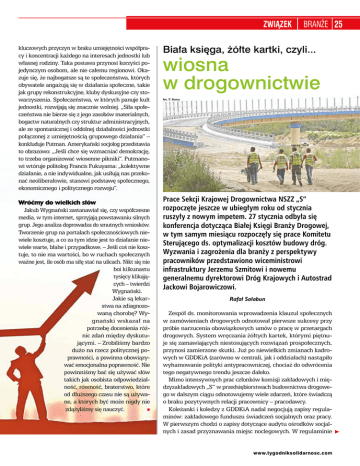 Związek Wróćmy do wielkich słów Jakub Wygnański zastanawiał się, czy współczesne media, w tym internet, sprzyjają powstawaniu silnych grup. Jego analiza doprowadza do smutnych wniosków. Tworzenie grup na portalach społecznościowych niewiele kosztuje, a co za tym idzie jest to działanie niewiele warte, błahe i przypadkowe. – Jeśli coś nie kosztuje, to nie ma wartości, bo w ruchach społecznych ważne jest, ile osób ma siłę stać na ulicach. Nikt się nie boi kilkunastu tysięcy klikających – twierdzi Wygnański. Jakie są lekarstwa na zdiagnozowaną chorobę? Wygnański wskazał na potrzebę docenienia różnic zdań między dyskutującymi. – Zrobiliśmy bardzo dużo na rzecz politycznej poprawności, a powinna obowiązywać emocjonalna poprawność. Nie powinniśmy bać się używać słów takich jak osobista odpowiedzialność, równość, braterstwo, które od dłuższego czasu nie są używane, a których być może nigdy nie zdążyliśmy się nauczyć. n 25 Biała księga, żółte kartki, czyli... wiosna w drogownictwie fot. T. Gutry Prace Sekcji Krajowej Drogownictwa NSZZ „S” rozpoczęte jeszcze w ubiegłym roku od stycznia ruszyły z nowym impetem. 27 stycznia odbyła się konferencja dotycząca Białej Księgi Branży Drogowej, w tym samym miesiącu rozpoczęły się prace Komitetu Sterującego ds. optymalizacji kosztów budowy dróg. Wyzwania i zagrożenia dla branży z perspektywy pracowników przedstawiono wiceministrowi infrastruktury Jerzemu Szmitowi i nowemu generalnemu dyrektorowi Dróg Krajowych i Autostrad Jackowi Bojarowiczowi. Rafał Sałabun Zespół ds. monitorowania wprowadzenia klauzul społecznych w zamówieniach drogowych odnotował pierwsze sukcesy przy próbie narzucenia obowiązkowych umów o pracę w przetargach drogowych. System wręczania żółtych kartek, którymi piętnuje się zamawiających niestosujących rozwiązań prospołecznych, przynosi zamierzone skutki. Już po niewielkich zmianach kadrowych w GDDKiA (zarówno w centrali, jak i oddziałach) nastąpiło wyhamowanie polityki antypracowniczej, chociaż do odwrócenia tego negatywnego trendu jeszcze daleko. Mimo intensywnych prac członków komisji zakładowych i międzyzakładowych „S” w przedsiębiorstwach budownictwa drogowego w dalszym ciągu odnotowujemy wiele zdarzeń, które świadczą o braku pozytywnych relacji pracownicy – pracodawcy. Koleżanki i koledzy z GDDKiA nadal negocjują zapisy regulaminów: zakładowego funduszu świadczeń socjalnych oraz pracy. W pierwszym chodzi o zapisy dotyczące audytu ośrodków socjalnych i zasad przyznawania miejsc noclegowych. W regulaminie www.tygodniksolidarnosc.com kluczowych przyczyn w braku umiejętności współpracy i koncentracji każdego na interesach jednostki lub własnej rodziny. Taka postawa przynosi korzyści pojedynczym osobom, ale nie całemu regionowi. Okazuje się, że najbogatsze są te społeczeństwa, których obywatele angażują się w działania społeczne, takie jak grupy rekonstrukcyjne, kluby dyskusyjne czy stowarzyszenia. Społeczeństwa, w których panuje kult jednostki, rozwijają się znacznie wolniej. „Siła społeczeństwa nie bierze się z jego zasobów materialnych, bogactw naturalnych czy struktur administracyjnych, ale ze spontanicznej i oddolnej działalności jednostki połączonej z umiejętnością grupowego działania” – konkluduje Putman. Amerykański socjolog przedstawia to obrazowo: „Jeśli chce się wzmacniać demokrację, to trzeba organizować wiosenne pikniki”. Putmanowi wtóruje politolog Francis Fukuyama: „kolektywne działanie, a nie indywidualne, jak usiłują nas przekonać neoliberałowie, stanowi podstawę społecznego, ekonomicznego i politycznego rozwoju”. | branże 26 Związek | branże pracy wiele kontrowersji wzbudza zaproponowany przez pracodawcę paragraf dotyczący czasu pracy – to dlatego podpisanie regulaminu oddala się w czasie. Biała Księga Branży Drogowej a sprawy pracownicze Istotą zaangażowania się naszej sekcji w opracowanie i promowanie tego dokumentu jest zagwarantowanie praw pracowników drogownictwa do godziwej płacy i europejskich standardów pracy, wykazania pozytywnej korelacji pomiędzy działaniami propracowniczymi a zyskami społeczno-ekonomicznymi państwa i przedsiębiorców. Najważniejszy postulat sekcji to wprowadzenie do rozstrzygnięć przetargowych zasady, że oferta jest odrzucona, gdy wykonawca nie zapewni wszystkim zatrudnionym przy realizacji zamówienia wynagrodzenia nie niższego niż minimalne, bez względu na podstawę prawną zatrudnienia. Jeśli na to pozwalają uwarunkowania, należy wprowadzić do Specyfikacji Istotnych Warunków Zamówienia (SIWZ) wymóg zatrudnienia na podstawie umowy o pracę. W przypadku, gdy zamówienie dotyczy outsourcingu zadań GDDKiA, nakaz zawierania umów o pracę musi być obligatoryjnie wprowadzony. Gdy dominującym kryterium oceny ofert jest cena, konsekwencją jest preferowanie wykonawców, którzy nie posiadają historii podatkowej w naszym kraju, nie ponoszą kosztów utrzymania majątku ruchomego i nieruchomości związanych z procesem budowlanym, nie zatrudniają pracowników i nie są objęci obciążeniami wynikłymi z tego tytułu. Taka sytuacja sprawia, że firmy, które budowały swój potencjał w oparciu o krajowe zasoby z myślą o rozwoju, a nie spekulacji finansowej, nie mają równych szans. Polityka najniższej ceny rozmontowała prawa pracownicze – przedsiębiorcy konkurowali kosztami pracy i na takie działanie mieli przyzwolenie wywodzącego się z poprzednich wyborów kierownictwa instytucji rządowych (ministerstwa, Urzędu Zamówień Publicznych, GDDKiA). W Białej Księdze Branży Drogowej zwrócimy uwagę na problem kompetencji dyrektora oddziału GDDKiA, które po 2008 roku zostały drastycznie zmniejszone. Na pozór jest to sprawa wtórna w stosunku do polityki prowadzonej przez generalnego dyrektora Dróg Krajowych i Autostrad