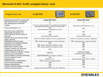 Sterowniki G-422 i G-425: przegląd funkcji i cech Przegląd funkcji i cech Dostępność sterownika w zespole ZPS Ilość czujników temp. w standardzie Ilość obsługiwanych schematów instalacji G-422-P04 G-425-P01 Zespół ZPS 18e-01 4 17 Zespół ZPS 18a-01 3 (w tym m.in. szeregowe podgrzewacze, podgrzew wody basenowej, wspomaganie ogrzewania c.o., kolektory „wschód-zachód”) (standardowy układ podgrzewania c.w.u.) Pompa cyrkulacyjna c.w.u. TAK (w tym tryb przerywany „taktowanie” co 10 min.) Sterowanie pracą kotła/pompy ciepła/grzałki dla potrzeb c.w.u. Płynna regulacja obrotów pompy ob. solarnego Algorytm sterowania obrotami pompy obiegu solarnego Wyświetlanie schematu pracy Obliczanie mocy chwilowej kolektora Zestawienie mocy średniej Bilansowanie uzysków ciepła Programy czasowe (np. dla pompy cyrkulacyjnej, pracy kotła, itp.) Nastawa natężenia przepływu w obiegu solarnym (przy uruchomieniu) Pomiar przepływu czynnika grzewczego Ochrona kolektorów przed przegrzewaniem Chłodzenie wody w podgrzewaczu Ochrona przed zamarzaniem Wygrzew antybakteryjny Kontrola obecności przepływu w obiegu solarnym (ochrona pompy) TAK 1 NIE NIE TAK TAK (dla wybranego zakresu obrotów) (w pełnym zakresie obrotów) Pomiar T w baterii kolektorów i wody w podgrzewaczu Pomiar T na zasilaniu i powrocie z wężownicy TAK (animacja stanów roboczych – praca i temperatury) TAK TAK (dobowa, tygodniowa, miesięczna, roczna) TAK (dobowe, tygodniowe, miesięczne, roczne) TAK (sygnalizacja pracy – diody na schemacie) NIE NIE NIE TAK NIE RĘCZNA AUTOMATYCZNA (niezależnie od ilości kolektorów) ELEKTRONICZNY (lub wpisany z rotametru) TAK NIE TAK (przegrzew c.w.u.) (ochrona instalacji, gdy T1≥120oC i T3≥85oC) TAK (tryb nocny lub funkcja urlopowa) TAK TAK TAK (zarówno przy pomiarze elektronicznym, jak i z rotametrem) NIE NIE NIE TAK