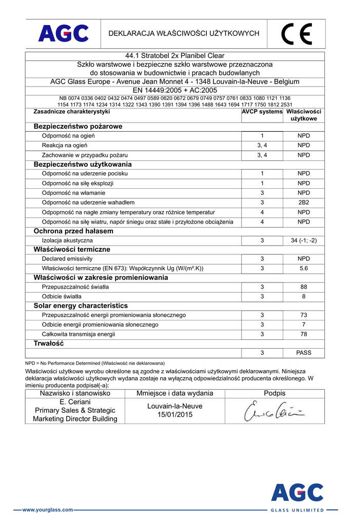DEKLARACJA WŁAŚCIWOŚCI UŻYTKOWYCH 44.1 Stratobel 2x Planibel Clear Szkło warstwowe i bezpieczne szkło warstwowe przeznaczona do stosowania w budownictwie i pracach budowlanych AGC Glass Europe - Avenue Jean Monnet 4 - 1348 Louvain-la-Neuve - Belgium EN 14449:2005 + AC:2005 NB 0074 0336 0402 0432 0474 0497 0589 0620 0672 0679 0749 0757 0761 0833 1080 1121 1136 1154 1173 1174 1234 1314 1322 1343 1390 1391 1394 1396 1488 1643 1694 1717 1750 1812 2531 Zasadnicze charakterystyki AVCP systems Właściwości użytkowe Bezpieczeństwo pożarowe Odporność na ogień 1 NPD Reakcja na ogień 3, 4 NPD Zachowanie w przypadku pożaru 3, 4 NPD Odporność na uderzenie pocisku 1 NPD Odporność na siłę eksplozji 1 NPD Odporność na włamanie 3 NPD Odporność na uderzenie wahadłem 3 2B2 Odpoprność na nagłe zmiany temperatury oraz różnice temperatur 4 NPD Odporność na siłę wiatru, napór śniegu oraz stałe i przyłożone obciążenia 4 NPD 3 34 (-1; -2) Declared emissivity 3 NPD Właściwości termiczne (EN 673): Współczynnik Ug (W/(m².K)) 3 5.6 Przepuszczalność światła 3 88 Odbicie światła 3 8 Przepuszczalność energii promieniowania słonecznego 3 73 Odbicie energii promieniowania słonecznego 3 7 Całkowita transmisja energii 3 78 3 PASS Bezpieczeństwo użytkowania Ochrona przed hałasem Izolacja akustyczna Właściwości termiczne Właściwości w zakresie promieniowania Solar energy characteristics Trwałość NPD = No Performance Determined (Właściwość nie deklarowana) Właściwości użytkowe wyrobu określone są zgodne z właściwościami użytkowymi deklarowanymi. Niniejsza deklaracja właściwości użytkowych wydana zostaje na wyłączną odpowiedzialność producenta określonego. W imieniu producenta podpisał(-a): Nazwisko i stanowisko E. Ceriani Primary Sales & Strategic Marketing Director Building Mmiejsce i data wydania Louvain-la-Neuve 15/01/2015 Podpis