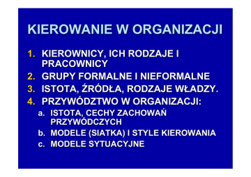 KIEROWANIE W ORGANIZACJI 1. KIEROWNICY, ICH RODZAJE I PRACOWNICY 2. GRUPY FORMALNE I NIEFORMALNE 3. ISTOTA, ŹRÓDŁA, RODZAJE WŁADZY. 4. PRZYWÓDZTWO W ORGANIZACJI: a. ISTOTA, CECHY ZACHOWAŃ PRZYWÓDCZYCH b. MODELE (SIATKA) I STYLE KIEROWANIA c. MODELE SYTUACYJNE KIEROWNICY, ICH RODZAJE I PRACOWNICY KIEROWNIK (PRZEŁOŻONY) MENEDŻER KIEROWNIK TO OSOBA ZARZĄDZAJĄCA ZASOBAMI LUDZKIMI I INNYMI ZASOBAMI ORGANIZACJI.TO OSOBA PRACUJĄCA Z LUDŹMI I POPRZEZ NICH ODDZIAŁYWUJĄCA NA REALIZACJĘ CELÓW ORGANIZACJI. PODWŁADNY TO OSOBA NIE ZAJMUJĄCA STANOWISK KIEROWNICZYCH. O ZRÓŻNICOWANYCH CECHACH OSOBOWYCH. RODZAJE KIEROWNIKÓW: SZCZEBEL I OBSZAR DZIAŁANIA GRUPY FORMALNE I NIEFORMALNE. GRUPĘ MOŻNA ZDEFINIOWAĆ JAKO DWOJE LUB WIĘCEJ OSÓB, KTÓRE WSPÓŁDZIAŁAJĄ I WZAJEMNIE NA SIEBIE ODDZIAŁYWUJA W DĄŻENIU DO OSIĄGNIĘCIA WSPÓLNEGO CELU. TRZY RODZAJE GRUP FORMALNYCH: GRUPY NAKAZOWE OBEJMUJĄCE KIEROWNIKÓW I PODWŁADNYCH KOMITETY TO STAŁE GRUPY FORMALNE REALIZUJĄCE DŁUGOOKRESOWE ZADANIA NIE POWIĄZANE WIĘZIAMI NAD I PODRZĘDNOŚCI. DORAŹNE GRUPY FORMALNE TWORZĄCE ROZWIĄZANIA DLA ZESPOŁÓW ZADANIOWYCH I Z CHWILĄ ICH ZAKOŃCZENIA ROZWIĄZYWANE. Menedżer - osoba, której podstawowym zadaniem jest organizacja procesów działania. W szczególności menadżerem jest ktoś kto planuje i podejmuje decyzje, organizuje, kieruje i kontroluje zasoby ludzkie, finansowe, rzeczowe i informacyjne. Szczeble zarządzania menadżerów można sklasyfikować w zależności od szczebla organizacji : najwyższego, średniego lub pierwszej linii Dziedziny (obszary) zarządzania menadżerów można podzielić na menadżerów marketingu finansów eksploatacji (operacji), zasobów ludzkich, administracyjnych i innych ISTOTA, ŹRÓDŁA, STRUKTURA, SPOSÓB SPRAWOWANIA WŁADZY WŁADZA TO ZDOLNOŚĆ JEDNOSTKI (GRUPY) DO ODDZIAŁYWANIA NA DOWOLNY ASPEKT DZIAŁALNOŚCI ORGANIZACJI. ŹRÓDŁA WŁADZY W OTOCZENIU I WEWNĄTRZ ORGANIZACJI – – STRUKTURA WŁADZY: AUTOKRATYCZNA, ZDECENTRALIZOWANA ROZPROSZONA; SPOSÓB SPRAWOWANIA WŁADZY: PRZYMUS, CONSENSUS, PRZETARG PRZYWÓDZTWO W ORGANIZACJI 1. ISTOTA I UWARUNKOWANIA ZACHOWAŃ PRZYWÓDCZYCH 2. MODELE STYLI KIEROWANIA-SIATKA KIEROWNICZA KRYTERIA: ORIENTACJA NA ZADANIA; 3. PRZYWÓDZTWO KIEROWNICZE TO PROCES KIEROWANIA I WPŁYWANIA NA DZIAŁALNOŚĆ CZŁONKÓW GRUPY W REALIZACH ICH ZADAŃ. ORIENRACJA NA STOSUNKI MIĘDZYLUDZKIE. SIATKA KIEROWNICZA - 5 MODELI STYLI KIEROWANIA MODELE SYTUACYJNE KIEROWANIA W CYKLU ŻYCIA ORGA NIZACJI. Model struktury władzy Źródła władzy: normy prawne normy społeczne zasoby / wiedza zawieranie / rozwiązywanie umowy o pracę nagrody / kary charyzma powstrzymywanie się od wysiłku rozpoczynanie / wstrzymywanie działań w organizacji Naczelne kierownictwo Średnie i niższe szczeble zarządzania Aspiracje Percepcja otoczenia Typ działania strategicznego Zmiana działania strategicznego Ośrodki w otoczeniu Technokracja ośrodki władzy struktura władzy autokratyczna zdecentralizow ana rozproszona Ośrodki w otoczeniu Naczelne kierownic two Średnie i niższe szczeble zarządzan ia Technokracja 1, 2 1, 2 1, 2, 3, 4 3, 4, 5, 6, 8 3, 4, 5, 6, 8 3, 4, 5, 6, 8 3, 4, 5, 8 3, 4, 5, 7, 8 3, 7 3, 7, 8 proces Przymus Consensus Przetarg wariant możliwy do zastosowania wariant możliwy do zastosowania sytuacja normalna wariant możliwy do zastosowania wariant nierealny sytuacja normalna sprawowania władzy struktura władzy Autokratyczna (przedsiębiorstwa) Procesy i struktury władzy Zdecentralizowana (przedsiębiorstwa, instytucje niedochodowe) Rozproszona (instytucje niedochodowe, przedsiębiorstwa przyszłości) sytuacja normalna sytuacja kryzysu sytuacja kryzysu Przywództwo Wyraża się w zdolności jednostki do efektywnego wpływania na postępowanie innych jednostek lub grup ludzi. Opiera się ono na łącznym wykorzystaniu władzy formalnej i nieformalnej, Przejawia się również w zdolności do motywowania podwładnych i tych osób, którymi przywódca może kierować tak, by postępowali zgodnie z jego wolą. Przywództwo wynika z zestawu cech osobowości przywódcy, z jego postawy oraz z sytuacji, w jakiej realizowany jest ten proces Jak wynika z obserwacji, wszyscy podlegamy w pewnym okresie przywództwu, a w innym okresie sami jesteśmy przywódcami. Wyróżniającą się osobą - przywódcą - można bez większego trudu zidentyfikować, wystarczy obserwować, czyja opinia jest najcenniejsza podczas kolegialnego wypracowywania decyzji, komu poświęca się więcej uwagi podczas dyskusji, kto uzyskuje szybko zgodę i poparcie ogółu, a wreszcie najważniejsze - za kim podąża grupa. John W. Gardner sformułował pięć kryteriów pozwalających odróżnić przywódców od zwykłych kierowników (menedżerów): przywódca myśli długofalowo, wybiegając daleko poza problemy bieżące i horyzont okresu sprawozdawczego (rozliczeniowego); przywódca posiada szczególne, umiejętności radzenia sobie ze sprzecznymi potrzebami zespołu; przywódca przywiązuje dużą uwagą do wizji, wartości i motywacji; przywódca nie akceptuje aktualnego stanu rzeczy, poszukuje lepszych, efektywniejszych rozwiązań; przywódca nie ogranicza się w swych zainteresowaniach do zakresu zadań zespołu, stara się nieustannie poszerzać zakres swych zainteresowań i wpływów. wysoka Styl zarządzania 1,9 troska o ludzi Styl zarządzania 9,9 Efektywność pracy jest skutkiem Dbałość o potrzeby ludzi dla zaangażowanej postawy podwładnych; „dobrych stosunków" traktowanie celów organizacji jako prowadzi do powstania w „wspólnej sprawy" prowadzi do organizacji przyjemnej stosunków nacechowanych wzajemnym przyjacielskiej atmosfery i do zaufaniem i respektem procy w dogodnym tempie Styl zarządzania 5,5 Dobra działalność organizacji jest możliwa pod warunkiem znalezienia równowagi między koniecznością egzekwowania pracy a utrzymaniem morale Styl zarządzania 1,1 Wydajność w procy zawdzięcza się takiemu zorganizow