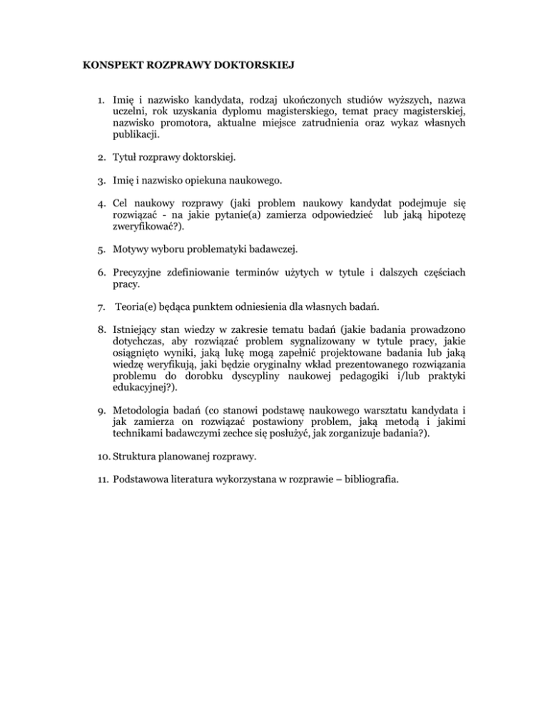 KONSPEKT ROZPRAWY DOKTORSKIEJ 1. Imię i nazwisko kandydata, rodzaj ukończonych studiów wyższych, nazwa uczelni, rok uzyskania dyplomu magisterskiego, temat pracy magisterskiej, nazwisko promotora, aktualne miejsce zatrudnienia oraz wykaz własnych publikacji. 2. Tytuł rozprawy doktorskiej. 3. Imię i nazwisko opiekuna naukowego. 4. Cel naukowy rozprawy (jaki problem naukowy kandydat podejmuje się rozwiązać - na jakie pytanie(a) zamierza odpowiedzieć lub jaką hipotezę zweryfikować?). 5. Motywy wyboru problematyki badawczej. 6. Precyzyjne zdefiniowanie terminów użytych w tytule i dalszych częściach pracy. 7. Teoria(e) będąca punktem odniesienia dla własnych badań. 8. Istniejący stan wiedzy w zakresie tematu badań (jakie badania prowadzono dotychczas, aby rozwiązać problem sygnalizowany w tytule pracy, jakie osiągnięto wyniki, jaką lukę mogą zapełnić projektowane badania lub jaką wiedzę weryfikują, jaki będzie oryginalny wkład prezentowanego rozwiązania problemu do dorobku dyscypliny naukowej pedagogiki i/lub praktyki edukacyjnej?). 9. Metodologia badań (co stanowi podstawę naukowego warsztatu kandydata i jak zamierza on rozwiązać postawiony problem, jaką metodą i jakimi technikami badawczymi zechce się posłużyć, jak zorganizuje badania?). 10. Struktura planowanej rozprawy. 11. Podstawowa literatura wykorzystana w rozprawie – bibliografia.