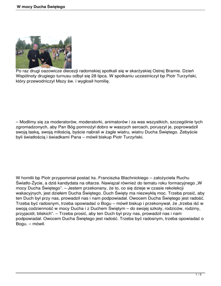 W mocy Ducha Świętego Po raz drugi oazowicze diecezji radomskiej spotkali się w skarżyskiej Ostrej Bramie. Dzień Wspólnoty drugiego turnusu odbył się 28 lipca. W spotkaniu uczestniczył bp Piotr Turzyński, który przewodniczył Mszy św. i wygłosił homilię. – Modlimy się za moderatorów, moderatorki, animatorów i za was wszystkich, szczególnie tych zgromadzonych, aby Pan Bóg pomnożył dobro w waszych sercach, poruszył je, poprowadził swoją łaską, swoją miłością, byście nabrali w żagle wiatru, wiatru Ducha Świętego. Żebyście byli światłością i świadkami Pana – mówił biskup Piotr Turzyński. W homilii bp Piotr przypomniał postać ks. Franciszka Blachnickiego – założyciela Ruchu Światło-Życie, a dziś kandydata na ołtarze. Nawiązał również do tematu roku formacyjnego „W mocy Ducha Świętego”. – Jestem przekonany, że to, co się dzieje w czasie rekolekcji wakacyjnych, jest dziełem Ducha Świętego. Duch Święty ma niezwykłą moc. Trzeba prosić, aby ten Duch był przy nas, prowadził nas i nam podpowiadał. Owocem Ducha Świętego jest radość. Trzeba być radosnym, trzeba opowiadać o Bogu – mówił biskup i przekonywał, że „trzeba iść w swoją codzienność w mocy Ducha i z Duchem Świętym – do swojej szkoły, rodziców, rodziny, przyjaciół, bliskich”. – Trzeba prosić, aby ten Duch był przy nas, prowadził nas i nam podpowiadał. Owocem Ducha Świętego jest radość. Trzeba być radosnym, trzeba opowiadać o Bogu. – mówił. 1/3 W mocy Ducha Świętego Po Eucharystii – wzorem Kościoła pierwszych wieków chrześcijaństwa – odbyła się agapa, na której również był obecny bp Piotr. Dzielił się z młodymi ludźmi chlebem, który oni wcześniej przynosili w procesji z darami. Próbował zupy pomidorowej z kluskami, wydawanej z ogromnych termosów, rozmawiał z młodzieżą. – W tym roku odwiedziłem większość oaz z naszej diecezji. Doświadczyłem pewnego entuzjazmu. Oni pięknie śpiewają, mają wiele talentów. Jest radość bycia ze sobą i to wynika z takich dobrych relacji z Panem Bogiem i relacji chrześcijańskich między sobą. Wydaje mi się, że oaza to wciąż jest dobra i atrakcyjna forma przeżywania chrześcijaństwa. Jestem pod wrażeniem tych młodych ludzi – powiedział bp Turzyński. Z oazowiczami spotkał się również ks. Jerzy Karbownik, kustosz sanktuarium skarżyskiego. – Życzę wam, żebyście powracali stąd umocnieni i ze spotkania z Bogiem, i z Matką Najświętszą, i ze spotkania z sobą – powiedział do oazowiczów. Podsumowania II turnusu rekolekcji oazowych dokonał ks. Grzegorz Lipiec, moderator diecezjalny Ruchu Światło-Życie. – Do Skarżyska przyjechali uczestnicy pięciu oaz. Na Podhalu mamy jeszcze dwie oazy – w Bańskiej i w Białym Dunajcu. W sumie jest nas tu w Skarżysku około 400 osób. Przeżywamy ten Dzień Wspólnoty pod okiem Matki Bożej Miłosierdzia. Cieszymy się tą jednością, którą zbudowaliśmy podczas rekolekcji przez wspólnotę i codzienną modlitwę, Eucharystię i wspólną zabawę, ale i rekreację. Chcemy się tą jednością cieszyć w szerszym gronie. Dlatego spotykamy się z innymi oazami, które w tym samym czasie przeżywają rekolekcje. Budowanie tej jedności to nie nasza zasługa, to dzieło Ducha Świętego i Jego mocy. Podczas tych rekolekcji doświadczamy tej mocy – powiedział ks. Lipiec. Spotkanie młodych w skarżyskim sanktuarium zakończyła Godzina Świadectwa i Odpowiedzialności. 2/3 W mocy Ducha Świętego Opracował: xsp / www.diecezja.radom.pl Zdjęcie: Krystyna Piotrowska / Gość Niedzielny 3/3