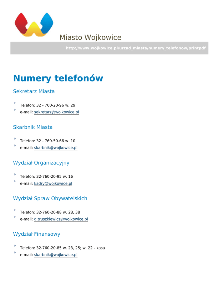 Miasto Wojkowice http://www.wojkowice.pl/urzad_miasta/numery_telefonow/printpdf Numery telefonów Sekretarz Miasta Telefon: 32 - 760-20-96 w. 29 e-mail: [email protected] Skarbnik Miasta Telefon: 32 - 769-50-66 w. 10 e-mail: [email protected] Wydział Organizacyjny Telefon: 32-760-20-95 w. 16 e-mail: [email protected] Wydział Spraw Obywatelskich Telefon: 32-760-20-88 w. 28, 38 e-mail: [email protected] Wydział Finansowy Telefon: 32-760-20-85 w. 23, 25; w. 22 - kasa e-mail: [email protected] Samodzielne Stanowiska Telefon: 32-760-20-87 w. 27 e-mail: [email protected] [email protected] Wydział Inwestycji, Ochrony Środowiska i Gospodarki Lokalami Telefon: 32-760-20-93 w. 13, 18 32-760-20-94 w. 26 e-mail: [email protected] Biuro ds. Pozyskiwania Środków Zewnętrznych, Promocji Miasta i Obsługi Inwestora Telefon: 32-760-20-86 w. 15 e-mail: [email protected] Biuro Rady Miasta Telefon: 32-760-20-89 w. 14 e-mail: [email protected] Urząd Stanu Cywilnego Telefon: 32-760-20-97 w. 17 e-mail: [email protected] Biuro Zarządzania Kryzysowego Telefon: 32-769-50-79 e-mail: [email protected] Informatyk Telefon: 32-760-20-99 w. 21 e-mail: [email protected]
