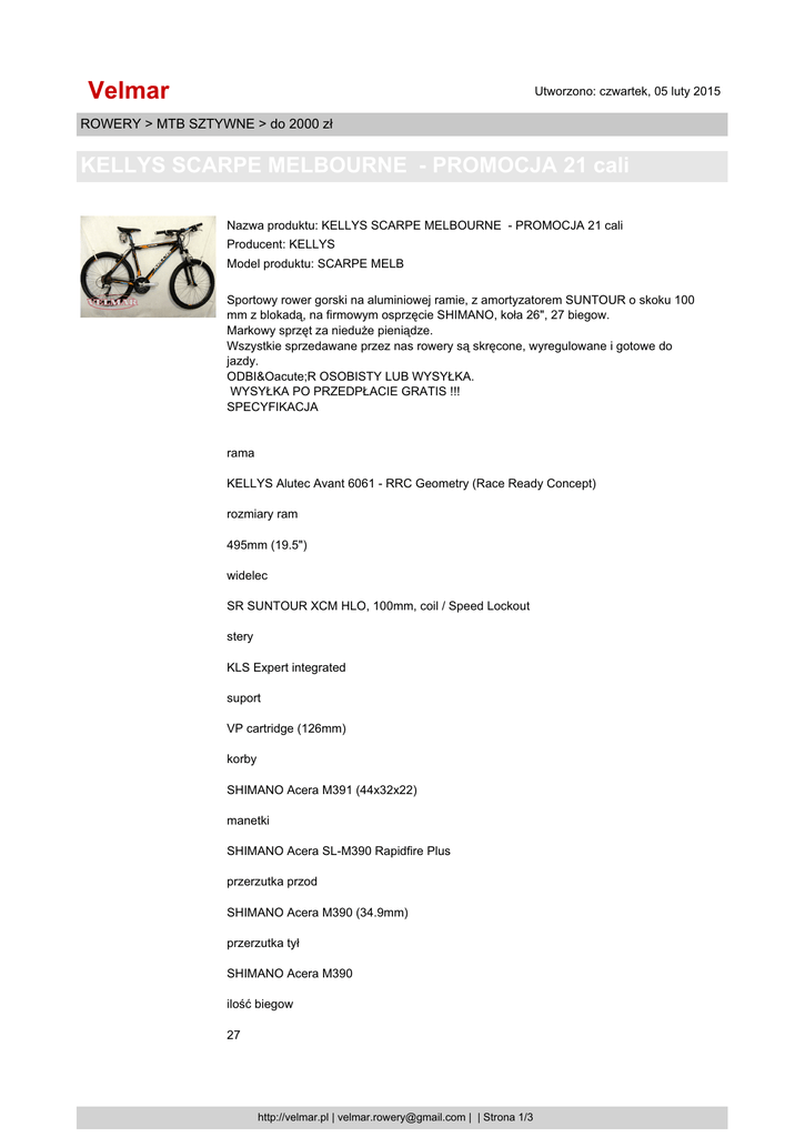 Velmar Utworzono: czwartek, 05 luty 2015 ROWERY > MTB SZTYWNE > do 2000 zł KELLYS SCARPE MELBOURNE - PROMOCJA 21 cali Nazwa produktu: KELLYS SCARPE MELBOURNE - PROMOCJA 21 cali Producent: KELLYS Model produktu: SCARPE MELB Sportowy rower gorski na aluminiowej ramie, z amortyzatorem SUNTOUR o skoku 100 mm z blokadą, na firmowym osprzęcie SHIMANO, koła 26", 27 biegow. Markowy sprzęt za nieduże pieniądze. Wszystkie sprzedawane przez nas rowery są skręcone, wyregulowane i gotowe do jazdy. ODBIÓR OSOBISTY LUB WYSYŁKA. WYSYŁKA PO PRZEDPŁACIE GRATIS !!! SPECYFIKACJA rama KELLYS Alutec Avant 6061 - RRC Geometry (Race Ready Concept) rozmiary ram 495mm (19.5") widelec SR SUNTOUR XCM HLO, 100mm, coil / Speed Lockout stery KLS Expert integrated suport VP cartridge (126mm) korby SHIMANO Acera M391 (44x32x22) manetki SHIMANO Acera SL-M390 Rapidfire Plus przerzutka przod SHIMANO Acera M390 (34.9mm) przerzutka tył SHIMANO Acera M390 ilość biegow 27 http://velmar.pl | [email protected] | | Strona 1/3 Velmar Utworzono: czwartek, 05 luty 2015 ROWERY > MTB SZTYWNE > do 2000 zł KELLYS SCARPE MELBOURNE - PROMOCJA 21 cali kaseta SHIMANO CS-HG20-9 (11-34) łańcuch KMC Z99 (108 links) hamulce TEKTRO dżwignie hamulc. TEKTRO linki hamulcowe DRIVING Force SCS (SlickCableSystem) piasty alloy / SHIMANO RM30 (32 holes) szprychy stainless steel obręcze KLS Draft 559x19 (32 holes) opony KELLYS Cobra 50-559 (26x2.0) wspornik kierownicy KLS Expert (diam 28.6mm / bar bore 31.8mm / 7°) kierownica KLS Expert RiseBar (31.8mm) chwyty KELLYS Codex 2Density sztyca KLS Expert (diam 30.9mm) siodło KLS Apex http://velmar.pl | [email protected] | | Strona 2/3 Velmar Utworzono: czwartek, 05 luty 2015 ROWERY > MTB SZTYWNE > do 2000 zł KELLYS SCARPE MELBOURNE - PROMOCJA 21 cali pedały KLS Master - alloy ___________________rozmiar 21'' (od 180cm wzrostu) Rowery objęte 24 miesięczną gwarancją producenta. Paragon lub faktura VAT. Cena: 2259.00zł Cena promocyjna: 1649.00zł Opcje dostępne dla KELLYS SCARPE MELBOURNE - PROMOCJA 21 cali : rozmiar ramy 21,5. Dostępność: Ten produkt został dodany do sklepu w dniu wtorek, 08 lipiec 2014 http://velmar.pl | [email protected] | | Strona 3/3