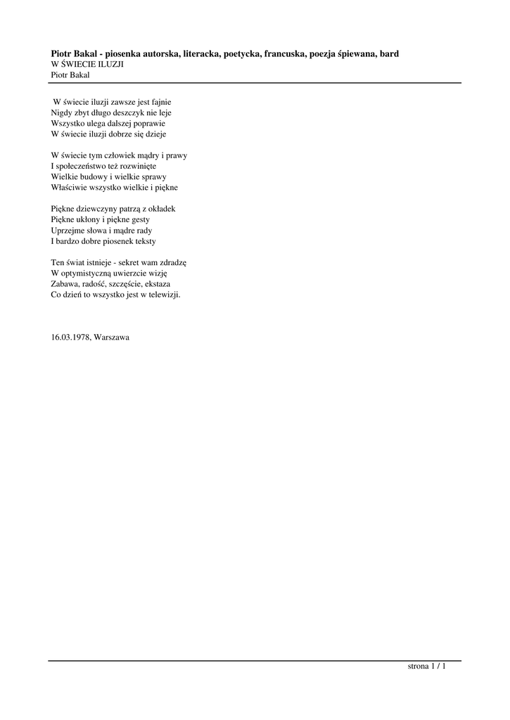 Piotr Bakal - piosenka autorska, literacka, poetycka, francuska, poezja śpiewana, bard W ŚWIECIE ILUZJI Piotr Bakal W świecie iluzji zawsze jest fajnie Nigdy zbyt długo deszczyk nie leje Wszystko ulega dalszej poprawie W świecie iluzji dobrze się dzieje W świecie tym człowiek mądry i prawy I społeczeństwo też rozwinięte Wielkie budowy i wielkie sprawy Właściwie wszystko wielkie i piękne Piękne dziewczyny patrzą z okładek Piękne ukłony i piękne gesty Uprzejme słowa i mądre rady I bardzo dobre piosenek teksty Ten świat istnieje - sekret wam zdradzę W optymistyczną uwierzcie wizję Zabawa, radość, szczęście, ekstaza Co dzień to wszystko jest w telewizji. 16.03.1978, Warszawa strona 1 / 1