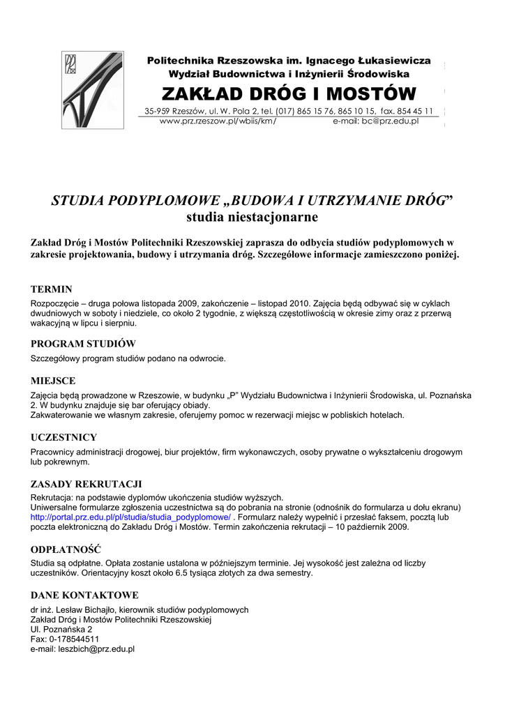 2007 – 30.11.2007 Politechnika Rzeszowska im. Ignacego Łukasiewicza Politechnika Rzeszowska im. Ignacego Łuka Wydział Budownictwa i Inżynierii Środowiska Wydział Budownictwa i Inżynierii Środow ZAKŁAD DRÓG I MOSTÓW ZAKŁAD DRÓG I MOSTÓ 35-959 Rzeszów, ul. W. Pola 2, tel. (017) 865 15 76, 865 10 15, fax. 854 45 11 www.prz.rzeszow.pl/wbiis/km/ e-mail: [email protected] STUDIA PODYPLOMOWE „BUDOWA I UTRZYMANIE DRÓG” studia niestacjonarne Zakład Dróg i Mostów Politechniki Rzeszowskiej zaprasza do odbycia studiów podyplomowych w zakresie projektowania, budowy i utrzymania dróg. Szczegółowe informacje zamieszczono poniżej. TERMIN Rozpoczęcie – druga połowa listopada 2009, zakończenie – listopad 2010. Zajęcia będą odbywać się w cyklach dwudniowych w soboty i niedziele, co około 2 tygodnie, z większą częstotliwością w okresie zimy oraz z przerwą wakacyjną w lipcu i sierpniu. PROGRAM STUDIÓW Szczegółowy program studiów podano na odwrocie. MIEJSCE Zajęcia będą prowadzone w Rzeszowie, w budynku „P” Wydziału Budownictwa i Inżynierii Środowiska, ul. Poznańska 2. W budynku znajduje się bar oferujący obiady. Zakwaterowanie we własnym zakresie, oferujemy pomoc w rezerwacji miejsc w pobliskich hotelach. UCZESTNICY Pracownicy administracji drogowej, biur projektów, firm wykonawczych, osoby prywatne o wykształceniu drogowym lub pokrewnym. ZASADY REKRUTACJI Rekrutacja: na podstawie dyplomów ukończenia studiów wyższych. Uniwersalne formularze zgłoszenia uczestnictwa są do pobrania na stronie (odnośnik do formularza u dołu ekranu) http://portal.prz.edu.pl/pl/studia/studia_podyplomowe/ . Formularz należy wypełnić i przesłać faksem, pocztą lub poczta elektroniczną do Zakładu Dróg i Mostów. Termin zakończenia rekrutacji – 10 paźdiernik 2009. ODPŁATNOŚĆ Studia są odpłatne. Opłata zostanie ustalona w późniejszym terminie. Jej wysokość jest zależna od liczby uczestników. Orientacyjny koszt około 6.5 tysiąca złotych za dwa semestry. DANE KONTAKTOWE dr inż. Lesław Bichajło, kierownik studiów podyplomowych Zakład Dróg i Mostów Politechniki Rzeszowskiej Ul. Poznańska 2 Fax: 0-178544511 e-mail: [email protected] POLITECHNIKA RZESZOWSKA, ZAKŁAD DRÓG I MOSTÓW PROGRAM STUDIÓW PODYPLOMOWYCH „BUDOWA I UTRZYMANIE DRÓG” Blok Przedmiot / forma zaliczenia / główne treści A PRZEPISY TECHNICZNO-BUDOWLANE W DROGOWNICTWIE A1 Prawo budowlane oraz inne akty prawne i przepisy techniczne obowiązujące w drogownictwie. Normalizacja europejska. Współpraca z nadzorem budowlanym B PROJEKTOWANIE DRÓG I ULIC B1 Charakterystyka dróg publicznych w Polsce (parametry techniczne, części drogi i ulicy, podstawowe definicje) B2 Projektowanie dróg i ulic (przebieg sytuacyjny, wysokościowy, widoczność, koordynacja, odwodnienie), skrzyżowania i węzły drogowe. Elementy składowe dokumentacji projektowej drogi. Uzgodnienia i pozwolenia. Specyfikacje techniczne. Nowoczesne techniki projektowania dróg. B3 Elementy inżynierii ruchu: badania i analizy ruchu, przepustowość dróg i skrzyżowań, oznakowanie, sygnalizacja świetlna, ruch pieszy i rowerowy, miejsca obsługi podróżnych, czynnik ludzki, uspokajanie ruchu. C TECHNOLOGIA ROBÓT DROGOWYCH C1 Zasady rozpoznania podłoża i szczególne zagadnienia drogowej inżynierii geotechnicznej C2 C3 Wzmacnianie podłoża, wykonawstwo wykopów, nasypów, stateczność skarp Podbudowy nawierzchni C4 Nawierzchnie asfaltowe C5 Nawierzchnie betonowe C6 Nawierzchnie żwirowe, tłuczniowe, z kostki betonowej i granitowej C7 Zapobieganie niszczeniu nawierzchni dróg, remonty i wzmacnianie nawierzchni, recykling C8 Wymiarowanie nawierzchni drogowych C9 Gesyntetyki w drogownictwie C10 Kontrola jakości robót drogowych C11 Prace utrzymaniowe w poszczególnych porach roku D ZARZĄDZANIE SIECIĄ I RUCHEM DROGOWYM D1 Techniki zarządzania drogami, ulicami, obiektami inżynierskimi, w tym ewidencje dróg, obiektów inżynierskich, oznakowania, planowanie robót utrzymaniowych E E1 DROGOWE OBIEKTY INŻYNIERSKIE Budowa i utrzymanie przepustów, tuneli i ścian oporowych F1 ZARZĄDZANIE INWESTYCJAMI DROGOWYMI WSPÓŁFINANSOWANYMI PRZEZ UNIĘ EUROPEJSKĄ Fundusze europejskie w drogownictwie. Ogólne zasady zarządzania projektami. Europejskie metody realizacji inwestycji. Standardowe warunki kontraktowe FIDIC. Warunki FIDIC a prawo polskie. Nadzór nad realizacją inwestycji drogowych.