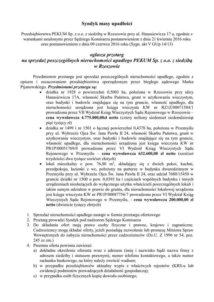 Syndyk masy upadłości Przedsiębiorstwa PEKUM Sp. z o.o. z siedzibą w Rzeszowie przy ul. Hanasiewicza 17 a, zgodnie z warunkami ustalonymi przez Sędziego Komisarza postanowieniem z dnia 21 kwietnia 2016 roku oraz postanowieniem z dnia 09 czerwca 2016 roku (Sygn. akt V GUp 14/13) ogłasza przetarg na sprzedaż poszczególnych nieruchomości upadłego PEKUM Sp. z o.o. z siedzibą w Rzeszowie Przedmiotem przetargu jest sprzedaż poszczególnych nieruchomości upadłego, zgodnie z opisem i oszacowaniem przedsiębiorstwa sporządzonym przez biegłego sądowego Marka Pijanowskiego. Przedmiotami przetargu są: działka nr 1928 o powierzchni 0,5003 ha, położona w Rzeszowie przy ulicy Hanasiewicza 17A, własność Skarbu Państwa, grunt w użytkowaniu wieczystym, oraz budynki i budowle znajdujące się na tym gruncie, własność upadłego, dla nieruchomości urządzona jest księga wieczysta KW nr RZ1Z/00071584/1 prowadzona przez VII Wydział Ksiąg Wieczystych Sądu Rejonowego w Rzeszowie – cena wywoławcza 4.775.000,00zł netto (cztery miliony siedemset siedemdziesiąt pięć tysięcy zł) działka nr 1499 i nr 1501 o łącznej powierzchni 0,4378 ha, położona w Przemyślu przy ul. Wybrzeże Ojca Św. Jana Pawła II 24, własność Skarbu Państwa, grunt w użytkowaniu wieczystym, oraz budynki i budowle znajdujące się na tym gruncie, własność upadłego, dla nieruchomości urządzona jest księga wieczysta KW nr PR1P/00051769/0 prowadzona przez VI Wydział Ksiąg Wieczystych Sądu Rejonowego w Przemyślu – cena wywoławcza 632.600,00 zł netto (sześćset trzydzieści dwa tysiące sześćset złotych) lokal mieszkalny o pow. 76,80 m2, składający się z dwóch pokoi, kuchni, przedpokoju, łazienki z wc, położony na parterze w budynku dwurodzinnym w Przemyślu przy ul. Wybrzeże Ojca Św. Jana Pawła II 24, oraz udział 7680/15450 w gruncie działki nr 1500 o pow. 0,0393 ha i częściach wspólnych budynku i innych urządzeniach niesłużących do wyłącznego użytku właścicieli poszczególnych lokali i takim samym udziałem w prawie do gruntu, dla nieruchomości lokalowej urządzona jest księga wieczysta KW nr PR1P/00087756/7 prowadzona przez VI Wydział Ksiąg Wieczystych Sądu Rejonowego w Przemyślu, - cena wywoławcza 200.000,00 zł netto (dwieście tysięcy złotych) 1. Sprzedaż nieruchomości upadłego nastąpi w formie przetargu ofertowego 2. Przetarg prowadzi Syndyk pod nadzorem Sędziego Komisarza 3. Do składania ofert mają prawo osoby fizyczne i prawne, krajowe i zagraniczne. Cudzoziemcy mogą składać oferty, jeżeli posiadają zezwolenie lub promesę Ministra Spraw Wewnętrznych do nabycia nieruchomości przez cudzoziemców (Dz.U. Z 1996 nr 54, poz. 245 ze zm.) 4. Pisemna oferta powinna zawierać: a) dokładne określenie oferenta wraz z adresem (imię i nazwisko bądź nazwa firmy z adresem siedziby i statusem prawnym), numer telefonu kontaktowego, a także numer rachunku bankowego, na który należy zwrócić wadium; b) w przypadku przedsiębiorców aktualny wypis z właściwych rejestrów (KRS-u lub ewidencji podmiotów prowadzących działalność gospodarczą); c) w przypadku osób fizycznych kopię dowodu osobistego; d) adres do korespondencji; e) oferowane ceny, które nie mogą być niższe aniżeli ceny wywoławcze, powiększone o obowiązującą stawkę podatku VAT; f) dane osób upoważnionych do reprezentowania oferenta wraz z ewentualnymi pełnomocnictwami i dokumentacją wykazującą legitymację wskazanych osób do reprezentowania oferenta ( odpis z KRS-u lub innych właściwych rejestrów, uchwałę odpowiednich organów – o ile taka jest wymagana zgodnie z zapisami ksh- że osoba (lub osoby) podpisująca ofertę jest uprawniona do zawarcia umowy sprzedaży za oferowaną cenę; g) dowód wpłaty wadium w oryginale; h) oświadczenie, że oferta nie pochodzi od Syndyka, Sędziego Komisarza, ich małżonków, zstępnych, rodzeństwa i powinowatych oraz przedstawicieli upadłego; i) zobowiązanie oferenta do pokrycia wszelkich opłat związanych z nabyciem przedmiotu przetargu; j) oświadczenie, że oferent zapoznał się ze stanem technicznym i prawnym przedmiotu niniejszego przetargu oraz warunkami sprzedaży i przyjęciu ich bez zastrzeżeń; k) w przypadku oferenta zagranicznego także promesę MSW zezwalającą na zakup nieruchomości w Polsce - o ile jest wymagana; l) oferty sporządzone w języku obcym wraz z dokumentacją powinny być przetłumaczone na język polski przez tłumacza przysięgłego. Wszystkie karty oferty powinny być zespolone w sposób zapobiegający możliwości zdekompletowania zawartości kopert. Oferta powinna być sporządzona wydrukiem komputerowym w języku polskim. Poprawki dokonane na ofercie muszą być czytelne i zrozumiałe oraz muszą być parafowane przez osobę podpisującą ofertę. 5. Każdy oferent może złożyć po jednej ofercie na każdą z poszczególnych nieruchomości. 6. Oferty niespełniające podanych powyżej wymogów nie będą rozpatrywane 7. Oferentami nie mogą być: Syndyk, Sędzia Komisarz, osoby wchodzące w skład zarządu upadłej Spółki oraz ich krewni i powinowaci 8. Oferty należy kierować, w zapieczętowanej, nieprzezroczystej kopercie o formacie nie mniejszym niż A4, umieszczonej w drugiej nieprzezroczystej kopercie, z adnotacją „Oferta przetargowa na zakup nieruchomości PEKUM Sp. z o.o. w upadłości likwidacyjnej z siedzibą w Rzeszowie (sygn. akt V GUp 14/13) - nie otwierać” na adres Sądu Rejonowego w Rzeszowie Wydział V Gospodarczy Sekcja ds. Restrukturyzacyjnych i Upadłościowych przy ul. Kustronia 4, 35-303 Rzeszów w terminie 21 dni licząc od dnia ogłoszenia o przetargu (liczy się data wpływu oferty) 9. Warunkiem uczestnictwa w przetargu na poszczególne nieruchomości jest wpłata wadium w wysokości 10% ceny wywoławczej danej nieruchomości, na rachunek bankowy PEKUM Sp. z o.o. prowadzonym w mBanku o numerze 64 1140 1094 0000 3773 6000 1001 w term