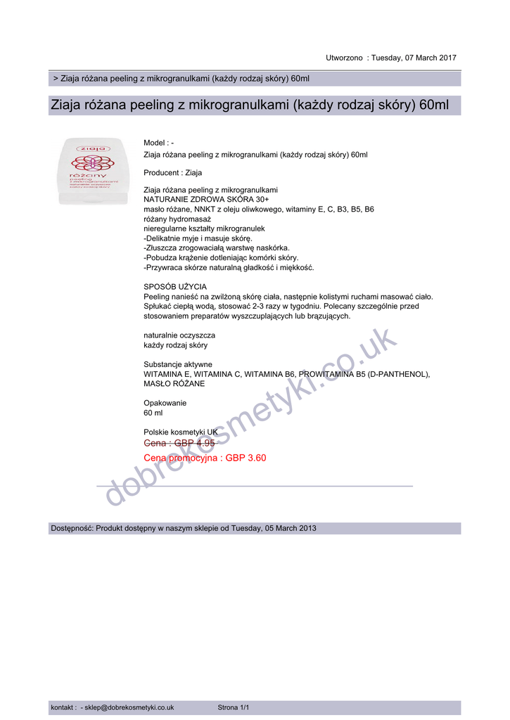 Utworzono : Tuesday, 07 March 2017 > Ziaja różana peeling z mikrogranulkami (każdy rodzaj skóry) 60ml Ziaja różana peeling z mikrogranulkami (każdy rodzaj skóry) 60ml Model : Ziaja różana peeling z mikrogranulkami (każdy rodzaj skóry) 60ml Producent : Ziaja Ziaja różana peeling z mikrogranulkami NATURANIE ZDROWA SKÓRA 30+ masło różane, NNKT z oleju oliwkowego, witaminy E, C, B3, B5, B6 różany hydromasaż nieregularne kształty mikrogranulek -Delikatnie myje i masuje skórę. -Złuszcza zrogowaciałą warstwę naskórka. -Pobudza krążenie dotleniając komórki skóry. -Przywraca skórze naturalną gładkość i miękkość. SPOSÓB UŻYCIA Peeling nanieść na zwilżoną skórę ciała, następnie kolistymi ruchami masować ciało. Spłukać ciepłą wodą, stosować 2-3 razy w tygodniu. Polecany szczególnie przed stosowaniem preparatów wyszczuplających lub brązujących. k u . o c . i k naturalnie oczyszcza każdy rodzaj skóry Substancje aktywne WITAMINA E, WITAMINA C, WITAMINA B6, PROWITAMINA B5 (D-PANTHENOL), MASŁO RÓŻANE Opakowanie 60 ml m s o y t e Polskie kosmetyki UK k e br Cena : GBP 4.95 Cena promocyjna : GBP 3.60 do Dostępność: Produkt dostępny w naszym sklepie od Tuesday, 05 March 2013 kontakt : - [email protected] Strona 1/1