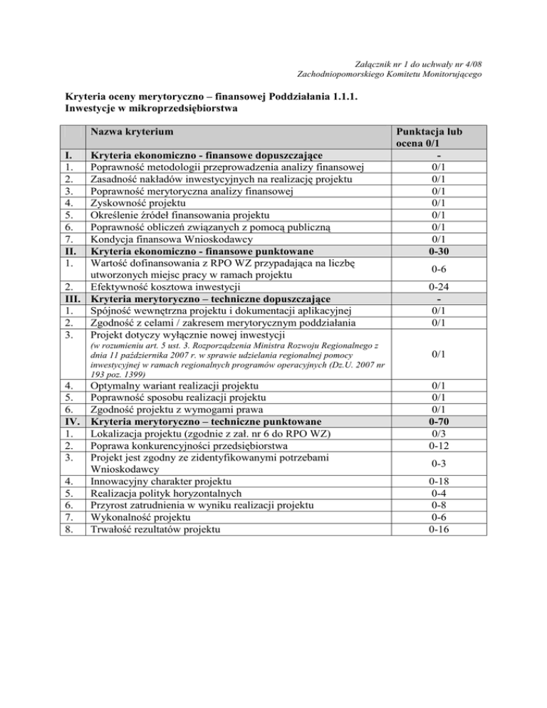 Załącznik nr 1 do uchwały nr 4/08 Zachodniopomorskiego Komitetu Monitorującego Kryteria oceny merytoryczno – finansowej Poddziałania 1.1.1. Inwestycje w mikroprzedsiębiorstwa Nazwa kryterium I. 1. 2. 3. 4. 5. 6. 7. II. 1. Kryteria ekonomiczno - finansowe dopuszczające Poprawność metodologii przeprowadzenia analizy finansowej Zasadność nakładów inwestycyjnych na realizację projektu Poprawność merytoryczna analizy finansowej Zyskowność projektu Określenie źródeł finansowania projektu Poprawność obliczeń związanych z pomocą publiczną Kondycja finansowa Wnioskodawcy Kryteria ekonomiczno - finansowe punktowane Wartość dofinansowania z RPO WZ przypadająca na liczbę utworzonych miejsc pracy w ramach projektu 2. Efektywność kosztowa inwestycji III. Kryteria merytoryczno – techniczne dopuszczające 1. Spójność wewnętrzna projektu i dokumentacji aplikacyjnej 2. Zgodność z celami / zakresem merytorycznym poddziałania 3. Projekt dotyczy wyłącznie nowej inwestycji (w rozumieniu art. 5 ust. 3. Rozporządzenia Ministra Rozwoju Regionalnego z dnia 11 października 2007 r. w sprawie udzielania regionalnej pomocy inwestycyjnej w ramach regionalnych programów operacyjnych (Dz.U. 2007 nr 193 poz. 1399) 4. 5. 6. IV. 1. 2. 3. 4. 5. 6. 7. 8. Optymalny wariant realizacji projektu Poprawność sposobu realizacji projektu Zgodność projektu z wymogami prawa Kryteria merytoryczno – techniczne punktowane Lokalizacja projektu (zgodnie z zał. nr 6 do RPO WZ) Poprawa konkurencyjności przedsiębiorstwa Projekt jest zgodny ze zidentyfikowanymi potrzebami Wnioskodawcy Innowacyjny charakter projektu Realizacja polityk horyzontalnych Przyrost zatrudnienia w wyniku realizacji projektu Wykonalność projektu Trwałość rezultatów projektu Punktacja lub ocena 0/1 0/1 0/1 0/1 0/1 0/1 0/1 0/1 0-30 0-6 0-24 0/1 0/1 0/1 0/1 0/1 0/1 0-70 0/3 0-12 0-3 0-18 0-4 0-8 0-6 0-16