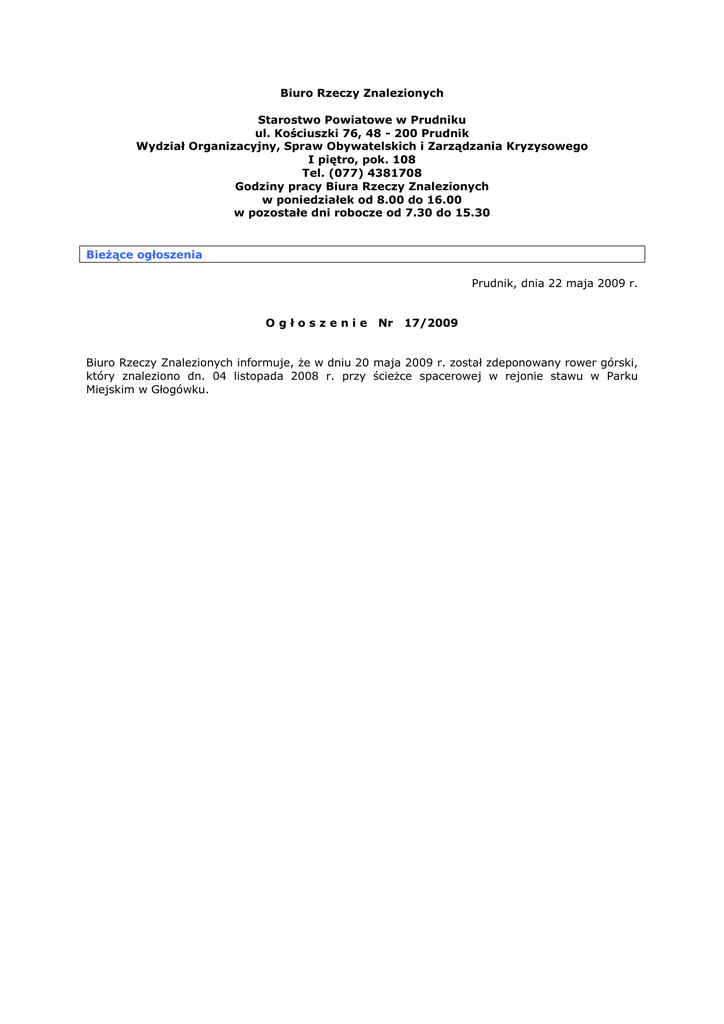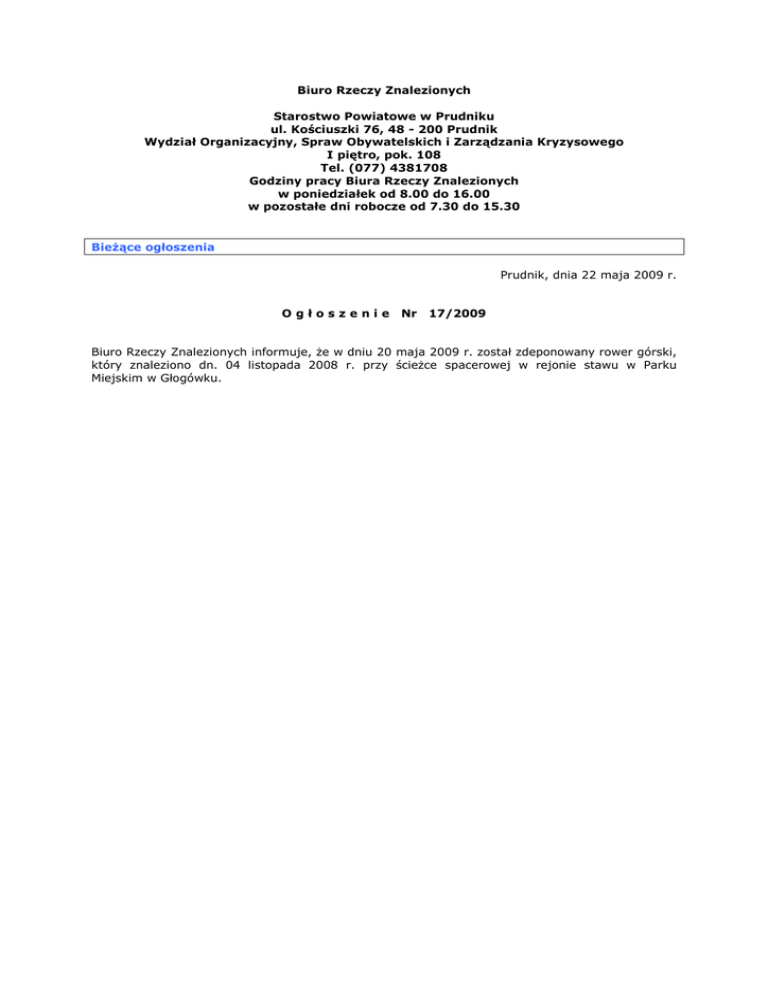Biuro Rzeczy Znalezionych Starostwo Powiatowe w Prudniku ul. Kościuszki 76, 48 - 200 Prudnik Wydział Organizacyjny, Spraw Obywatelskich i Zarządzania Kryzysowego I piętro, pok. 108 Tel. (077) 4381708 Godziny pracy Biura Rzeczy Znalezionych w poniedziałek od 8.00 do 16.00 w pozostałe dni robocze od 7.30 do 15.30 BieŜące ogłoszenia Prudnik, dnia 22 maja 2009 r. Ogłoszenie Nr 17/2009 Biuro Rzeczy Znalezionych informuje, Ŝe w dniu 20 maja 2009 r. został zdeponowany rower górski, który znaleziono dn. 04 listopada 2008 r. przy ścieŜce spacerowej w rejonie stawu w Parku Miejskim w Głogówku.