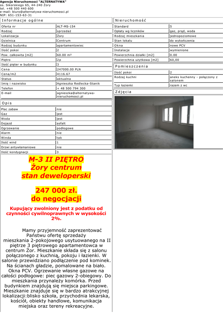 Agencja Nieruchomosci "ALTERNATYWA" os. Sikorskiego 65, 44-240 Żory tel. +48 500 440 600 e-mail: [email protected] NIP: 651-153-63-31 Informacje ogólne Nieruchomość Oferta nr ALT-MS-154 Standard 5 Rodzaj sprzedaż Opłaty wg liczników gaz, prąd, woda Lokalizacja Żory Rodzaj mieszkania jednopoziomowe Dzielnica Centrum Stan lokalu do wykończenia Rodzaj budynku apartamentowiec Okna nowe PCV Ilość pokoi 2 Instalacje wymienione Pow. całkowita [m2] 60.00 m² Powierzchnia działki [m2] 0.00 Piętro 2p Powierzchnia użytkowa [m2] 60,00 Ilość pięter w budynku 3 Cena 247000.00 PLN Cena/m2 4116.67 Status aktualna Imię i nazwisko Agnieszka Redlecka-Stanik Telefon + 48 500 794 300 E-mail [email protected] Opis Plac zabaw nie Gaz jest Woda jest Dojazd asfalt Ogrzewanie podłogowe Alarm nie Winda tak Ilość wind 1 Drzwi antywłamaniowe nie Ilość kondygnacji 3 M-3 II PIĘTRO Żory centrum stan deweloperski 247 000 zł. do negocjacji Kupujący zwolniony jest z podatku od czynności cywilnoprawnych w wysokości 2%. Mamy przyjemność zaprezentować Państwu ofertę sprzedaży mieszkania 2-pokojowego usytuowanego na II piętrze 3 piętrowego apartamentowca w centrum Żor. Mieszkanie składa się z salonu połączonego z kuchnią, pokoju i łazienki. W salonie przewidziano podłączenie pod kominek. Na ścianach gładzie, pomalowane na biało. Okna PCV. Ogrzewanie własne gazowe na całości podłogowe: piec gazowy 2-obiegowy. Do mieszkania przynależy komórka. Przed budynkiem znajdują się miejsca parkingowe. Mieszkanie znajduje się w bardzo atrakcyjnej lokalizacji:blisko szkoła, przychodnia lekarska, kościół, obiekty handlowe, komunikacja miejska oraz tereny rekreacyjne. Pomieszczenia Ilość pokoi 2 Rodzaj kuchni aneks kuchenny - połączony z salonem Typ łazienki razem z wc Zdjęcia Zapraszamy na prezentację. Zapewniamy Państwu przeprowadzenie transakcji od momentu prezentacji do chwili przekazania nieruchomości, oraz pomoc w uzyskaniu najdogodniejszego kredytu hipotecznego. Zapraszamy do odwiedzin naszej strony. www.alternatywa-nieruchomosci.pl Kontakt: Krystian Stanik tel. 500 440 600 [email protected] ( licencja zawodowa nr 21811 ) Nieruchomości "Alternatywa" Os. Sikorskiego 65 ( za sklepem meble Bodzio ) 44-240 Żory www.alternatywa-nieruchomosci.pl Agencja Nieruchomosci "ALTERNATYWA" os. Sikorskiego 65, 44-240 Żory tel. +48 500 440 600 e-mail: [email protected] NIP: 651-153-63-31