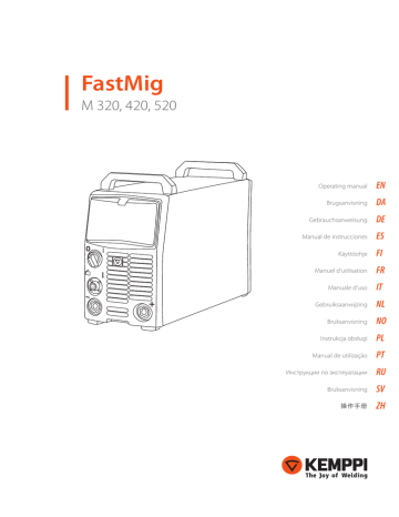FastMig M 320, 420, 520 Operating manual EN Brugsanvisning DA Gebrauchsanweisung DE Manual de instrucciones ES Käyttöohje FI Manuel d’utilisation Manuale d’uso FR IT Gebruiksaanwijzing NL Bruksanvisning NO Instrukcja obsługi PL Manual de utilização PT Инструкции по эксплуатации RU Bruksanvisning SV 操作手册 ZH INSTRUKCJA OBSŁUGI Polski SPIS TREŚCI 1.Wstęp.................................................................................................................... 3 1.1 Informacje ogólne........................... . . . . . . . . . . . . . . . . . . . . . . . . . . . . . . . . . . . . . . . . . . . . . . . . . . . . . . . . . . . . . . . . . . . . . . . . . . . . . . . . . . . . . . . . 3 1.2 Informacje o produkcie. ................ . . . . . . . . . . . . . . . . . . . . . . . . . . . . . . . . . . . . . . . . . . . . . . . . . . . . . . . . . . . . . . . . . . . . . . . . . . . . . . . . . . . . . . . . 4 1.2.1 Elementy sterujące i złącza. ..... . . . . . . . . . . . . . . . . . . . . . . . . . . . . . . . . . . . . . . . . . . . . . . . . . . . . . . . . . . . . . . . . . . . . . . . . . . . . . . . . . . . . . . . . 4 1.3Akcesoria. ........................................... . . . . . . . . . . . . . . . . . . . . . . . . . . . . . . . . . . . . . . . . . . . . . . . . . . . . . . . . . . . . . . . . . . . . . . . . . . . . . . . . . . . . . . . . 4 1.3.1 Zdalne sterowania. ................... . . . . . . . . . . . . . . . . . . . . . . . . . . . . . . . . . . . . . . . . . . . . . . . . . . . . . . . . . . . . . . . . . . . . . . . . . . . . . . . . . . . . . . . . 4 1.3.2Kable.......................................... . . . . . . . . . . . . . . . . . . . . . . . . . . . . . . . . . . . . . . . . . . . . . . . . . . . . . . . . . . . . . . . . . . . . . . . . . . . . . . . . . . . . . . . . 5 2.Montaż.................................................................................................................. 6 2.1 2.2 2.3 2.4 Lokalizacja urządzenia.. ................. . . . . . . . . . . . . . . . . . . . . . . . . . . . . . . . . . . . . . . . . . . . . . . . . . . . . . . . . . . . . . . . . . . . . . . . . . . . . . . . . . . . . . . . . 6 Sieć zasilająca.................................... . . . . . . . . . . . . . . . . . . . . . . . . . . . . . . . . . . . . . . . . . . . . . . . . . . . . . . . . . . . . . . . . . . . . . . . . . . . . . . . . . . . . . . . . 7 Podłączanie zasilania..................... . . . . . . . . . . . . . . . . . . . . . . . . . . . . . . . . . . . . . . . . . . . . . . . . . . . . . . . . . . . . . . . . . . . . . . . . . . . . . . . . . . . . . . . . 7 Kable spawalnicze i masy............. . . . . . . . . . . . . . . . . . . . . . . . . . . . . . . . . . . . . . . . . . . . . . . . . . . . . . . . . . . . . . . . . . . . . . . . . . . . . . . . . . . . . . . . . 8 3. Przełączniki i potencjometry sterujące..................................................... 8 3.1 Główny wyłącznik I/O.................... . . . . . . . . . . . . . . . . . . . . . . . . . . . . . . . . . . . . . . . . . . . . . . . . . . . . . . . . . . . . . . . . . . . . . . . . . . . . . . . . . . . . . . . . 8 3.2Kontrolki............................................. . . . . . . . . . . . . . . . . . . . . . . . . . . . . . . . . . . . . . . . . . . . . . . . . . . . . . . . . . . . . . . . . . . . . . . . . . . . . . . . . . . . . . . . . 8 3.3 Działanie wentylatora chłodzącego. . . . . . . . . . . . . . . . . . . . . . . . . . . . . . . . . . . . . . . . . . . . . . . . . . . . . . . . . . . . . . . . . . . . . . . . . . . . . . . . . 8 4. Spawanie elektrodą otuloną (MMA).......................................................... 8 5.Konserwacja....................................................................................................... 9 5.1 Codzienna konserwacja. ............... . . . . . . . . . . . . . . . . . . . . . . . . . . . . . . . . . . . . . . . . . . . . . . . . . . . . . . . . . . . . . . . . . . . . . . . . . . . . . . . . . . . . . . . . 9 5.2 Konserwacja okresowa.................. . . . . . . . . . . . . . . . . . . . . . . . . . . . . . . . . . . . . . . . . . . . . . . . . . . . . . . . . . . . . . . . . . . . . . . . . . . . . . . . . . . . . . . . . 9 5.3 Konserwacja w warsztacie serwisowym.. . . . . . . . . . . . . . . . . . . . . . . . . . . . . . . . . . . . . . . . . . . . . . . . . . . . . . . . . . . . . . . . . . . . . . . . 9 6. 7. 8. 9. Zakłócenia pracy............................................................................................. 10 Utylizacja urządzenia.................................................................................... 10 Numery do zamówienia............................................................................... 11 Dane techniczne............................................................................................. 12 PL 2 FastMig M 320, 420, 520 1. WSTĘP 1.1 Informacje ogólne Gratulujemy zakupu urządzenia spawalniczego FastMig. Produkty firmy Kemppi pozwalają zwiększyć wydajność pracy i z powodzeniem służą przez wiele lat, o ile tylko są prawidłowo używane. Niniejsza instrukcja obsługi zawiera ważne informacje o bezpiecznym użytkowaniu i konserwowaniu produktu firmy Kemppi. Dane techniczne urządzenia podano na końcu instrukcji. Przed rozpoczęciem użytkowania urządzenia należy dokładnie przeczytać instrukcję. Dla bezpieczeństwa własnego i otoczenia należy zwracać szczególną uwagę na podane zalecenia dotyczące bezpieczeństwa. Więcej informacji na temat produktów Kemppi można uzyskać od firmy Kemppi Oy lub autoryzowanego dystrybutora firmy Kemppi oraz na stronie internetowej www.kemppi.com. Dane techniczne przedstawione w tej instrukcji mogą ulec zmianie bez powiadomienia. Ważne Fragmenty instrukcji, które w celu zminimalizowania ewentualnych szkód i obrażeń wymagają szczegól
