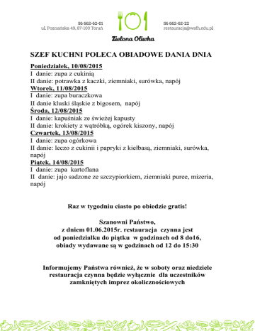 SZEF KUCHNI POLECA OBIADOWE DANIA DNIA Poniedziałek, 10/08/2015 I danie: zupa z cukinią II danie: potrawka z kaczki, ziemniaki, surówka, napój Wtorek, 11/08/2015 I danie: zupa buraczkowa II danie kluski śląskie z bigosem, napój Środa, 12/08/2015 I danie: kapuśniak ze świeżej kapusty II danie: krokiety z wątróbką, ogórek kiszony, napój Czwartek, 13/08/2015 I danie: zupa ogórkowa II danie: leczo z cukinii i papryki z kiełbasą, ziemniaki, surówka, napój Piątek, 14/08/2015 I danie: zupa kartoflana II danie: jajo sadzone ze szczypiorkiem, ziemniaki puree, mizeria, napój Raz w tygodniu ciasto po obiedzie gratis! Szanowni Państwo, z dniem 01.06.2015r. restauracja czynna jest od poniedziałku do piątku w godzinach od 8 do16, obiady wydawane są w godzinach od 12 do 15:30 Informujemy Państwa również, że w soboty oraz niedziele restauracja czynna będzie wyłącznie dla uczestników zamkniętych imprez okolicznościowych