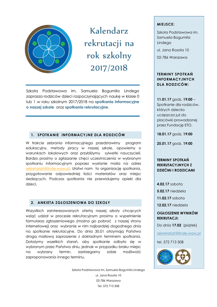 Kalendarz rekrutacji na rok szkolny 2017/2018 Szkoła Podstawowa im. Samuela Bogumiła Lindego zaprasza rodziców dzieci rozpoczynających naukę w klasie 0 lub 1 w roku szkolnym 2017/2018 na spotkania informacyjne o naszej szkole oraz spotkania rekrutacyjne. 1. SPOTKANIE INFORMACYJNE DLA RODZICÓW W trakcie zebrania informacyjnego przedstawimy program edukacyjny, metody pracy w naszej szkole, opowiemy o warunkach lokalowych oraz przybliżymy sylwetki nauczycieli. Bardzo prosimy o zgłaszanie chęci uczestniczenia w wybranym spotkaniu informacyjnym poprzez wysłanie maila na adres [email protected]. Ułatwi nam to organizację spotkania, przygotowanie odpowiedniej ilości materiałów oraz miejsc siedzących. Podczas spotkania nie przewidujemy opieki dla dzieci. MIEJSCE: Szkoła Podstawowa im. Samuela Bogumiła Lindego ul. Jana Rosoła 10 02-786 Warszawa TERMINY SPOTKAŃ INFORMACYJNYCH DLA RODZICÓW: 11.01.17 godz. 19:00 – Spotkanie dla rodziców, których dziecko uczęszcza już do placówki prowadzonej przez Fundację ETO. 18.01.17 godz. 19:00 25.01.17 godz. 19:00 TERMINY SPOTKAŃ REKRUTACYJNYCH Z DZIEĆMI I RODZICAMI 4.02.17 sobota 5.02.17 niedziela 11.02.17 sobota 2. ANKIETA ZGŁOSZENIOWA DO SZKOŁY Wszystkich zainteresowanych ofertą naszej szkoły chcących wziąć udział w procesie rekrutacyjnym prosimy o wypełnienie formularza zgłoszeniowego (można go pobrać z naszej strony internetowej) oraz wybranie w nim najbardziej dogodnego dnia na spotkanie rekrutacyjne. Do dnia 30.01 otrzymają Państwo drogą mailową zaproszenie z dokładnym terminem spotkania. Dołożymy wszelkich starań, aby spotkanie odbyło się w wybranym przez Państwa dniu, jednak w przypadku braku miejsc na wybrany termin, zastrzegamy sobie możliwość zaproponowania innego terminu. Szkoła Podstawowa im. Samuela Bogumiła Lindego ul. Jana Rosoła 10 02-786 Warszawa Tel. 572 713 508 12.02.17 niedziela OGŁOSZENIE WYNIKÓW REKRUTACJI: Do dnia 17.02 (piątek) [email protected] tel. 572 713 508 MIEJSCE: 3. SPOTKANIA REKRUTACYJNE DLA DZIECI I RODZICÓW Spotkania mają na celu jak najlepsze poznanie naszych przyszłych uczniów przez pedagogów szkolnych. W trakcie tych spotkań szczególną uwagę nauczyciele będą zwracali na poziom umiejętności społecznych dzieci oraz ich zdolność do współpracy w grupie rówieśniczej. Zajęcia dla dzieci będą odbywać się w grupach kilkunastoosobowych, trwać będą około 1,5 godziny. W trakcie trwania zajęć dla dzieci, rodziców zapraszamy na spotkanie z dyrekcją szkoły. Podczas rozmowy, będziemy starali się odpowiedzieć na pytanie, czy oczekiwania/poglądy szkoły i rodziców co do metod wychowawczych oraz programu dydaktycznego są zbieżne. Tylko zbieżność tych oczekiwań wydaje nam się gwarantem dobrej, długoletniej współpracy. Przed spotkaniem rekrutacyjnym bardzo prosimy o dostarczenie do sekretariatu szkoły kopii opinii o dziecku z placówki do której ono uczęszcza (informacja o gotowości szkolnej dziecka). 4. OGŁOSZENIE WYNIKÓW R EKRUTACJI Wyniki rekrutacji przesłane zostaną drogą mailową najpóźniej do dnia 17.02.2017 roku. Decyzja szkoły jest ostateczna. W przypadku otrzymania informacji o przyjęciu dziecka do szkoły bardzo prosimy o podpisanie umowy edukacyjnej oraz wpłacenie opłaty rekrutacyjnej w przeciągu 7 dni od jej otrzymania. Brak wpłaty oraz podpisania umowy będzie interpretowany jako rezygnacja z miejsca w naszej szkole. W przypadku otrzymania informacji o przyjęciu dziecka do szkoły na miejsce rezerwowe, prosimy o wpłatę połowy wysokości opłaty rekrutacyjnej w celu zatrzymania tego miejsca. W przypadku gdy miejsce nie zwolni się do końca sierpnia opłata ta zostanie Państwu zwrócona. Jeśli miejsce się zwolni poprosimy Państwa o dopłacenie brakującej kwoty oraz podpisanie umowy edukacyjnej. Umowa edukacyjna podpisywana jest w dwóch egzemplarzach przez oboje rodziców. W przypadku sprawowania opieki wyłącznie przez jednego z rodziców, bardzo prosimy o dostarczenie dokumentów potwierdzających tę sytuację. Szkoła Podstawowa im. Samuela Bogumiła Lindego ul. Jana Rosoła 10 02-786 Warszawa Tel. 572 713 508 Szkoła Podstawowa im. Samuela Bogumiła Lindego ul. Jana Rosoła 10 02-786 Warszawa TERMINY SPOTKAŃ INFORMACYJNYCH DLA RODZICÓW: 11.01.17 godz. 19:00 – Spotkanie dla rodziców, których dziecko uczęszcza już do placówki prowadzonej przez Fundację ETO. 18.01.17 godz. 19:00 25.01.17 godz. 19:00 TERMINY SPOTKAŃ REKRUTACYJNYCH Z DZIEĆMI I RODZICAMI 4.02.17 sobota 5.02.17 niedziela 11.02.17 sobota 12.02.17 niedziela OGŁOSZENIE WYNIKÓW REKRUTACJI: Do dnia 17.02 (piątek) [email protected] tel. 572 713 508