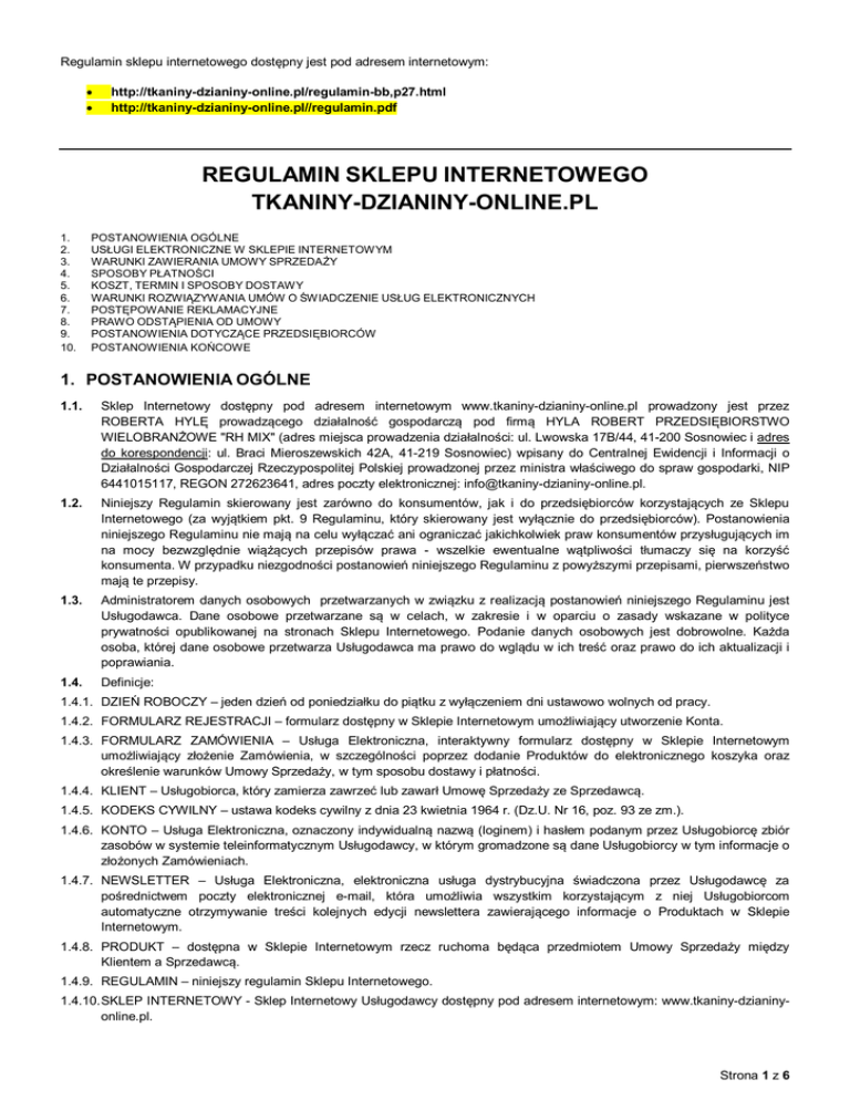 Regulamin sklepu internetowego dostępny jest pod adresem internetowym: http://tkaniny-dzianiny-online.pl/regulamin-bb,p27.html http://tkaniny-dzianiny-online.pl//regulamin.pdf REGULAMIN SKLEPU INTERNETOWEGO TKANINY-DZIANINY-ONLINE.PL 1. 2. 3. 4. 5. 6. 7. 8. 9. 10. POSTANOWIENIA OGÓLNE USŁUGI ELEKTRONICZNE W SKLEPIE INTERNETOWYM WARUNKI ZAWIERANIA UMOWY SPRZEDAŻY SPOSOBY PŁATNOŚCI KOSZT, TERMIN I SPOSOBY DOSTAWY WARUNKI ROZWIĄZYWANIA UMÓW O ŚWIADCZENIE USŁUG ELEKTRONICZNYCH POSTĘPOWANIE REKLAMACYJNE PRAWO ODSTĄPIENIA OD UMOWY POSTANOWIENIA DOTYCZĄCE PRZEDSIĘBIORCÓW POSTANOWIENIA KOŃCOWE 1. POSTANOWIENIA OGÓLNE 1.1. Sklep Internetowy dostępny pod adresem internetowym www.tkaniny-dzianiny-online.pl prowadzony jest przez ROBERTA HYLĘ prowadzącego działalność gospodarczą pod firmą HYLA ROBERT PRZEDSIĘBIORSTWO WIELOBRANŻOWE "RH MIX" (adres miejsca prowadzenia działalności: ul. Lwowska 17B/44, 41-200 Sosnowiec i adres do korespondencji: ul. Braci Mieroszewskich 42A, 41-219 Sosnowiec) wpisany do Centralnej Ewidencji i Informacji o Działalności Gospodarczej Rzeczypospolitej Polskiej prowadzonej przez ministra właściwego do spraw gospodarki, NIP 6441015117, REGON 272623641, adres poczty elektronicznej: [email protected]. 1.2. Niniejszy Regulamin skierowany jest zarówno do konsumentów, jak i do przedsiębiorców korzystających ze Sklepu Internetowego (za wyjątkiem pkt. 9 Regulaminu, który skierowany jest wyłącznie do przedsiębiorców). Postanowienia niniejszego Regulaminu nie mają na celu wyłączać ani ograniczać jakichkolwiek praw konsumentów przysługujących im na mocy bezwzględnie wiążących przepisów prawa - wszelkie ewentualne wątpliwości tłumaczy się na korzyść konsumenta. W przypadku niezgodności postanowień niniejszego Regulaminu z powyższymi przepisami, pierwszeństwo mają te przepisy. 1.3. Administratorem danych osobowych przetwarzanych w związku z realizacją postanowień niniejszego Regulaminu jest Usługodawca. Dane osobowe przetwarzane są w celach, w zakresie i w oparciu o zasady wskazane w polityce prywatności opublikowanej na stronach Sklepu Internetowego. Podanie danych osobowych jest dobrowolne. Każda osoba, której dane osobowe przetwarza Usługodawca ma prawo do wglądu w ich treść oraz prawo do ich aktualizacji i poprawiania. 1.4. Definicje: 1.4.1. DZIEŃ ROBOCZY – jeden dzień od poniedziałku do piątku z wyłączeniem dni ustawowo wolnych od pracy. 1.4.2. FORMULARZ REJESTRACJI – formularz dostępny w Sklepie Internetowym umożliwiający utworzenie Konta. 1.4.3. FORMULARZ ZAMÓWIENIA – Usługa Elektroniczna, interaktywny formularz dostępny w Sklepie Internetowym umożliwiający złożenie Zamówienia, w szczególności poprzez dodanie Produktów do elektronicznego koszyka oraz określenie warunków Umowy Sprzedaży, w tym sposobu dostawy i płatności. 1.4.4. KLIENT – Usługobiorca, który zamierza zawrzeć lub zawarł Umowę Sprzedaży ze Sprzedawcą. 1.4.5. KODEKS CYWILNY – ustawa kodeks cywilny z dnia 23 kwietnia 1964 r. (Dz.U. Nr 16, poz. 93 ze zm.). 1.4.6. KONTO – Usługa Elektroniczna, oznaczony indywidualną nazwą (loginem) i hasłem podanym przez Usługobiorcę zbiór zasobów w systemie teleinformatycznym Usługodawcy, w którym gromadzone są dane Usługobiorcy w tym informacje o złożonych Zamówieniach. 1.4.7. NEWSLETTER – Usługa Elektroniczna, elektroniczna usługa dystrybucyjna świadczona przez Usługodawcę za pośrednictwem poczty elektronicznej e-mail, która umożliwia wszystkim korzystającym z niej Usługobiorcom automatyczne otrzymywanie treści kolejnych edycji newslettera zawierającego informacje o Produktach w Sklepie Internetowym. 1.4.8. PRODUKT – dostępna w Sklepie Internetowym rzecz ruchoma będąca przedmiotem Umowy Sprzedaży między Klientem a Sprzedawcą. 1.4.9. REGULAMIN – niniejszy regulamin Sklepu Internetowego. 1.4.10. SKLEP INTERNETOWY - Sklep Internetowy Usługodawcy dostępny pod adresem internetowym: www.tkaniny-dzianinyonline.pl. Strona 1 z 6 1.4.11. SPRZEDAWCA; USŁUGODAWCA – ROBERT HYLA prowadzący działalność gospodarczą pod firmą HYLA ROBERT PRZEDSIĘBIORSTWO WIELOBRANŻOWE "RH MIX" (adres miejsca prowadzenia działalności: ul. Lwowska 17B/44, 41-200 Sosnowiec i adres do korespondencji: ul. Braci Mieroszewskich 42A, 41-219 Sosnowiec) wpisany do Centralnej Ewidencji i Informacji o Działalności Gospodarczej Rzeczypospolitej Polskiej prowadzonej przez ministra właściwego do spraw gospodarki, NIP 6441015117, REGON 272623641, adres poczty elektronicznej: [email protected]. 1.4.12. UMOWA SPRZEDAŻY – umowa sprzedaży Produktu zawierana albo zawarta między Klientem, a Sprzedawcą za pośrednictwem Sklepu Internetowego. 1.4.13. USŁUGA ELEKTRONICZNA – usługa świadczona drogą elektroniczną przez Usługodawcę na rzecz Usługobiorcy za pośrednictwem Sklepu Internetowego. 1.4.14. USŁUGOBIORCA – osoba fizyczna posiadająca pełną zdolność do czynności prawnych, a w wypadkach przewidzianych przez przepisy powszechnie obowiązujące także osoba fizyczna posiadająca ograniczoną zdolność do czynności prawnych; osoba prawna albo jednostka organizacyjna nieposiadająca osobowości prawnej, której ustawa przyznaje zdolność prawną korzystająca z Usługi Elektronicznej. 1.4.15. ZAMÓWIENIE - oświadczenie woli Klienta składane za pomocą Formularza Zamówienia i zmierzające bezpośrednio do zawarcia Umowy Sprzedaży Produktu ze Sprzedawcą. 2. USŁUGI ELEKTRONICZNE W SKLEPIE INTERNETOWYM 2.1. W Sklepie Internetowym dostępne są następujące Usługi Elektroniczne: Konto, Formularz Zamówienia oraz Newsletter. 2.1.1. Konto – korzystanie z Konta możliwe jest po spełnieniu łącznie trzech kolejnych kroków – (1) wypełnieniu Formularza Rejestracji, (2) kliknięciu pola „Zarejestruj się” oraz (3) potwierdzeniu chęci utworzenia Konta poprzez kliknięcie w link potwierdzający przesłany na podany adres poczty ele