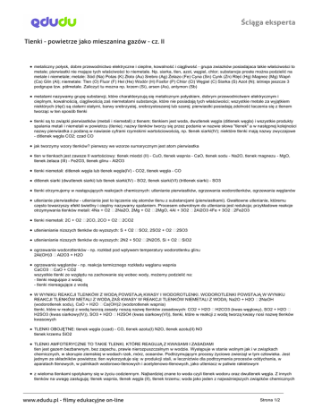 Ściąga eksperta Tlenki - powietrze jako mieszanina gazów - cz. II metaliczny połysk, dobre przewodnictwo elektryczne i cieplne, kowalność i ciągliwość - grupa zwiazków posiadajaca takie właściwości to metale; pierwiastki nie mające tych wlaściwości to niemetale. Np. siarka, tlen, azot, węgiel, chlor; substancje proste można podzielić na metale i niemetale; metale: Sód (Na) Potas (K) Złoto (Au) Srebro (Ag) Żelazo (Fe) Cyna (Sn) Cynk (Zn) Rtęć (Hg) Magnez (Mg) Wapń (Ca) Glin (Al); niemetale: Tlen (O) Fluor (F) Hel (He) Wodór (H) Fosfor (P) Chlor (Cl) Węgiel (C) Siarka (S) Azot (N); istnieje jeszcze 3 podgrupa tzw. półmetale. Zaliczyć tu mozna np. krzem (Si), arsen (As), antymon (Sb) metalami nazywamy grupę substancji, które charakteryzują się metalicznym połyskiem, dobrym przewodnictwem elektrycznym i cieplnym, kowalnością, ciągliwością zaś niemetalami substancje, które nie posiadają tych właściwości; wszystkie metale za wyjątkiem niektórych (rtęć) są ciałami stałymi, barwy srebrzystej, srebrzystoszarej lub szarej; pierwiastki posiadają zdolność łaczenia się z tlenem tworząc w ten sposób tlenki tlenki są to związki pierwiastków (metali i niemetali) z tlenem; tlenkiem jest woda, dwutlenek węgla (ditlenek węgla) i wszystkie produkty spalania metali i niemetali w powietrzu (tlenie); nazwy tlenków tworzy się przez podanie w nazwie słowa "tlenek" a w następnej kolejności nazwy pierwiastka z podaną w nawiasie cyframi rzymskimi wartościowością, np. tlenek siarki(IV); niektóre tlenki mają nazwy zwyczajowe - ditlenek węgla CO2; czad CO jak tworzymy wzory tlenków? pierwszy we wzorze sumarycznym jest atom pierwiastka tlen w tlenkach jest zawsze II wartościowy: tlenek miedzi (II) - CuO, tlenek wapnia - CaO, tlenek sodu - Na2O, tlenek magnezu - MgO, tlenek żelaza (III) - Fe2O3, tlenek glinu - Al2O3 tlenki niemetali: ditlenek węgla lub tlenek węgla(IV) - CO2, tlenek węgla - CO ditlenek siarki (dwutlenek siarki) lub tlenek siarki(IV) - SO2, tlenek siarki(VI) (tritlenek siarki) - SO3 tlenki otrzymujemy w następujących reakcjach chemicznych: utlenianie pierwiastków, ogrzewania wodorotlenków, ogrzewania węglanów utlenianie pierwiastków - utlenianie jest to łączenie się atomów tlenu z substancjami (pierwiastkami). Gwałtowne utlenianie, któremu często towarzyszy efekt świetlny i cieplny nazywamy spalaniem. Procesem odwrotnym do utleniania jest redukcja; przykładowe reakcje otrzymywania tlenków metali: 4Na + O2 2Na2O, 2Mg + O2 2MgO, 4Al + 3O2 2Al2O3 4Fe + 3O2 2Fe2O3 tlenki niemetali: 2C + O2 2CO, 2CO + O2 2CO2 utlenienianie nizszych tlenków do wyzszych: S + O2 SO2, 2SO2 + O2 2SO3 utlenienianie nizszych tlenków do wyzszych: 2N2 + 5O2 2N2O5, Si + O2 SiO2 ogrzewanie wodorotlenków - np. rozkład pod wpływem temperatury wodorotlenku glinu 2Al(OH)3 Al2O3 + H2O ogrzewanie węglanów - np. reakcja termicznego rozkładu węglanu wapnia CaCO3 CaO + CO2 wszystkie tlenki ze względu na zachowanie się wobec wody, możemy podzielić na: - tlenki reagujące z wodą - tlenki niereagujące z wodą W WYNIKU REAKCJI TLENKÓW Z WODĄ POWSTAJĄ KWASY I WODOROTLENKI. WODOROTLENKI POWSTAJĄ W WYNIKU REAKCJI TLENKÓW METALI Z WODĄ ZAŚ KWASY W REAKCJI TLENKÓW NIEMETALI Z WODĄ: Na2O + H2O 2NaOH (wodorotlenek sodu), CaO + H2O Ca(OH)2 (wodorotlenek wapnia) tlenki, które w reakcji z wodą tworzą zasady noszą nazwę tlenków zasadowych: CO2 + H2O H2CO3 (kwas węglowy), SO2 + H2O H2SO3 (kwas siarkowy(IV)), SO3 + H2O H2SO4 (kwas siarkowy(VI)), tlenki, które w reakcji z wodą tworzą kwasy nosi nazwę tlenków kwasowych TLENKI OBOJĘTNE: tlenek węgla (czad) - CO, tlenek azotu(I) N2O, tlenek azotu(II) NO tlenek krzemu SiO2 TLENKI AMFOTERYCZNE TO TAKIE TLENKI, KTÓRE REAGUJĄ Z KWASAMI I ZASADAMI tlen jest gazem bezbarwnym, bez zapachu, prawie nierozpuszczalnym w wodzie. Występuje w stanie wolnym jak i w związkach chemicznych, w skorupie ziemskiej w wodach rzek, mórz, oceanów. Podtrzymującym procesy życiowe zwierząt w tym człowieka. Jest jednym ze składników powietrza; tlen wykorzystuje się: w produkcji stali, w lecznictwie dla podtrzymania procesów oddychania, w aparatach tlenowych, w palnikach wodorowo-tlenowych i acetylenowo-tlenowych, jako utleniacz w paliwie rakietowym z wieloma tlenkami spotykamy się w życiu codziennym. Najbardziej znane to woda czyli tlenek wodoru oraz dwutlenek węgla. Z innych tlenków na uwagę zasługują: tlenek wapnia, tlenek węgla (II), tlenek krzemu; woda jako jeden z najważniejszych związków chemicznych www.edudu.pl - filmy edukacyjne on-line Strona 1/2 Ściąga eksperta została omówiona w osobnym filmiku pt. woda i roztwory wodne tlenek wapnia CaO - tlenek wapnia znany jest pod nazwą wapno palone i otrzymywany w reakcji termicznego rozkładu węglanu wapnia (skały wapiennej). Dodając do tlenku wapnia (wapna palonego) stechiometryczną ilość wody otrzymujemy produkt o nazwie wapno hydratyzowane, dostępny w sklepach z materiałami budowlanymi: CaO + H2O Ca(OH)2; reakcja ta nazywa się gaszeniem wapna palonego w trakcie niej wydziela sie ciepło; jeżeli w środowisku reakcji wystąpi nadmiar wody, wtedy otrzymuje się wapno gaszone, będące zawiesiną wodorotlenku wapnia w nadmiarze wody; mieszanina wapna gaszonego z piaskiem stanowi tradycyjną zaprawę murarską. Proces wiązania cegieł przez zaprawę polega w pierwszym etapie na wysychaniu zaprawy a w drugim na reakcji chemicznej w której zawarty w powietrzu dwutlenek węgla (CO2) przekształca Ca(OH)2 w węglan wapnia CaCO3 - Ca(OH)2 + CO2 CaCO3 + H2O; powstający węglan wapnia jest tym czynnikiem, który nadaje zaprawie twardość i jednocześnie spełnia rolę spoiwa tlenek krzemu(IV) SiO2 - jest najbardziej rozpowszechnionym związkiem chemicznym w przyrodzie i spotykanym wszędzie pod postacią piasku. Tworzy również piękne kryształy, znane pod nazwą kwarc: kryształ górski, ametyst, cytryn; niekrystaliczna 
