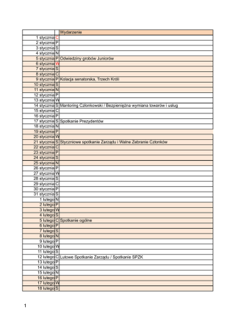 Wydarzenie 1 stycznia C z 2 stycznia P t 3 stycznia S o 4 stycznia N 5 stycznia P Odwiedziny grobów Juniorów n 6 stycznia W 7 stycznia tŚ r 8 stycznia C z Kolacja senatorska, Trzech Króli 9 stycznia P t 10 stycznia S o 11 stycznia N 12 stycznia P n 13 stycznia W 14 stycznia tŚ Mantoring Członkowski / Bezpieniężna wymiana towarów i usług r 15 stycznia C z 16 stycznia P t Spotkanie Prezydentów 17 stycznia S o 18 stycznia N 19 stycznia P n 20 stycznia W t 21 stycznia Ś Styczniowe spotkanie Zarządu i Walne Zebranie Członków r 22 stycznia C z 23 stycznia P t 24 stycznia S o 25 stycznia N 26 stycznia P n 27 stycznia W 28 stycznia tŚ r 29 stycznia C z 30 stycznia P t 31 stycznia S o 1 lutego N 2 lutego P n 3 lutego W 4 lutego tŚ r Spotkanie ogólne 5 lutego C z 6 lutego P t 7 lutego S o 8 lutego N 9 lutego P n 10 lutego W 11 lutego tŚ r Lutowe Spotkanie Zarządu / Spotkanie SPZK 12 lutego C z 13 lutego P t 14 lutego S o 15 lutego N 16 lutego P n 17 lutego W t 18 lutego Ś r 1 19 lutego C Mantoring Członkowski / Spotkanie ogólne z 20 lutego P t Szkolenie w Krakowie "Nagroda Wojtka" 21 lutego S o 22 lutego N 23 lutego P n 24 lutego W 25 lutego tŚ r 26 lutego C z 27 lutego P t 28 lutego S o 1 marca N 2 marca P n 3 marca W 4 marca tŚ r Spotkanie ogólne 5 marca C z 6 marca P t 7 marca S o 8 marca N 9 marca P n 10 marca W 11 marca tŚ Szkolenie z JCI r Marcowe spotkanie Zarządu / Spotkanie SPZK 12 marca C z 13 marca P t 14 marca S o 15 marca N 16 marca P n 17 marca W 18 marca tŚ r Mantoring Członkowski / Spotkanie ogólne 19 marca C z 20 marca P t 21 marca S o 22 marca N 23 marca P n 24 marca W 25 marca tŚ r Marcowe spotkanie Zarządu / Jajeczko JCI Wrocław 2015 26 marca C z 27 marca P t 28 marca S o 29 marca N 30 marca P n 31 marca W 1 kwietnia tŚ r 2 kwietnia C z 3 kwietnia P t 4 kwietnia S o 5 kwietnia N 6 kwietnia P n 7 kwietnia W 8 kwietnia tŚ r Spotkanie ogólne 9 kwietnia C z 2 10 kwietnia P t 11 kwietnia S o 12 kwietnia N 13 kwietnia P n 14 kwietnia W 15 kwietnia tŚ r 16 kwietnia C z 17 kwietnia P t Bal LOMowy (26-lecie JCI Wrocław) 18 kwietnia S o 19 kwietnia N 20 kwietnia P n 21 kwietnia W 22 kwietnia tŚ r Mantoring Członkowski / Kwietniowe spotkanie Zarządu / Spotkanie ogólne 23 kwietnia C z 24 kwietnia P t 25 kwietnia S o 26 kwietnia N 27 kwietnia P n 28 kwietnia W 29 kwietnia tŚ r 30 kwietnia C z 1 maja P t 2 maja S o 3 maja N 4 maja P n 5 maja W t 6 maja Ś r Spotkanie ogólne 7 maja C z Mitteldeutsche RegionalKonferenz MirKo 2015 8 maja P t Mitteldeutsche RegionalKonferenz MirKo 2015 9 maja S o 10 maja N 11 maja P n 12 maja W 13 maja tŚ r Spotkanie SPZK 14 maja C z 15 maja P t JCI Wrocław na TEDxWrocław 16 maja S o 17 maja N 18 maja P n 19 maja W 20 maja tŚ r Mantoring Członkowski / Majowe spotkanie Zarządu / Spotkanie ogólne 21 maja C z 22 maja P t 23 maja S o 24 maja N 25 maja P n 26 maja W 27 maja tŚ r Szkolenie z JCI 28 maja C z 29 maja P t 3 30 maja S TTT weekend o TTT weekend 31 maja N 1 czerwca P n 2 czerwca W 3 czerwca tŚ JCI European Conference EC2015 r JCI European Conference EC2015 4 czerwca C z JCI European Conference EC2015 5 czerwca P t JCI European Conference EC2015 6 czerwca S o Wizyta w Bursie 7 czerwca N 8 czerwca P Wizyta w Bursie n 9 czerwca W 10 czerwca tŚ r Spotkanie ogólne / Spotkanie SPZK 11 czerwca C z 12 czerwca P t 13 czerwca S o 14 czerwca N 15 czerwca P n 16 czerwca W 17 czerwca tŚ r Czerwcowe Spotkanie Zarządu 18 czerwca C z 19 czerwca P t 20 czerwca S o 21 czerwca N 22 czerwca P n 23 czerwca W 24 czerwca tŚ r Mantoring Członkowski / Spotkanie ogólne 25 czerwca C z 26 czerwca P t 27 czerwca S o 28 czerwca N 29 czerwca P n 30 czerwca W t 1 lipca Ś r Spotkanie ogólne 2 lipca C z 3 lipca P t 4 lipca S o 5 lipca N 6 lipca P n 7 lipca W 8 lipca tŚ r Spotkanie SPZK 9 lipca C z 10 lipca P t 11 lipca S o 12 lipca N 13 lipca P n 14 lipca W 15 lipca tŚ r Mantoring Członkowski / Lipcowe spotkanie Zarządu / Spotkanie Ogólne 16 lipca C z 17 lipca P t 18 lipca S o 4 19 lipca N 20 lipca P n 21 lipca W t 22 lipca Ś r Szkolenie z JCI 23 lipca C z 24 lipca P t 25 lipca S o 26 lipca N 27 lipca P n 28 lipca W 29 lipca tŚ r 30 lipca C z 31 lipca P t 1 sierpnia S o 2 sierpnia N 3 sierpnia P n 4 sierpnia W 5 sierpnia tŚ r Spotkanie ogólne 6 sierpnia C z 7 sierpnia P t 8 sierpnia S o 9 sierpnia N 10 sierpnia P n 11 sierpnia W 12 sierpnia tŚ r Spotkanie SPZK 13 sierpnia C z Odwiedziny w Hanoverze - Party at the Lke Steinhude 14 sierpnia P t Odwiedziny w Hanoverze - Party at the Lke Steinhude 15 sierpnia S o Odwiedziny w Hanoverze - Party at the Lke Steinhude 16 sierpnia N 17 sierpnia P n 18 sierpnia W 19 sierpnia tŚ r Nordic Conference / Sierpniowe spotkanie Zarządu 20 sierpnia C z Nordic Conference 21 sierpnia P t Nordic Conference 22 sierpnia S o Nordic Conference 23 sierpnia N 24 sierpnia P n 25 sierpnia W t 26 sierpnia Ś r 27 sierpnia C z 28 sierpnia P t 29 sierpnia S o 30 sierpnia N 31 sierpnia P Akedemia Europejska n Akedemia Europejska 1 września W 2 września tŚ Akedemia Europejska r Akedemia Europejska / Spotkanie ogólne 3 września C z Akedemia Europejska 4 września P t 5 września S o 6 września N 5 7 września P n 8 września W 9 września tŚ r Wrześniowe spotkanie Zarządu / Spotkanie SPZK 10 września C z 11 września P t 12 września S o 13 września N 14 września P n 15 września W t 16 września Ś r Mantoring Członkowski / Spotkanie ogólne 17 września C z 18 września P t 19 września S o 20 września N 21 września P n 22 września W 23 września tŚ r Szkolenie z JCI 24 września C z 25 września P t 26 września S o 27 września N 28 września P n 29 września W 30 września tŚ r Spotkanie ogólne 1 października C z JCI Czech Republic - Czeko 5th National Convention 2 października P t 3 października S JCI Czech Republic - Czeko 5th National Convention o 4 października N 5 października P n 6 października W 7 października tŚ r Spotkanie SPZK 8 października C z 9 październik