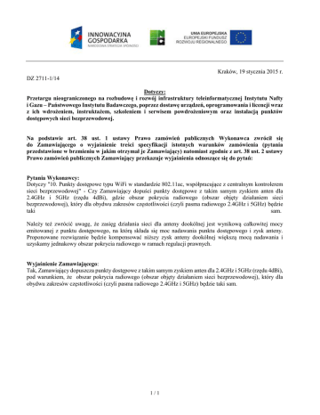 Kraków, 19 stycznia 2015 r. DZ 2711-1/14 Dotyczy: Przetargu nieograniczonego na rozbudowę i rozwój infrastruktury teleinformatycznej Instytutu Nafty i Gazu – Państwowego Instytutu Badawczego, poprzez dostawę urządzeń, oprogramowania i licencji wraz z ich wdrożeniem, instruktażem, szkoleniem i serwisem powdrożeniowym oraz instalacją punktów dostępowych sieci bezprzewodowej. Na podstawie art. 38 ust. 1 ustawy Prawo zamówień publicznych Wykonawca zwrócił się do Zamawiającego o wyjaśnienie treści specyfikacji istotnych warunków zamówienia (pytania przedstawione w brzmieniu w jakim otrzymał je Zamawiający) natomiast zgodnie z art. 38 ust. 2 ustawy Prawo zamówień publicznych Zamawiający przekazuje wyjaśnienia odnoszące się do pytań: Pytania Wykonawcy: Dotyczy "10. Punkty dostępowe typu WiFi w standardzie 802.11ac, współpracujące z centralnym kontrolerem sieci bezprzewodowej" - Czy Zamawiający dopuści punkty dostępowe z takim samym zyskiem anten dla 2.4GHz i 5GHz (rzędu 4dBi), gdzie obszar pokrycia radiowego (obszar objęty działaniem sieci bezprzewodowej), który dla obydwu zakresów częstotliwości (czyli pasma radiowego 2.4GHz i 5GHz) będzie taki sam. Należy też zwrócić uwagę, że zasięg działania sieci dla anteny dookólnej jest wynikową całkowitej mocy emitowanej z punktu dostępowego, na którą składa się moc nadawania punktu dostępowego i zysk anteny. Proponowane rozwiązanie będzie kompensować niższy zysk anteny dookólnej większą mocą nadawania i uzyskamy jednakowy obszar pokrycia radiowego w ramach regulacji prawnych. Wyjaśnienie Zamawiającego: Tak, Zamawiający dopuszcza punkty dostępowe z takim samym zyskiem anten dla 2.4GHz i 5GHz (rzędu 4dBi), pod warunkiem, że obszar pokrycia radiowego (obszar objęty działaniem sieci bezprzewodowej), który dla obydwu zakresów częstotliwości (czyli pasma radiowego 2.4GHz i 5GHz) będzie taki sam. 1/1