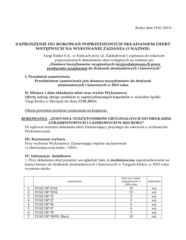 Kielce dnia 19.01.2015r. ZAPROSZENIE DO ROKOWAŃ POPRZEDZONYCH SKŁADANIEM OFERT WSTĘPNYCH NA WYKONANIE ZADANIA O NAZWIE: Targi Kielce S.A. w Kielcach przy ul. Zakładowej 1 zaprasza do rokowań poprzedzonych składaniem ofert wstępnych na zadanie pn. „Dostawa tuszy/tonerów oryginalnych (wyprodukowanych przez producenta urządzenia) do drukarek atramentowych i laserowych” I. Przedmiot zamówienia Przedmiotem zamówienia jest dostawa tuszy/tonerów do drukarek atramentowych i laserowych w 2015 roku. II. Miejsce i data składania ofert oraz wybór Wykonawcy Oferty należy złożyć osobiście w zapieczętowanych kopertach w siedzibie Spółki Targi Kielce w Recepcji do dnia 27.01.2015r. Oferta powinna zawierać oznaczenie na kopercie: ROKOWANIA „DOSTAWA TUSZY/TONERÓW ORYGINALNYCH DO DRUKAREK ATRAMENTOWYCH I LASEROWYCH W 2015 ROKU” Po upływie terminu składania ofert Zamawiający przystąpi do rokowań z wybranymi Wykonawcami. III. Kryterium wyboru Przy wyborze Wykonawcy Zamawiający będzie się kierował: 1) oferowaną ceną netto – 100%. IV. Informacje dodatkowe 1. Przy składaniu ofert prosimy uwzględnić fakt, iż średnioroczne zapotrzebowanie na tusze/tonery do drukarek atramentowych i laserowych w Targach Kielce, w 2015 roku wyniesie około: asortyment 1. 2. 3. 4. 4. 5. 6. 7. TUSZ HP 21XL TUSZ HP 22XL TUSZ HP 15 TUSZ HP 27 TUSZ HP 56 TUSZ HP 57 TUSZ HP 78 TUSZ HP 300XL Black ilość szt./opak. zakupionych w 2014 roku jednostka 19 15 2 2 6 4 3 10 szt. szt. szt. szt. szt. szt. szt. szt. 8. TUSZ HP 300XL Color 5 szt. 9. 10. 11. 12. 13. 14. 15. 16. 17. 18. 19. 20. 21. 22. 23. 24. TUSZ HP 343 TUSZ HP 344 TUSZ HP 338 TUSZ HP 339 TUSZ HP 650 Black TUSZ HP 650 Color TUSZ HP 901 Black TUSZ HP 901 Color TUSZ HP 920XL Black TUSZ HP 920XL Cyan TUSZ HP 920XL Magenta TUSZ HP 920XL Yellow TONER TN 321K Black (Konica Minolta C224e) TONER TN 321Y Yellow (Konica Minolta C224e) TONER TN 321C Cyan (Konica Minolta C224e) TONER TN 321M Magenta (Konica Minolta C224e) 19 2 33 5 29 17 6 6 21 21 21 20 8 8 8 8 szt. szt. szt. szt. szt. szt. szt. szt. szt. szt. szt. szt. szt. szt. szt. szt. 2. Złożenie oferty oznacza akceptację warunków niniejszego zaproszenia do udziału w rokowaniach. 3. Zamawiający informuje, że nie będzie ponosił żadnych kosztów związanych z przygotowaniem oferty przez Wykonawcę. 4. Zamawiający zastrzega sobie prawo swobodnego wyboru Wykonawcy, jak również nie wybrania żadnego Wykonawcy bez podania przyczyn. 5. Wykonawca jest związany ofertą przez 60 dni, licząc od daty złożenia oferty. V. Zawartość oferty Oferta pisemna złożona Zamawiającemu powinna składać się z dwóch części: Część I - " Dokumenty formalno-prawne" - winna zawierać: 1.Nazwę i siedzibę Wykonawcy oraz datę sporządzenia oferty. 2.Oświadczenie Wykonawcy, że zapoznał się z warunkami niniejszego zaproszenia i nie wnosi do nich zastrzeżeń. W przypadku wniesienia uwag i zastrzeżeń Wykonawca zobowiązany jest do umieszczenia ich w odrębnej części oferty cenowej. 3.Oświadczenie Wykonawcy czy jest podatnikiem VAT o treści: „Wykonawca oświadcza, że jest płatnikiem podatku VAT i jego pełna nazwa brzmi: .................................. Nr NIP: ............................... . Część II - " Oferta cenowa - winna zawierać: W ofercie należy podać cenę netto, ewentualny opust cenowy, termin i formę płatności, warunki i termin dostawy, informację dotyczącą okresu ważności złożonej oferty. UWAGA: Wszystkie strony oferty ( część I i II) powinny być ponumerowane i podpisane przez osoby upoważnione do składania oświadczenia woli w imieniu oferenta. Wszelkie informacje w sprawie przedmiotu zapytania ofertowego w pok. nr 8 budynek administracyjny Targów Kielce, codziennie w godz.: 8.00-15.00 Kontakt: Anna Górska Zespół Kadr i Administracji [email protected] tel. 041/3651259 tel.kom. 797339404 fax: 041/3651356 Załączniki: l. Szczegółowy opis przedmiotu zamówienia. Załącznik nr 1. Wymagany asortyment obejmuje*: Lp. 1. 2. 3. 4. 5. 6. 7. 8. 9. 10. 11. 12. 13. 14. 15. 16. 17. 18. 19. 20. 21. 22. 23. 24. 25. 26. 27. 28. 29. 30. 31. ASORTYMENT TUSZ HP 21XL TUSZ HP 22XL TUSZ HP 15 TUSZ HP 27 TUSZ HP 56 TUSZ HP 57 TUSZ HP 78 TUSZ HP 300XL Color TUSZ HP 350XL TUSZ HP 343 TUSZ HP 344 TUSZ HP 338 TUSZ HP 339 TUSZ 650 Black TUSZ 650 Color TUSZ 901 Black TUSZ 901 Color TUSZ HP 920XL Black TUSZ HP 920XL Cyjan TUSZ HP 920XL Magenta TUSZ HP 920XL Yellow TONER TN 321K Black (Konica Minolta C224e) TONER TN 321Y Yellow (Konica Minolta C224e) TONER TN 321C Cyan (Konica Minolta C224e) TONER TN 321M Magenta (Konica Minolta C224e) TONER HP LJ 12A TONER HP LJ 15A TONER HP LJ 35A TONER HP LJ 36A TONER HP LJ 78A TONER HP LJ 125A HP C9361CE HP C9352CE HP C6615de HP C8727ae HP C6656a HP C6657a HP C6578de HP CC644ee HP CB336ee HP C8766ee HP C9363ee HP C8765ee HP C8767ee HP CZ101ae HP CZ102ae HP CC653ae HP CC656ae HP CD975a HP CD972a HP CD973a HP CD974a A33K150 A33K250 A33K450 A33K350 Q2612A C7115A CB435A CB436AD CE278A CB541A POJEMNOŚĆ WYDAJNOŚĆ 12ml 11ml 25ml 10ml 19ml 17ml 19ml 11ml 25ml 7ml 14ml 11ml 21ml 6,5ml 5ml 4ml 9ml 1200 str. 700 str. 700 str. 700 str. 2000 str. 2500 str. 1500 str. 4000 str. 2100 str. 1400 str. * dla ułatwienia procedury przetargowej uprzejmie prosimy o podanie oferty cenowej wg powyższego wzoru CENA NETTO za 1 sztukę za 1 sztukę za 1 sztukę za 1 sztukę za 1 sztukę za 1 sztukę za 1 sztukę za 1 sztukę za 1 sztukę za 1 sztukę za 1 sztukę za 1 sztukę za 1 sztukę za 1 sztukę za 1 sztukę za 1 sztukę za 1 sztukę za 1 sztukę za 1 sztukę za 1 sztukę za 1 sztukę za 1 sztukę za 1 sztukę za 1 sztukę za 1 sztukę za 1 sztukę za 1 sztukę za 1 sztukę za 1 sztukę za 1 sztukę za 1 sztukę